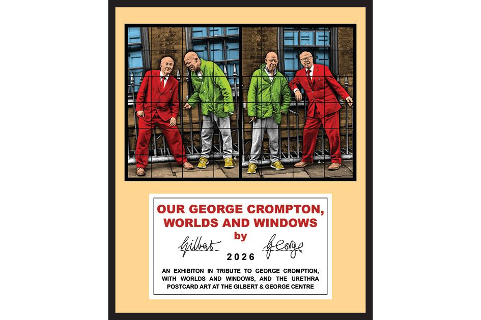 The fourth exhibition at The Gilbert & George Centre, London will be ‘Our George Crompton, WORLDS and WINDOWS by Gilbert & George’ – a moving tribute to their friend, George Crompton, with works from ‘THE NEW NORMAL PICTURES’, exhibited alongside a selection of postcard art from ‘WORLDS and WINDOWS’, and ‘THE URETHRA POSTCARD ART’.