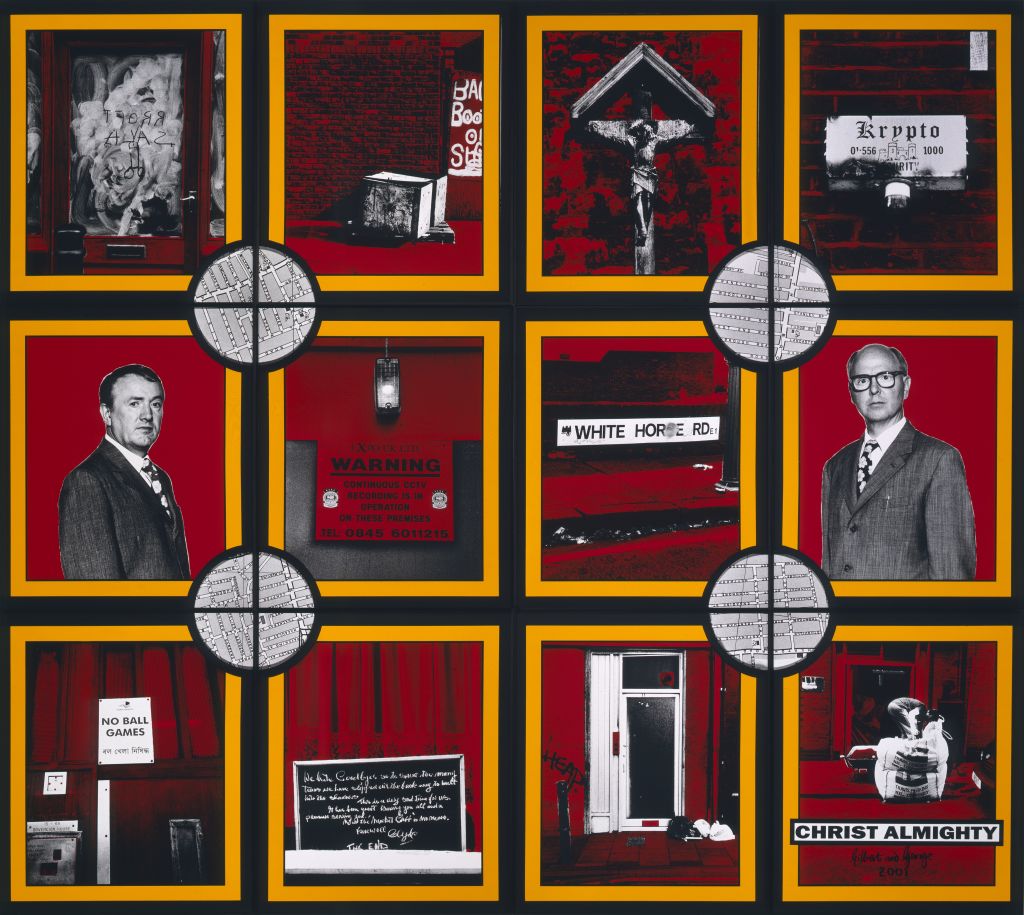 The third exhibition to take place at The Gilbert & George Centre, DEATH HOPE LIFE FEAR…, is an exhibition of 18 pictures made by Gilbert & George between 1984 and 1998, an astonishingly prolific period for the artists. The exhibition presents a rare opportunity for viewers by bringing together works from a period in which the art of Gilbert & George forged further and deeper into a phantasmagorical and visionary landscape.