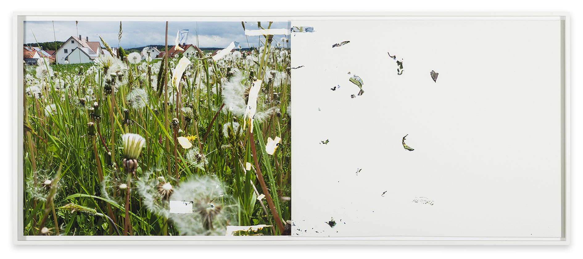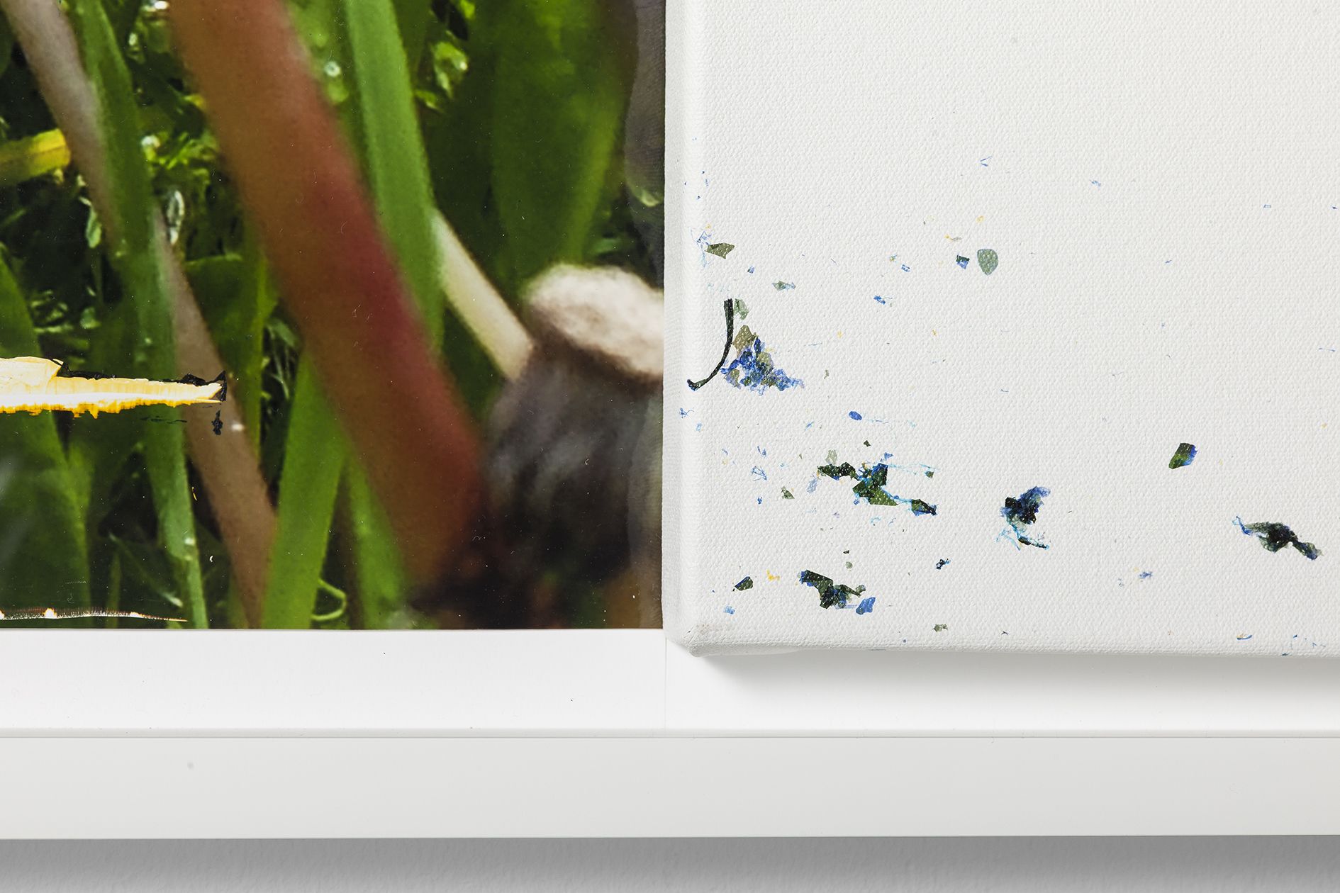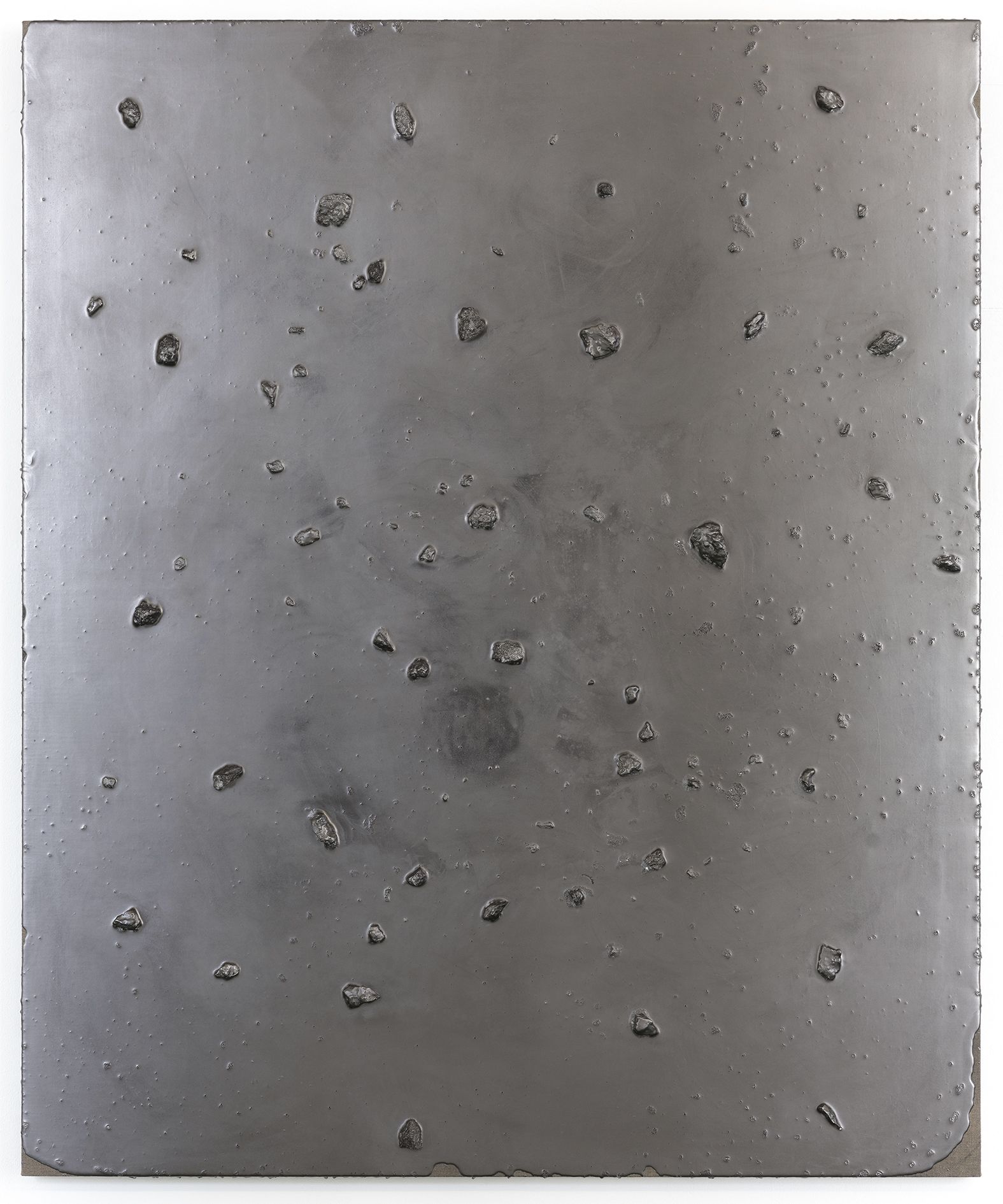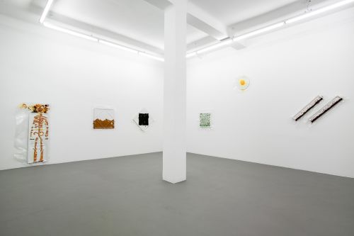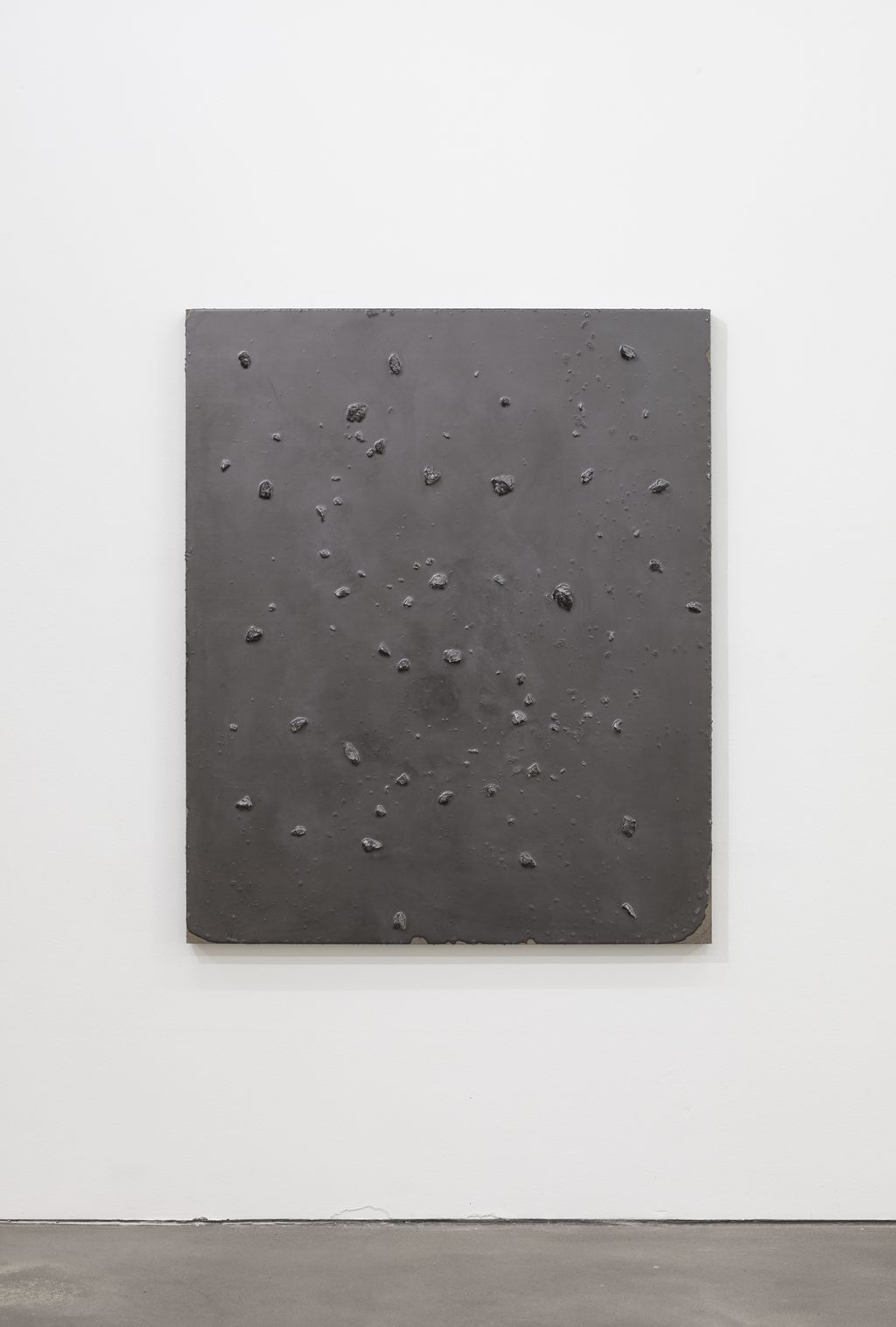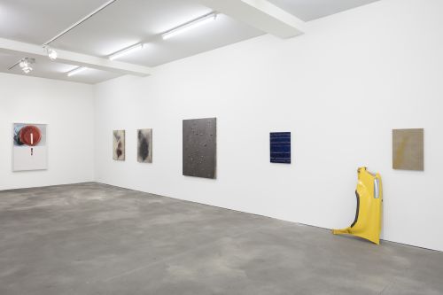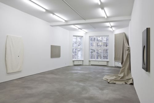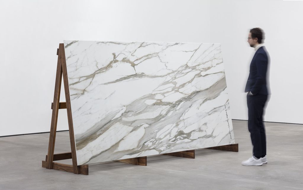As complex as her approach may be, the imagery she employs often relates to everyday domestic objects and architectures. Using a casting technique she developed in 2011, Saban created three-dimensional sculptures of towels, trash bags and bed sheets out of flexible acrylic paint, which she then draped over canvases in a performative, literal rendition of “acrylic on canvas.” In other series, the artist affixes slabs of stone, glass and concrete to linen supports, recalling the shape of sinks and the foundations of houses. The simplicity of these references belies the intricate constellation of issues that Saban offers her viewers. One must consider, for example, why a cast dishtowel—stripped of its use-value when made of paint—attains a different, ineffable value as a work of art once placed in an artistic context.