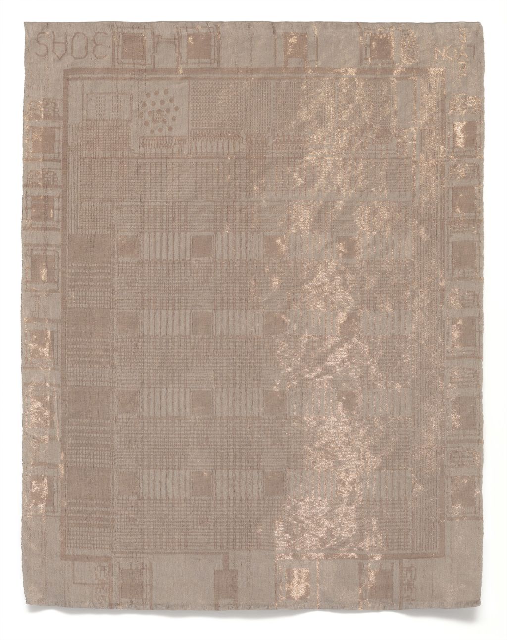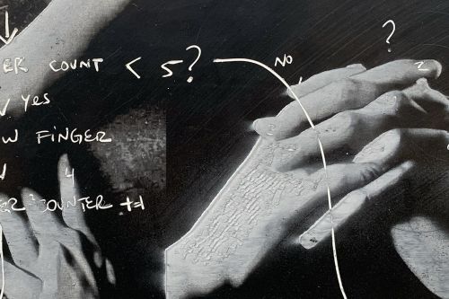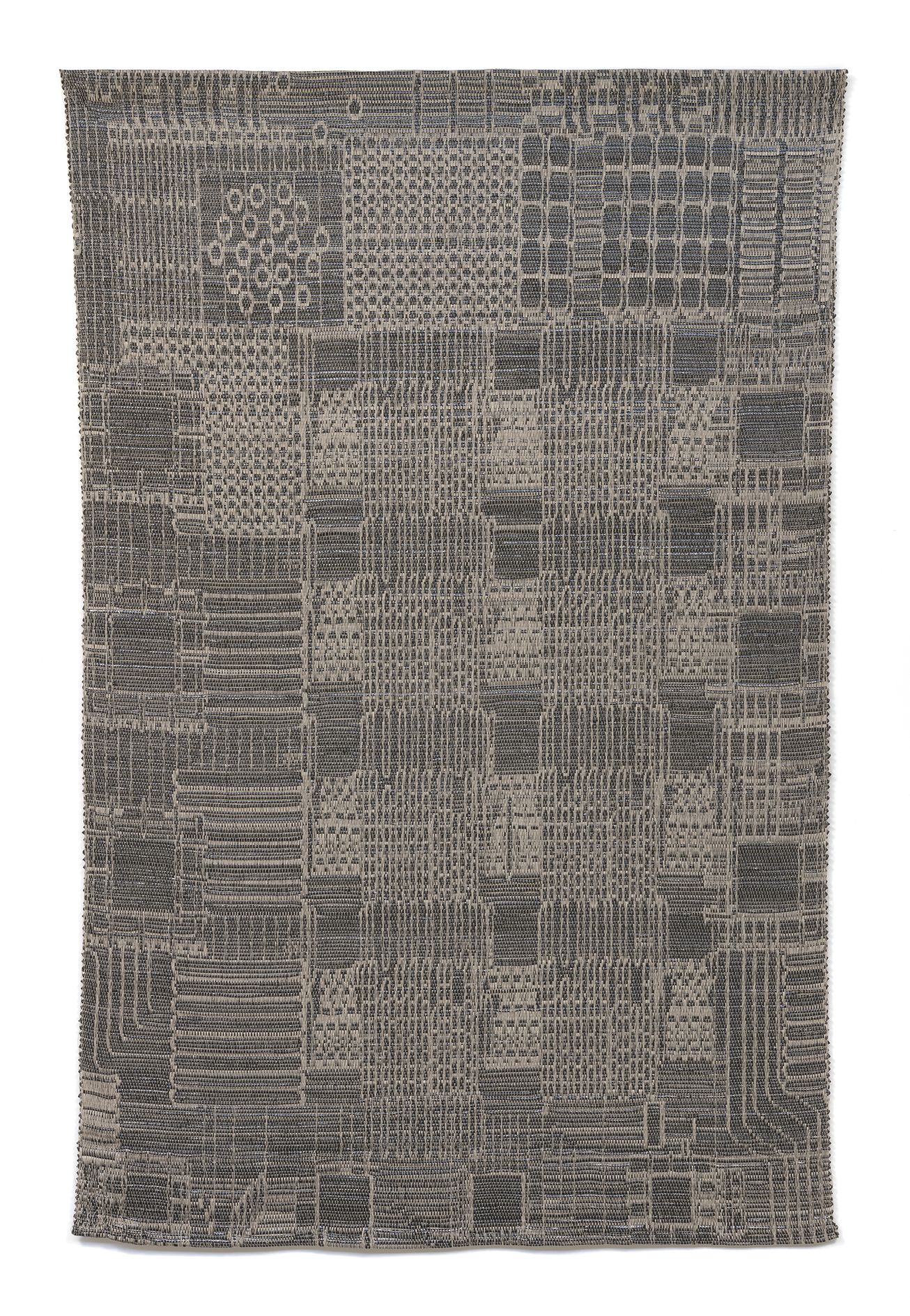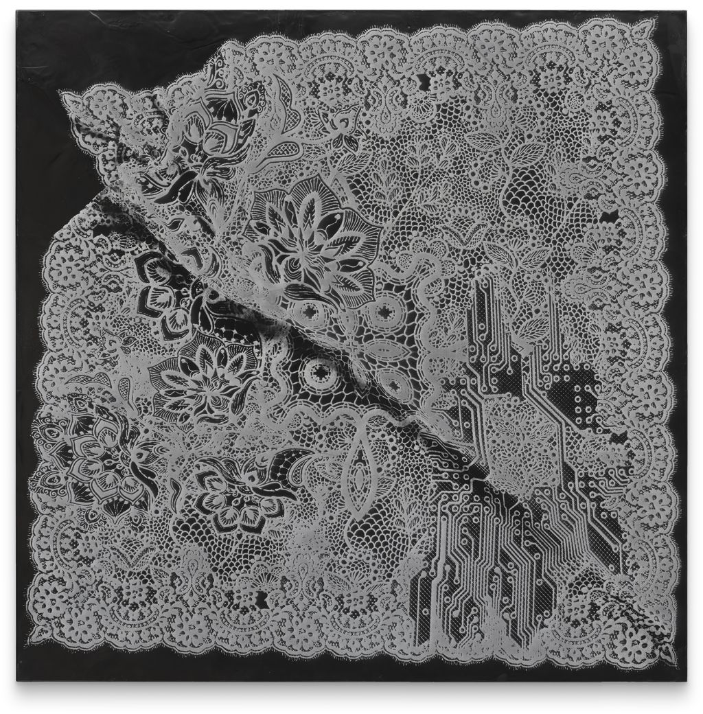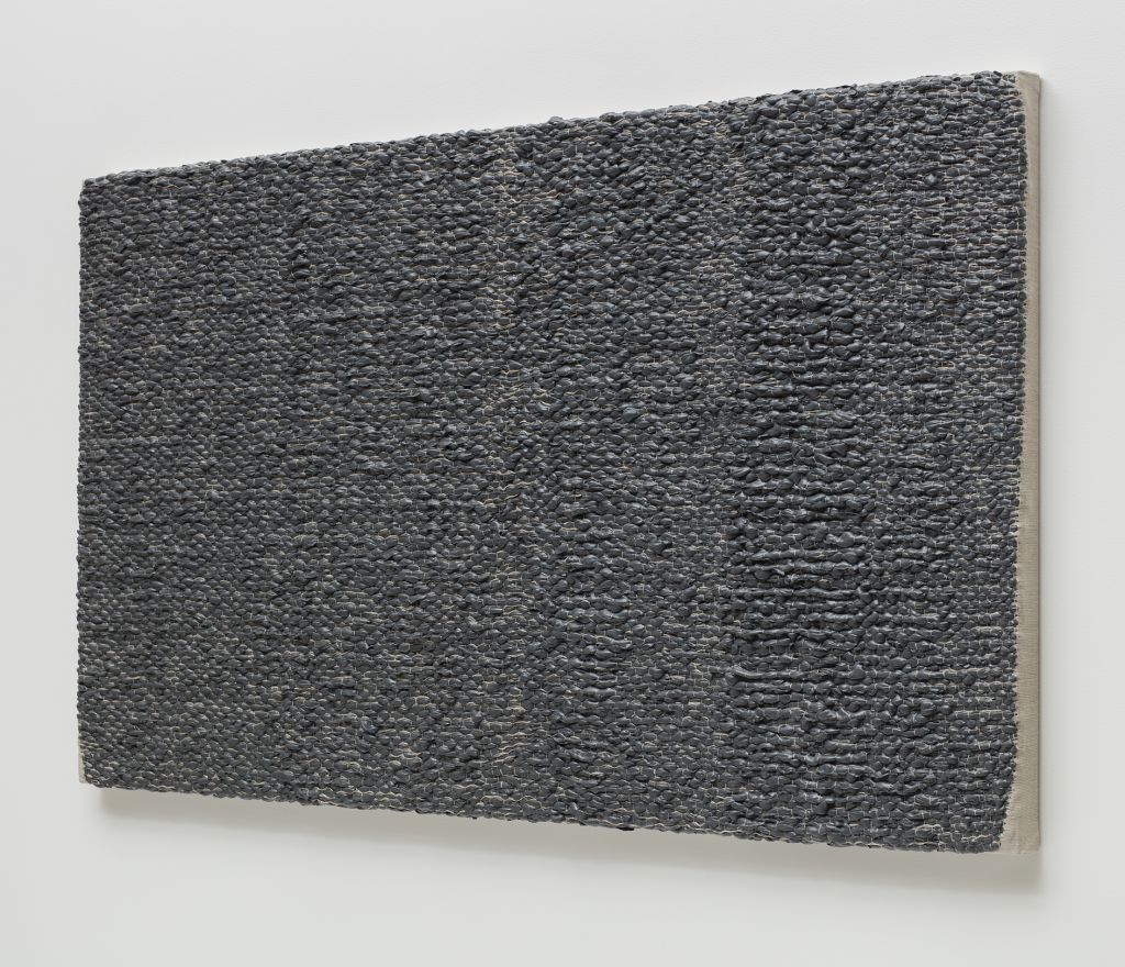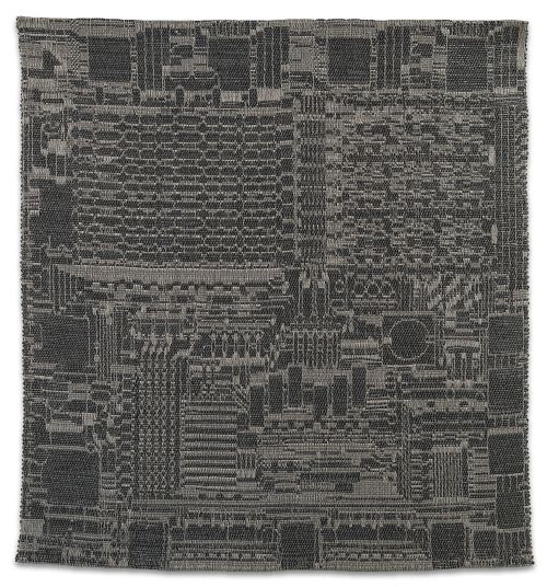 In 2016 the artist acquired a loom, interested originally in its distinct form rather than its function. Yet Saban soon set to work reimagining once more how paintings are made: rather than applying paint to canvas, she creates swollen “threads” of dried acrylic paint that are methodically woven together with linen to produce works in which paint and canvas are literally entwined. Certain of her woven canvases are purely abstract compositions, engaging with the history of minimalist painting; while others suggest doorways and windows, or even digital gradient imaging functions native to Photoshop. Saban’s discovery that the history of weaving and computer technology are inextricably linked has led to increasingly complex tapestries and ink-and-paper works based on the designs of historical circuit boards; and actual circuit boards themselves have become recent material for Saban’s ever-evolving practice, which continues to tackle fundamental questions about art and its meaning within contemporary society.