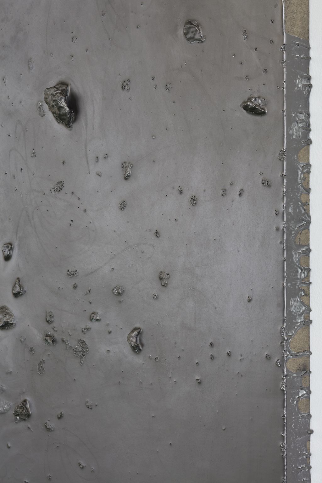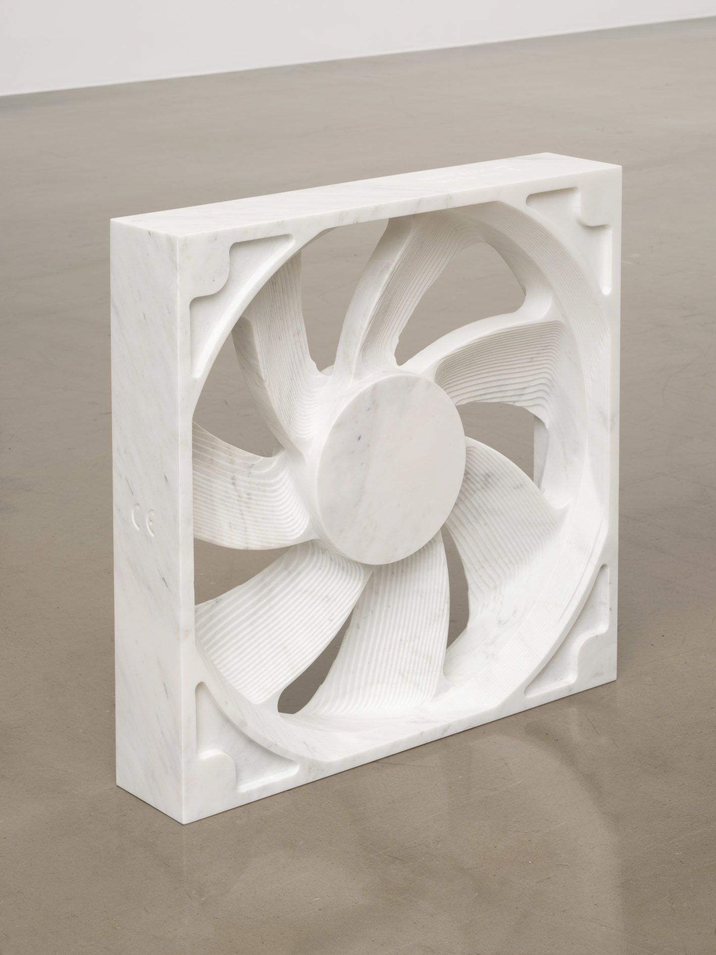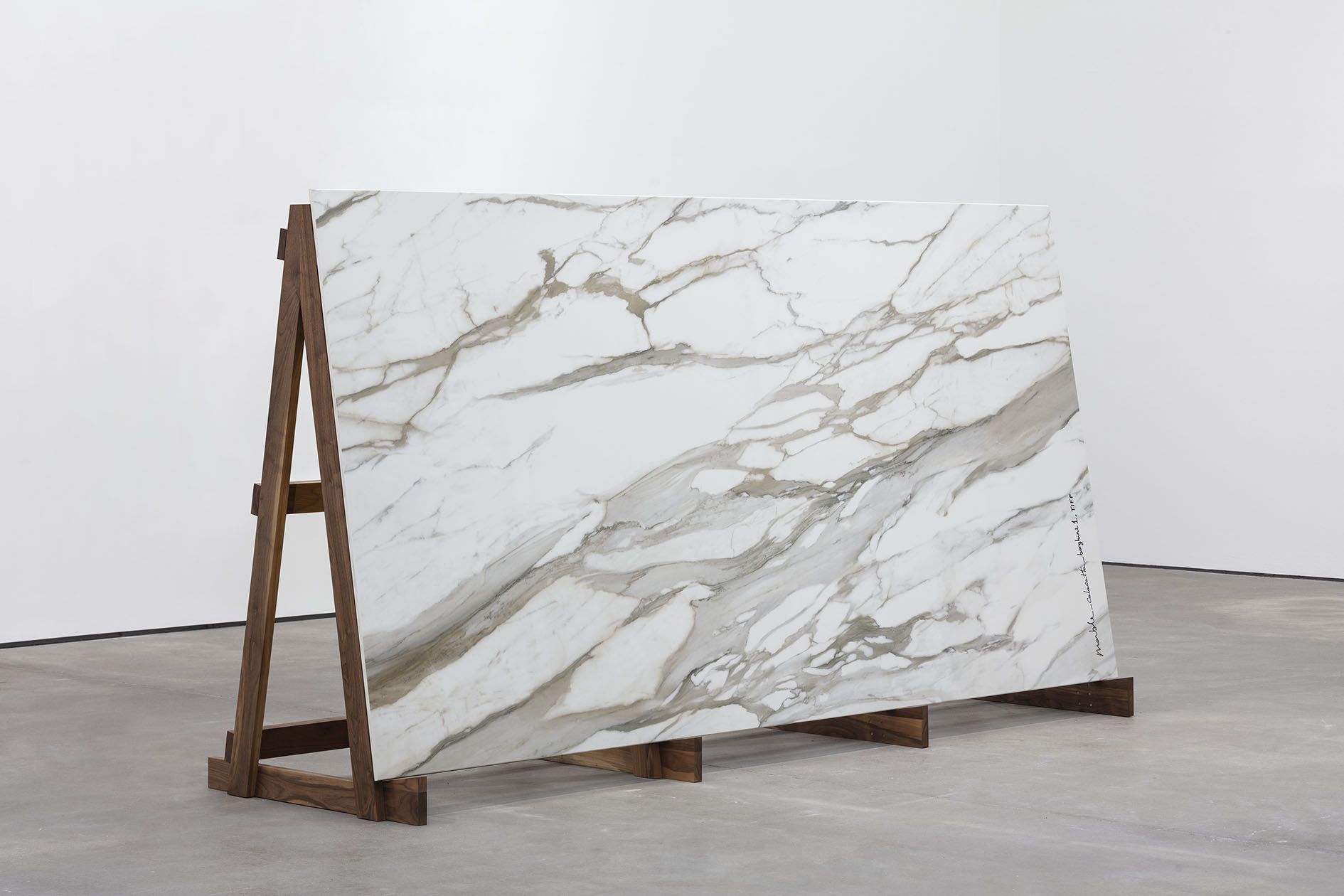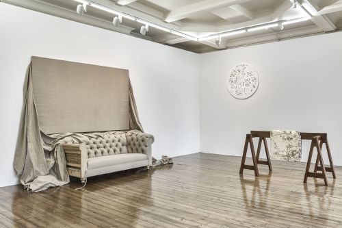 Saban’s sculptural work has likewise involved pushing materials far beyond their intended purposes. She has reupholstered old chairs and sofas with yards of linen canvas, whose loose ends extend onto stretcher bars mounted to the wall mimicking blank canvases. Her Draped Marble and Draped Concrete series (2014–16) treat hard slabs of stone like flowing fabric, cracking and bending them to drape gracefully over sawhorse-like structures and, in turn, invoking the long histories of both stone sculpture and painted drapery.
