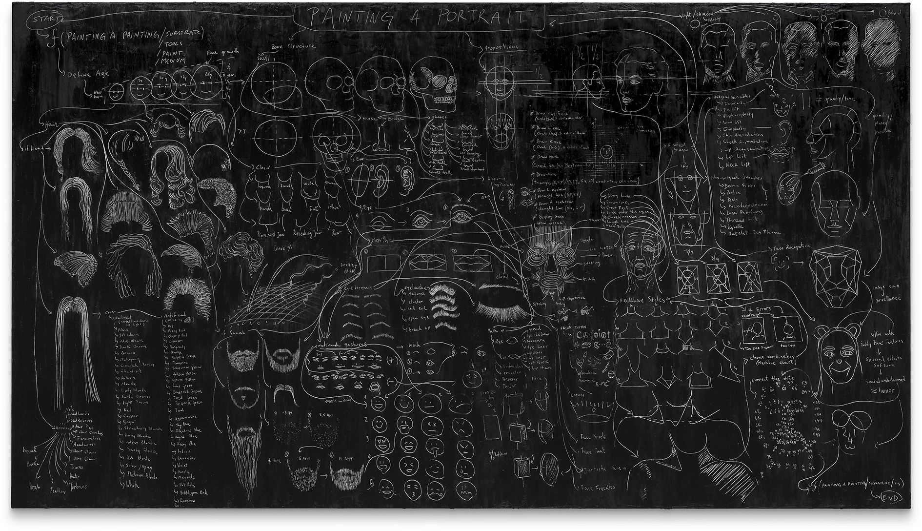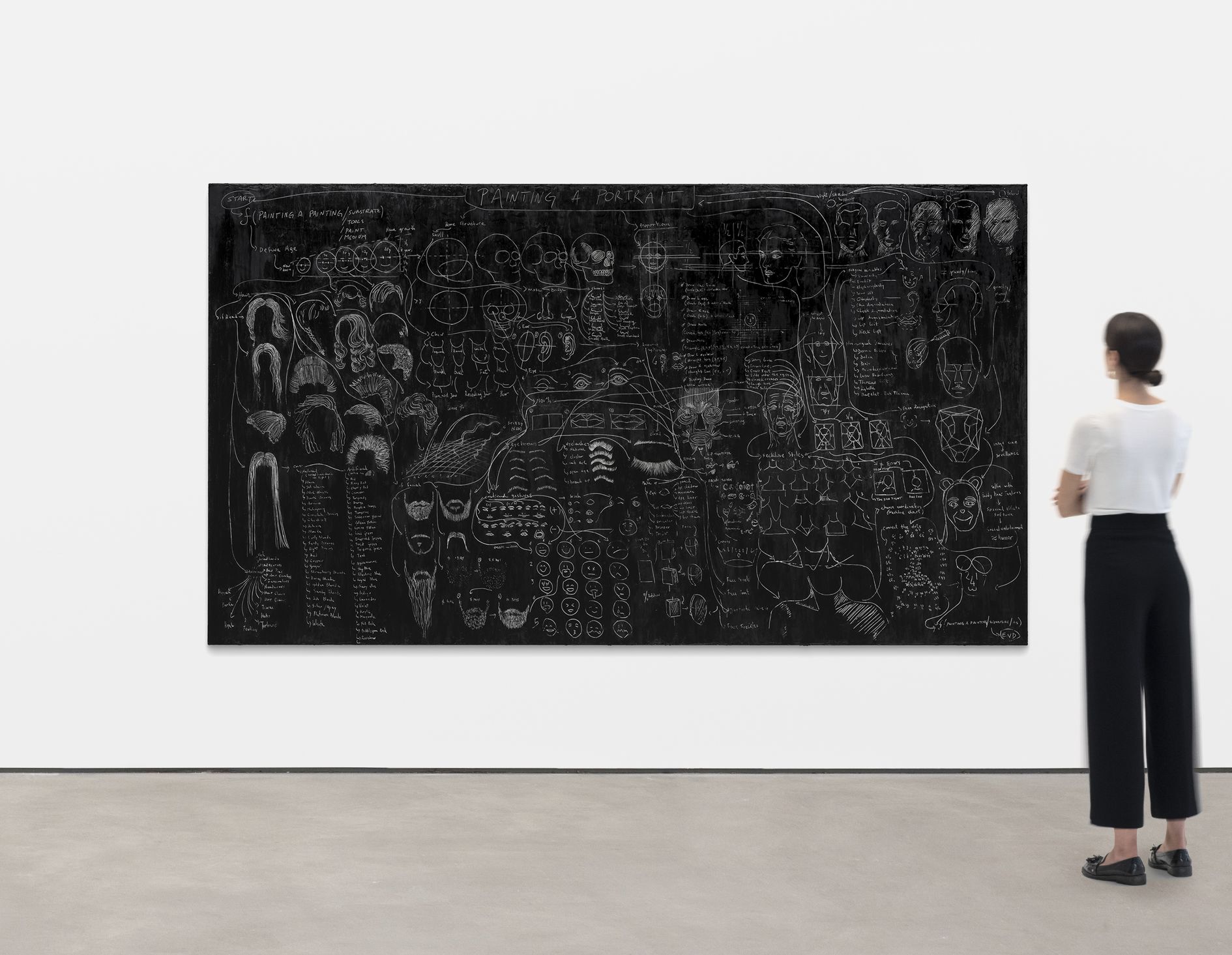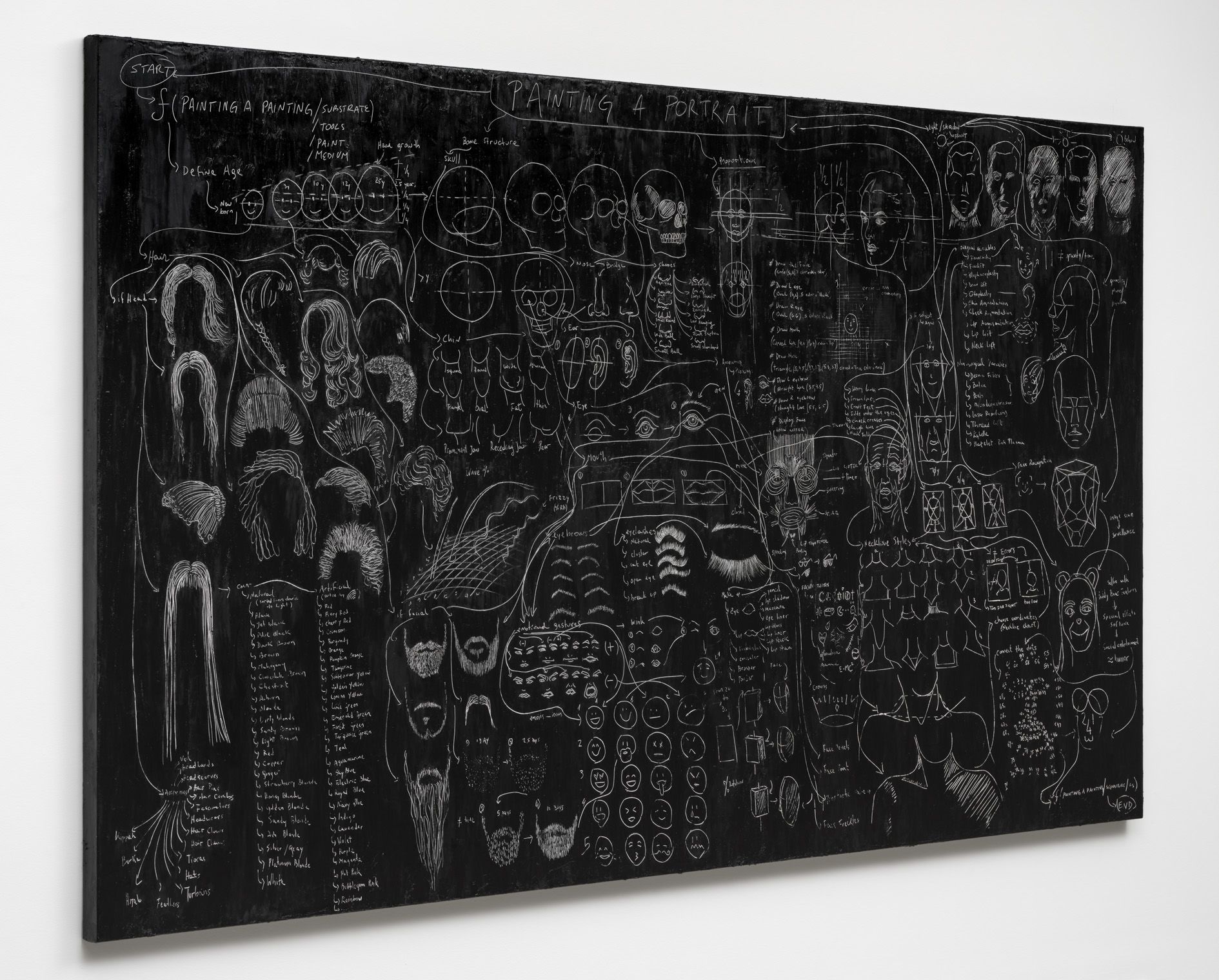 The roots of Saban’s practice can be traced to one of her earliest series, in which she dismantled dozens of painted canvases, unweaving their surfaces thread by thread, then reshaping them into objects such as a knitted scarf and a massive, tightly-wound sphere entitled The Painting Ball (2005)—new forms that call into question the value of works of art once they are reduced to their basic components. Traditionally paintings are created using brushstrokes that are applied one after the other to gradually construct an image. In Saban’s hands, however, brushstrokes might be created individually—as miniature, three-dimensional sculptures—and then affixed to canvas with glue or tape; or they may be painted onto canvas, but then burnt away with an industrial laser-cutter in calculated patterns, generating imagery via a subtractive, rather than an additive, process.