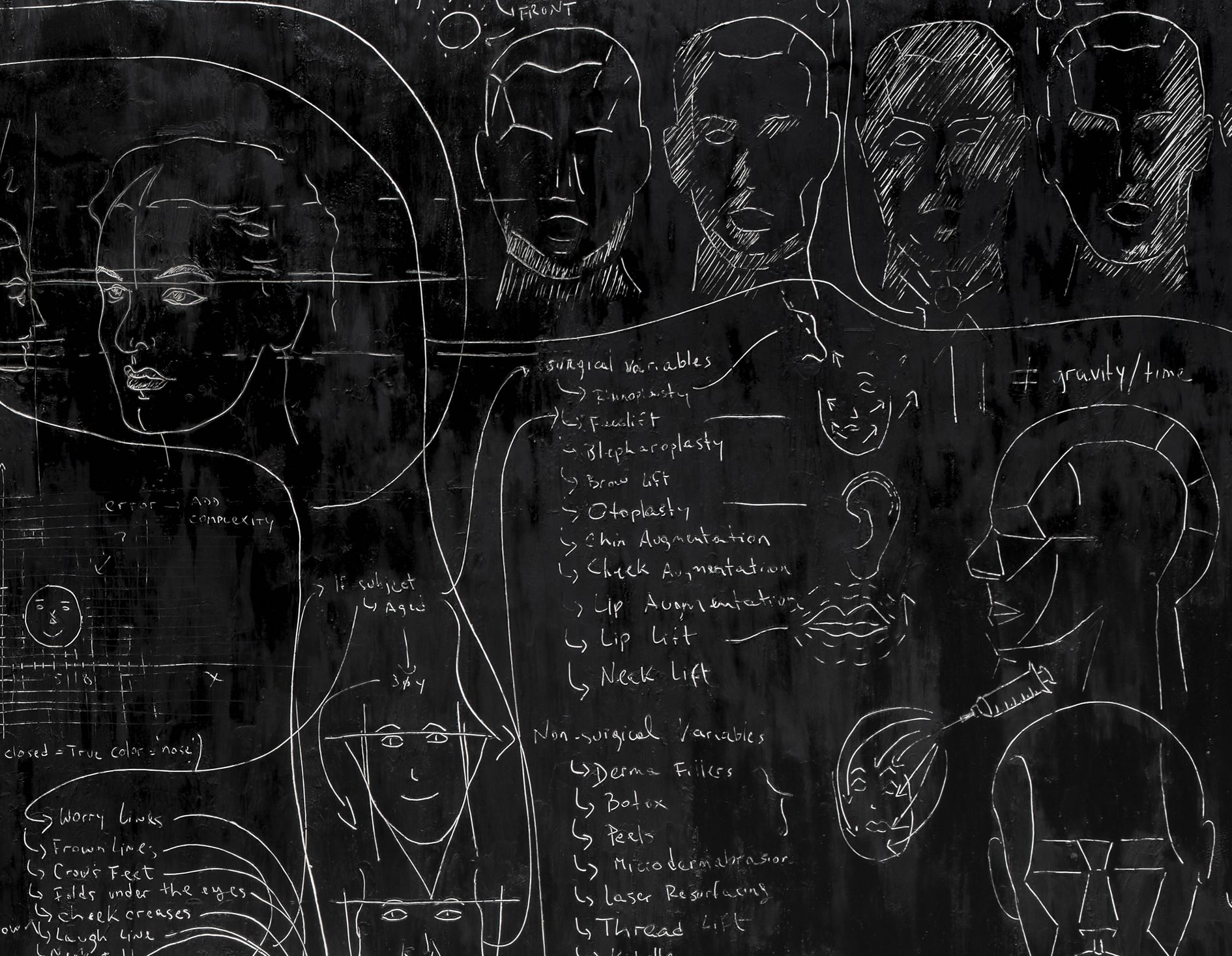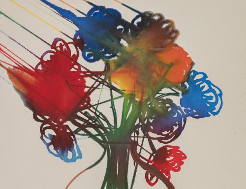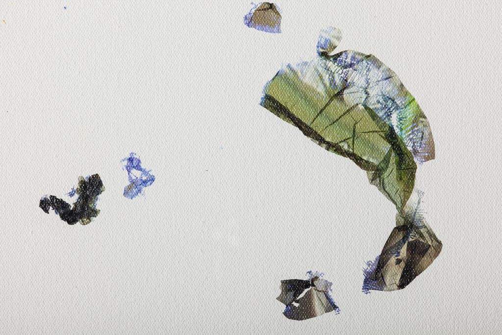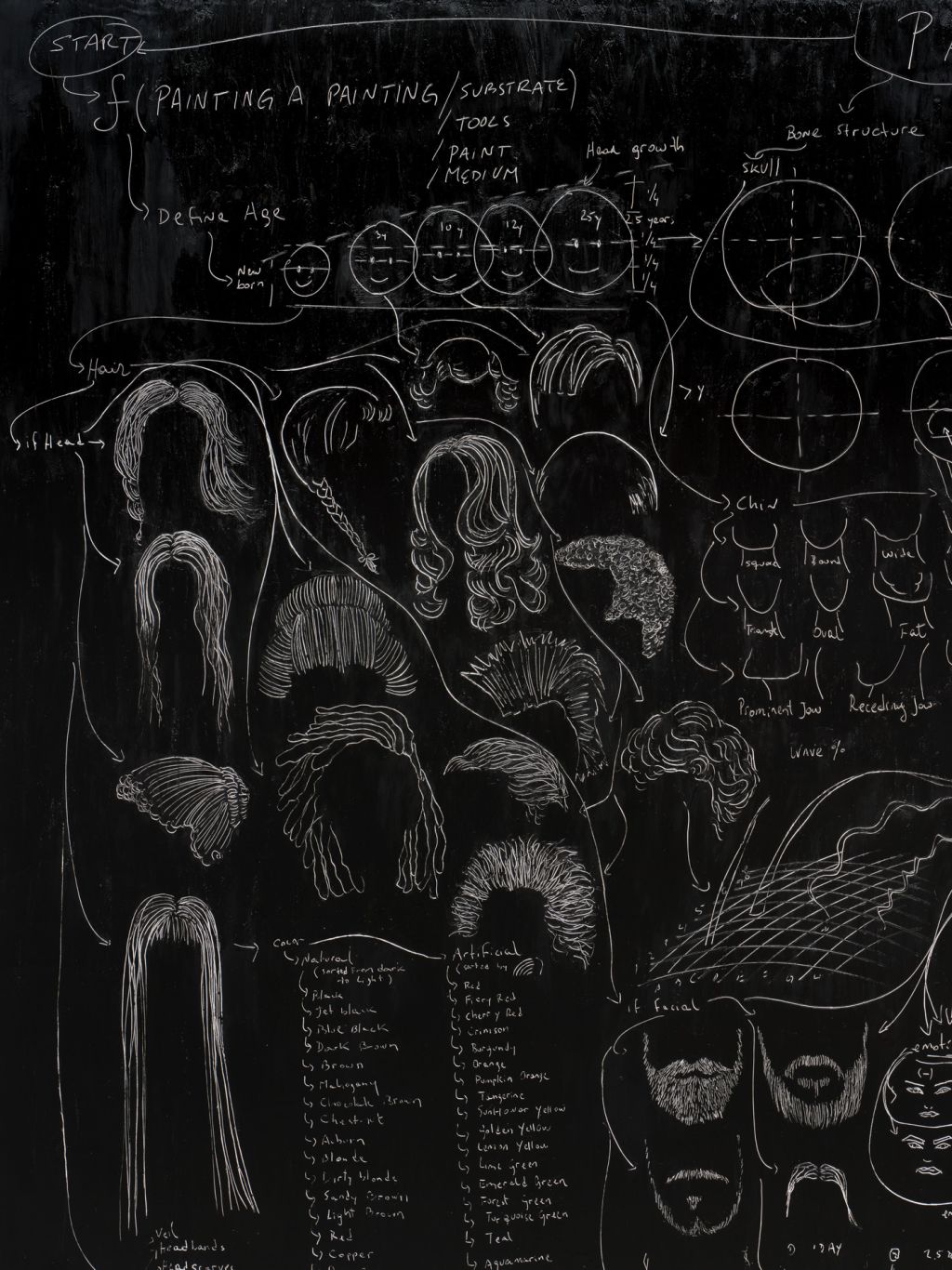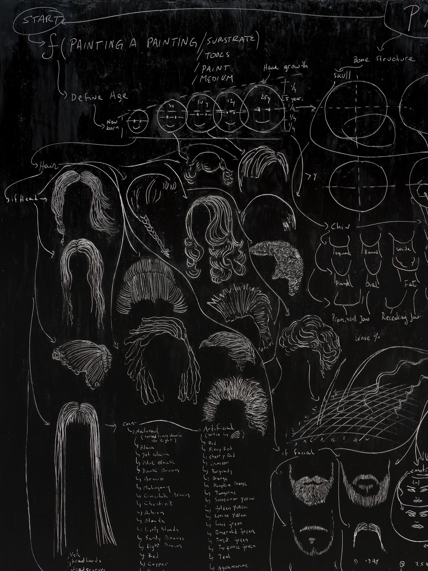The roots of Saban’s practice can be traced to one of her earliest series, in which she dismantled dozens of painted canvases, unweaving their surfaces thread by thread, then reshaping them into objects such as a knitted scarf and a massive, tightly-wound sphere entitled The Painting Ball (2005)—new forms that call into question the value of works of art once they are reduced to their basic components. Traditionally paintings are created using brushstrokes that are applied one after the other to gradually construct an image. In Saban’s hands, however, brushstrokes might be created individually—as miniature, three-dimensional sculptures—and then affixed to canvas with glue or tape; or they may be painted onto canvas, but then burnt away with an industrial laser-cutter in calculated patterns, generating imagery via a subtractive, rather than an additive, process.