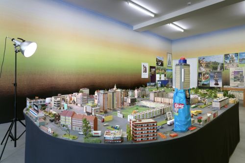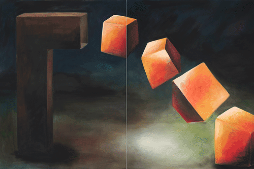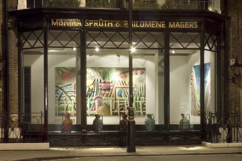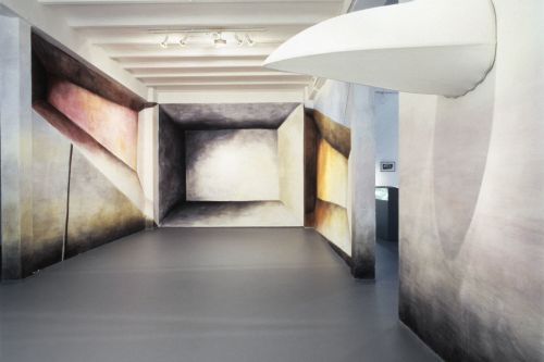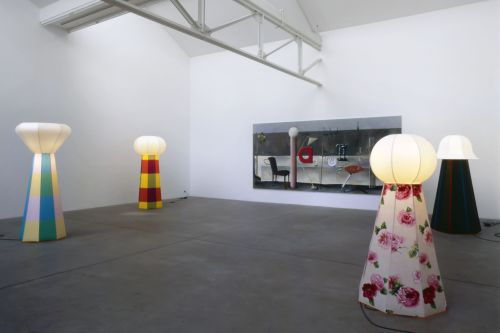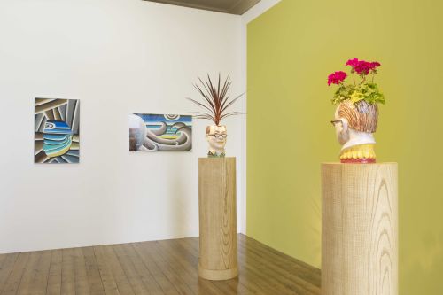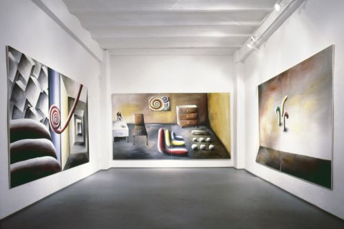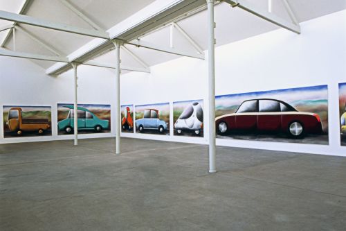 His repertoire of middle-class emblems thrives on the almost brazen simplicity of their pictorial settings. The “subjects” of these renderings include such commonplace things as peas, geraniums, fruit or porcelain dishes. Everyday objects such as sofas, cars, windows, rocks or Mars bars are arranged in humorous tableaux. Shaded geometric and biomorphic sausage-like shapes are contrasted with spherical color gradients in the background. Built-in kitchen cabinets, absurd pipe constructions or the kind of fringed roller found in a car wash are interspersed with abstracted household objects and the occasional indoor plant. Interiors and landscapes merge. Prefabricated houses are captured in an oblique bird’s eye view. In series that he revisits again and again, Schulze paints pictures of spheres and windows. His car paintings resemble assemblages of car doors, bumpers, and windshields, masterfully-painted yet quite possibly cobbled together by a mischievous child. Although primarily active as a painter, Schulze has repeatedly expanded his artistic universe to include sculptures and installations. He has also designed lamps and carpets himself and staged living room interiors on floor paintings that can resemble a lawn or a street intersection.