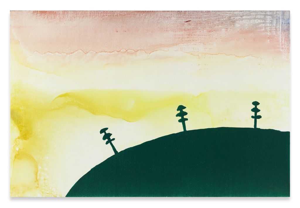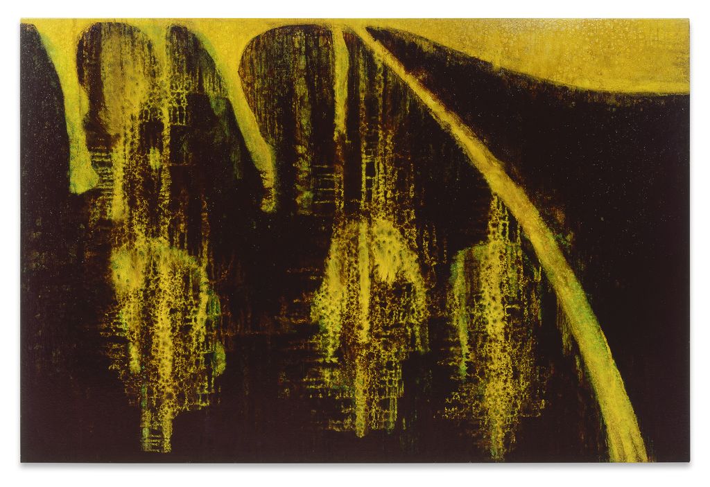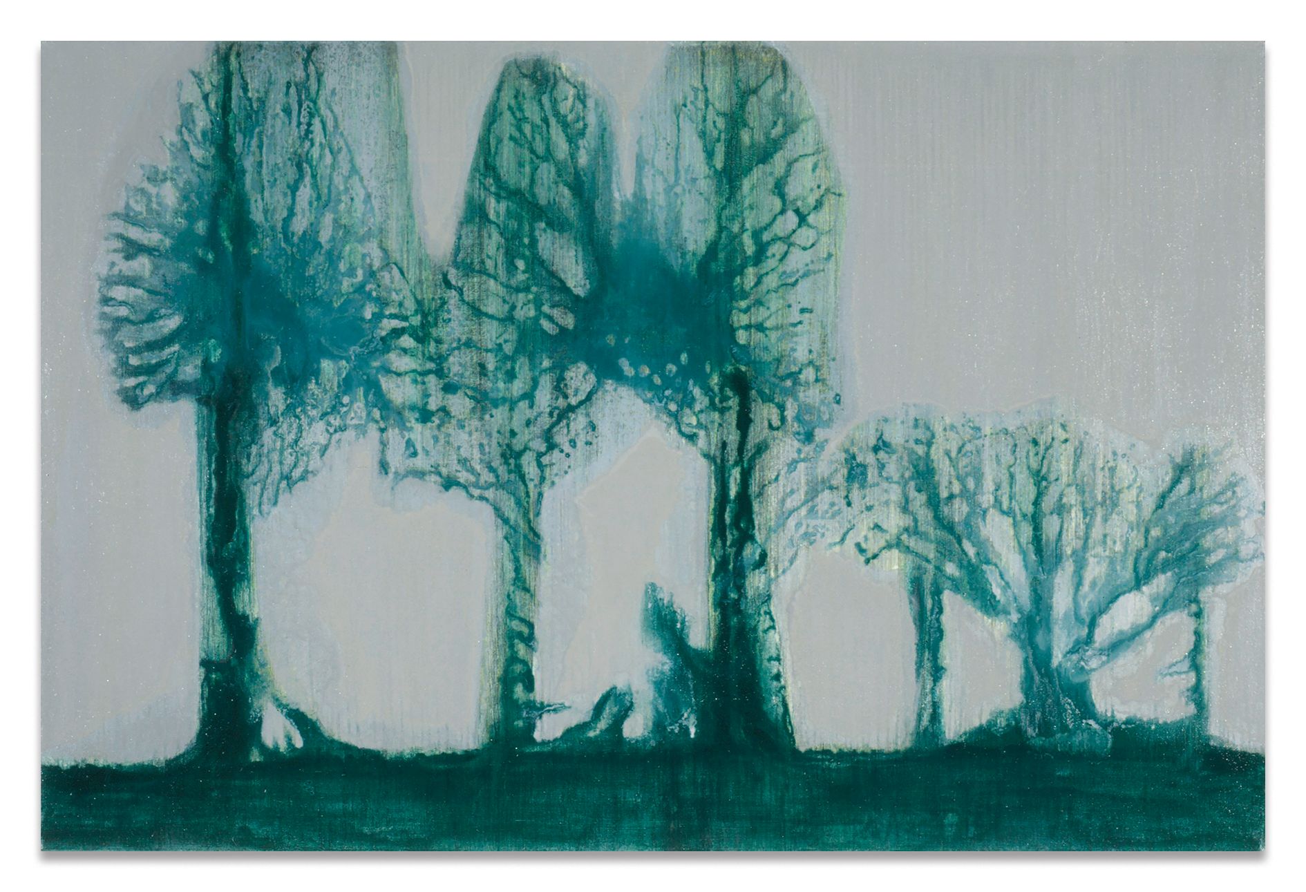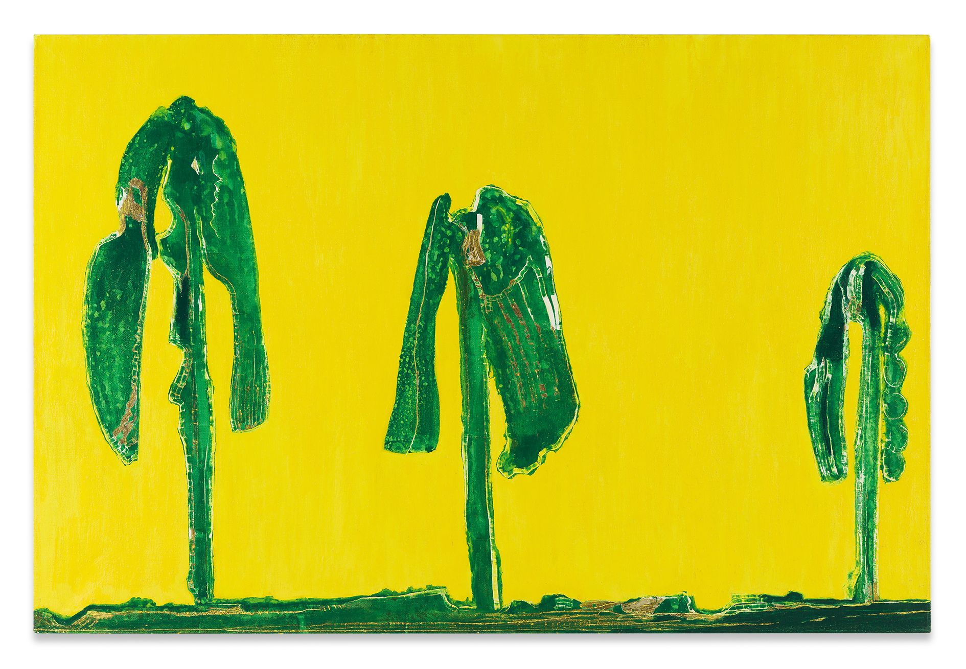 Kasseböhmer said that he ended his quotation series when it was labeled a form of “postmodernism.” From that time forward, he concentrated mostly on genres of painting that had been little more than an art-historical footnote since modernism, revisiting the still life and landscapes in particular. Kasseböhmer used various styles and methods to probe the possibilities of painting, something that becomes particularly evident in his series of tree, city and marine landscapes from the 1980s and 1990s. His development of a signature vocabulary in form and content went hand in hand with his increased exploration of the painterly craft, and he experimented with its facets in systematic, serial fashion. For his Meereslandschaften (Seascapes), Kasseböhmer employed oil paint that was so diluted that it took on a water-like transparency, allowing the paintings to oscillate between naturalism and abstraction. The gestural forms in his Landschaft gelb, grün (Landscape Yellow, Green) series, for which he focused on only two shades, deal with destructive upheavals in both the environment and in art. Kasseböhmer’s categorical rejection of irony clashed with the attitudes of a time when anything could be made into a mediated image and any aspect of painting seemed open to being destroyed.
