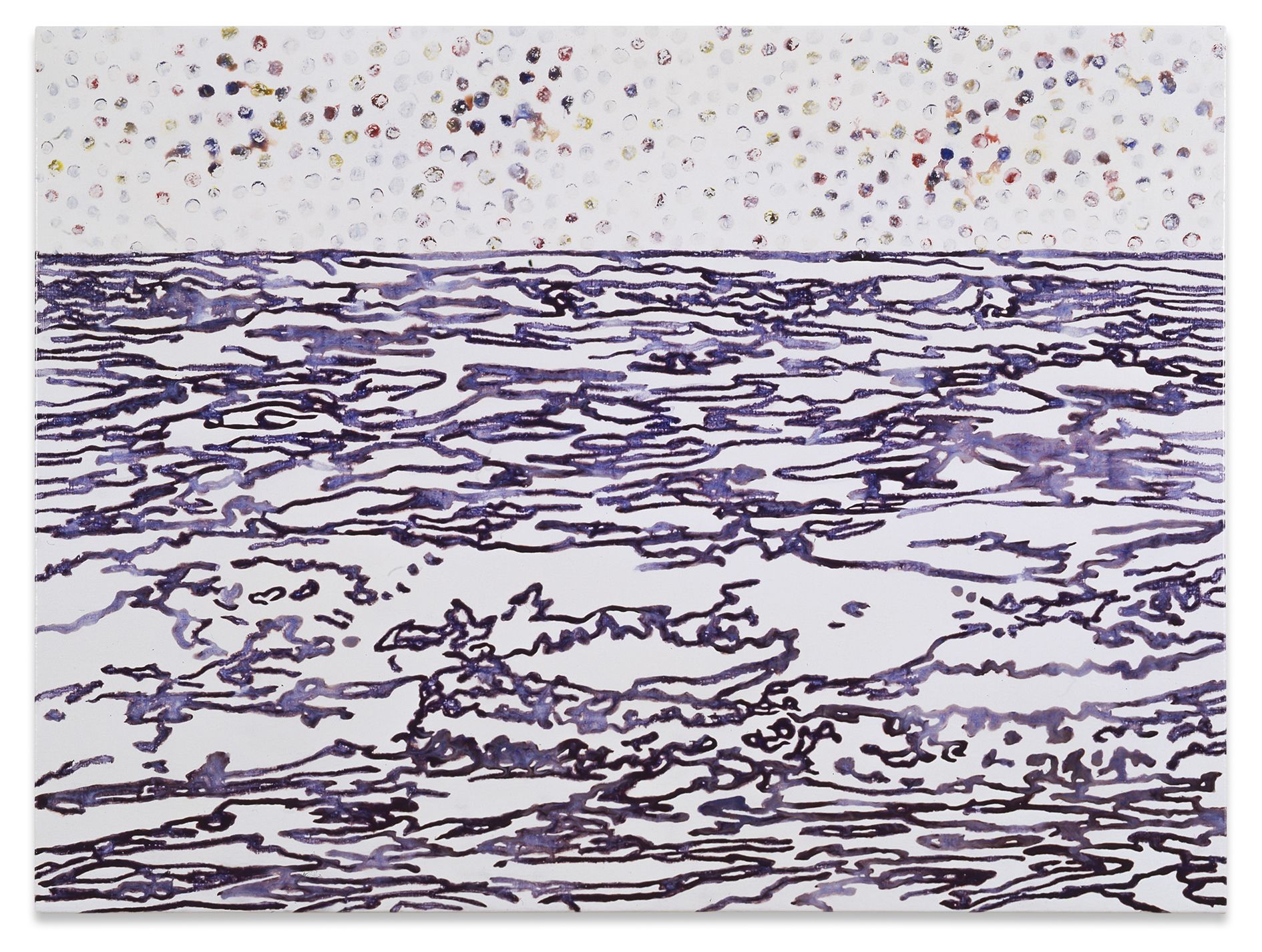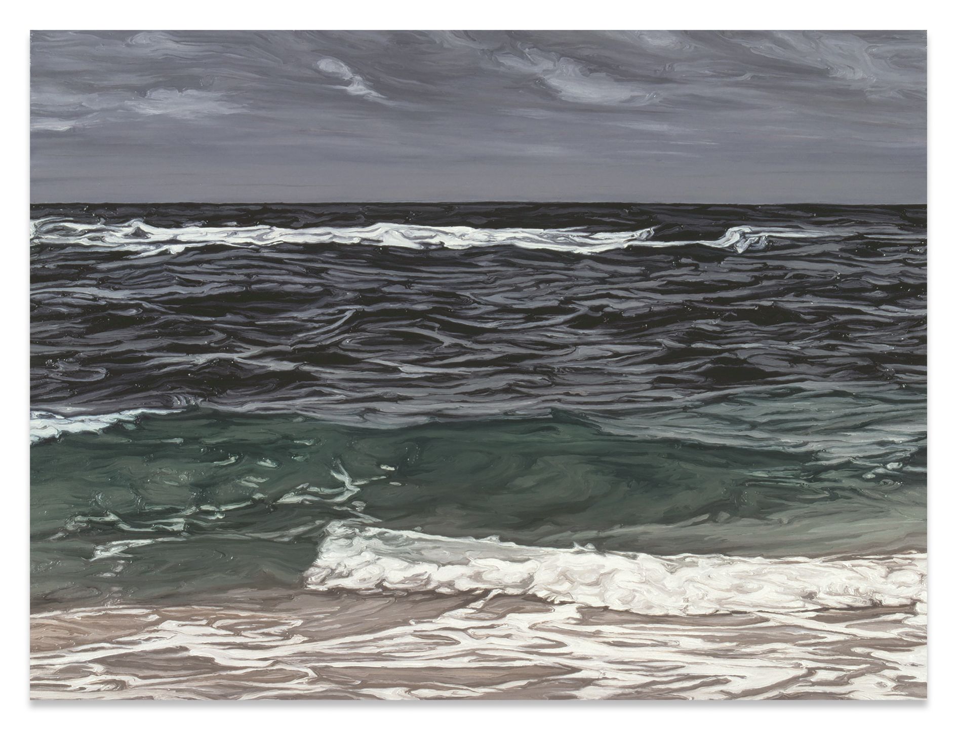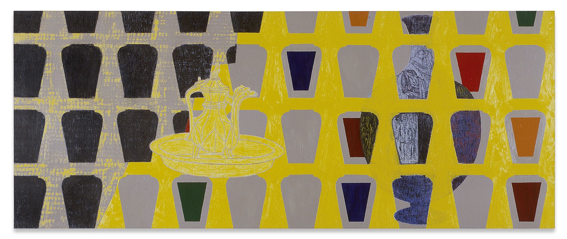 Kasseböhmer said that he ended his quotation series when it was labeled a form of “postmodernism.” From that time forward, he concentrated mostly on genres of painting that had been little more than an art-historical footnote since modernism, revisiting the still life and landscapes in particular. Kasseböhmer used various styles and methods to probe the possibilities of painting, something that becomes particularly evident in his series of tree, city and marine landscapes from the 1980s and 1990s. His development of a signature vocabulary in form and content went hand in hand with his increased exploration of the painterly craft, and he experimented with its facets in systematic, serial fashion. For his Meereslandschaften (Seascapes), Kasseböhmer employed oil paint that was so diluted that it took on a water-like transparency, allowing the paintings to oscillate between naturalism and abstraction. The gestural forms in his Landschaft gelb, grün (Landscape Yellow, Green) series, for which he focused on only two shades, deal with destructive upheavals in both the environment and in art. Kasseböhmer’s categorical rejection of irony clashed with the attitudes of a time when anything could be made into a mediated image and any aspect of painting seemed open to being destroyed.