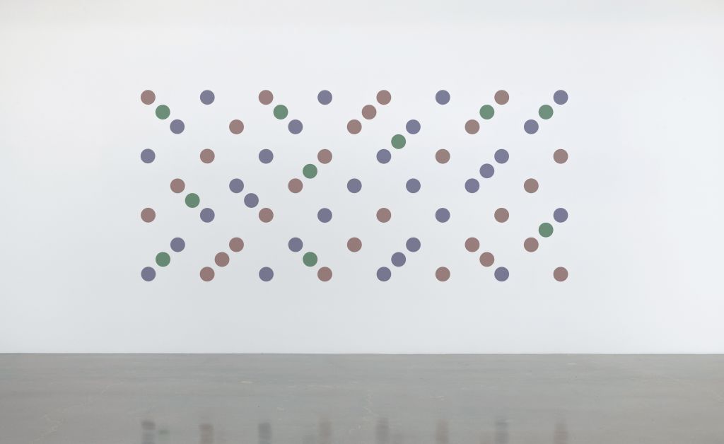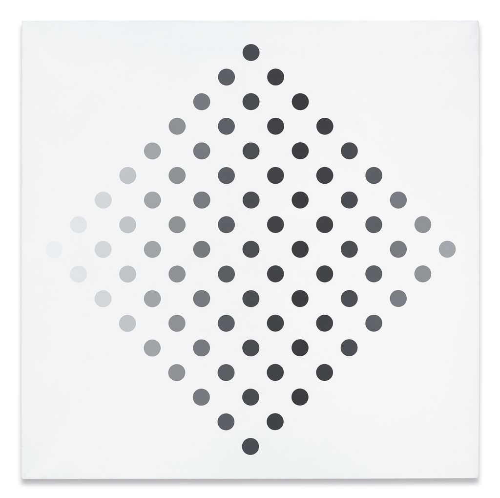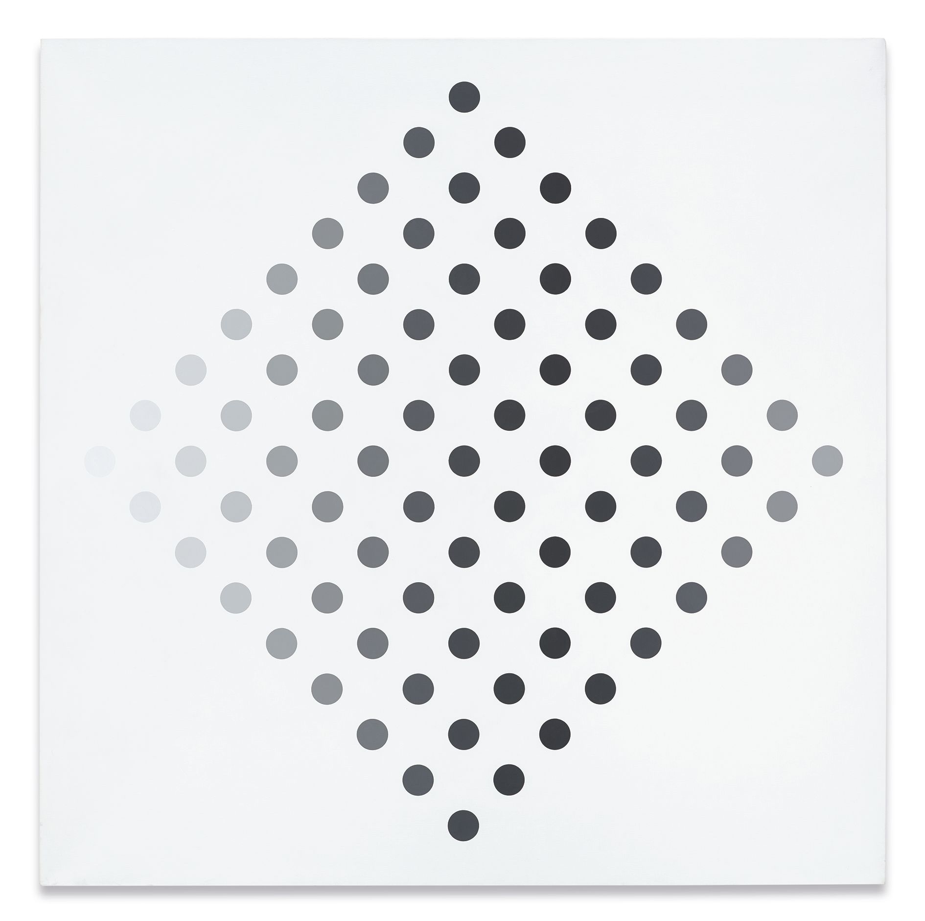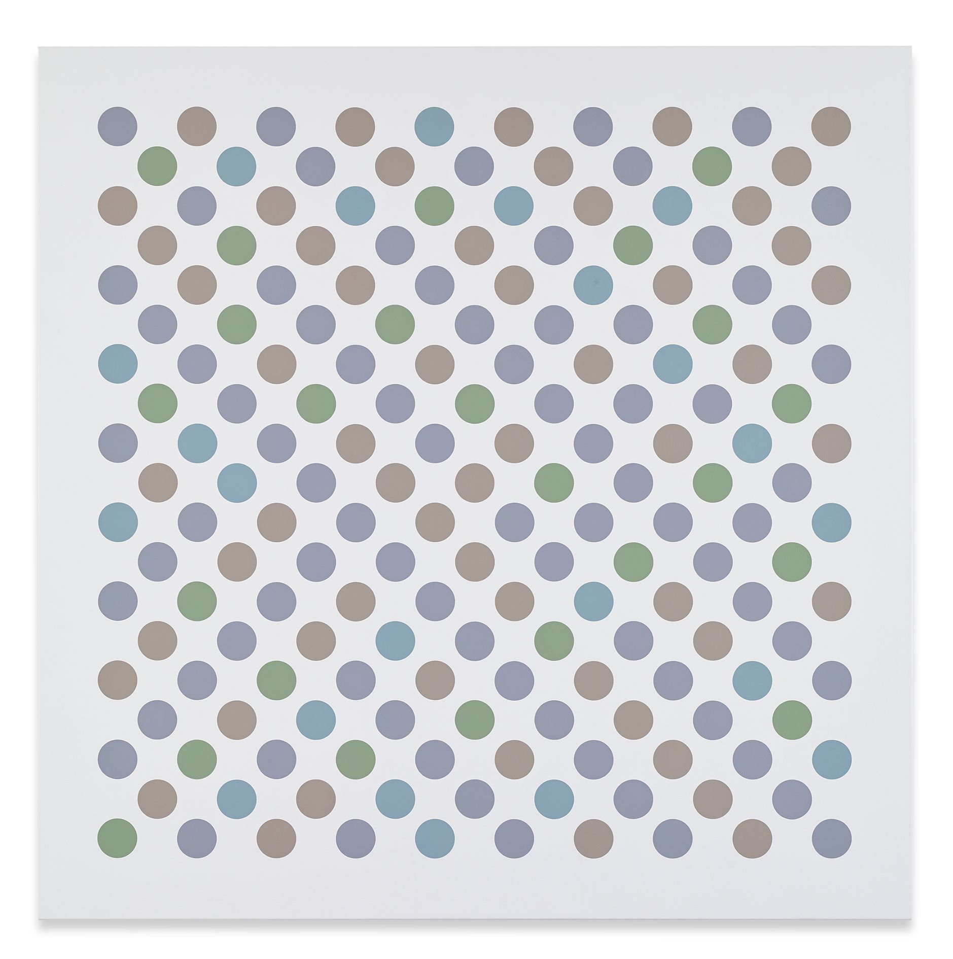 Riley’s painterly probe of visual perception relies on an ambiguous visual language that is as abstract as it is evocative. Her works are characterized by an almost hypnotic intensity. The surfaces of her paintings and wall paintings appear to shimmer, quiver, contract, or expand, at times conveying the impression that they are floating in front of the wall, moving in the direction of the viewer or recoiling from them. These qualities give her work a visual pull and a unique pictorial depth, but they also almost imperceptibly destabilize the picture plane. Riley focuses on the ways in which colors and elements of geometric form interact with one other, their mutual influence and modifications, on rhythm, repetition, variation, contrast, and the quasi-musical motif-like quality of picture elements. In doing so, she shifts the focus of the painterly event from the picture plane to the space between picture and viewer. Her art is an art of dialogue between eye and image; its effect unfolds only in the dynamics of seeing.