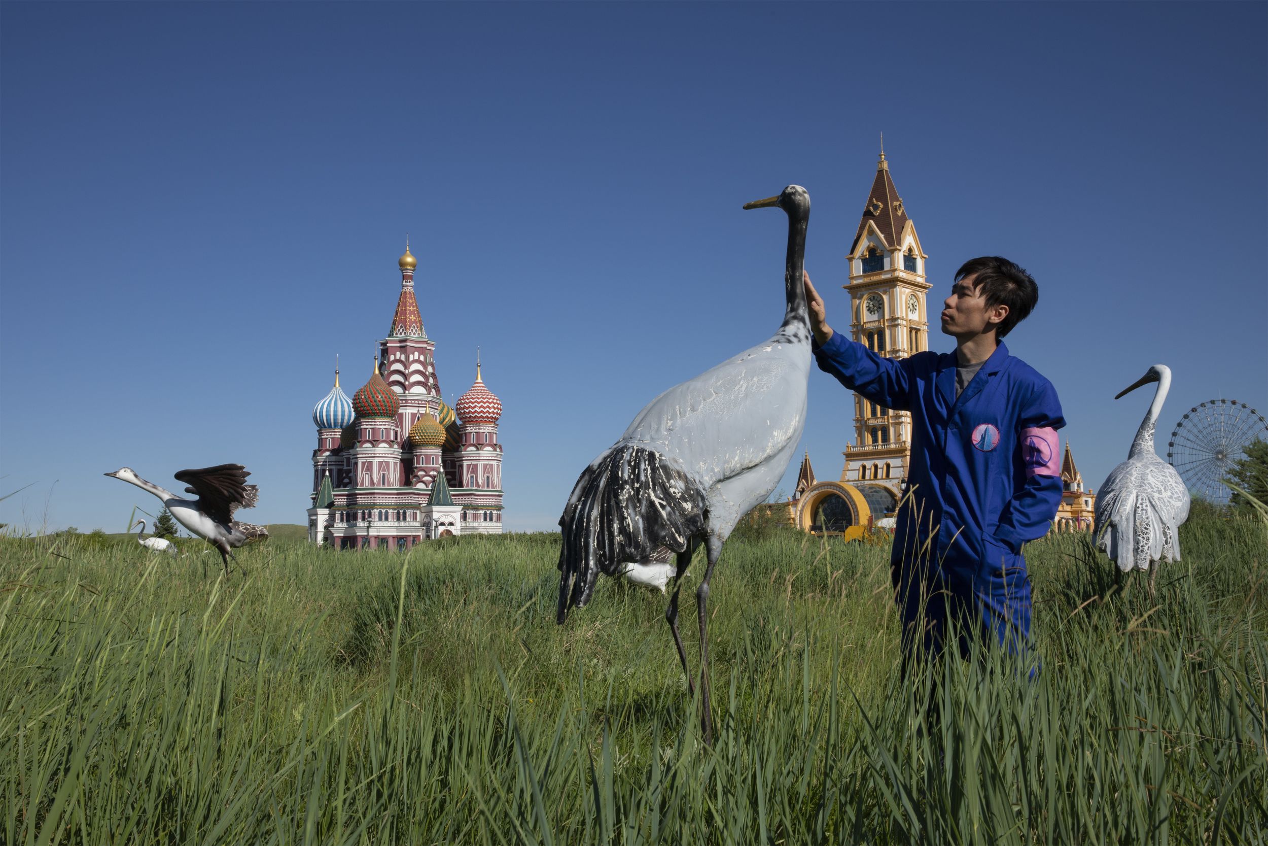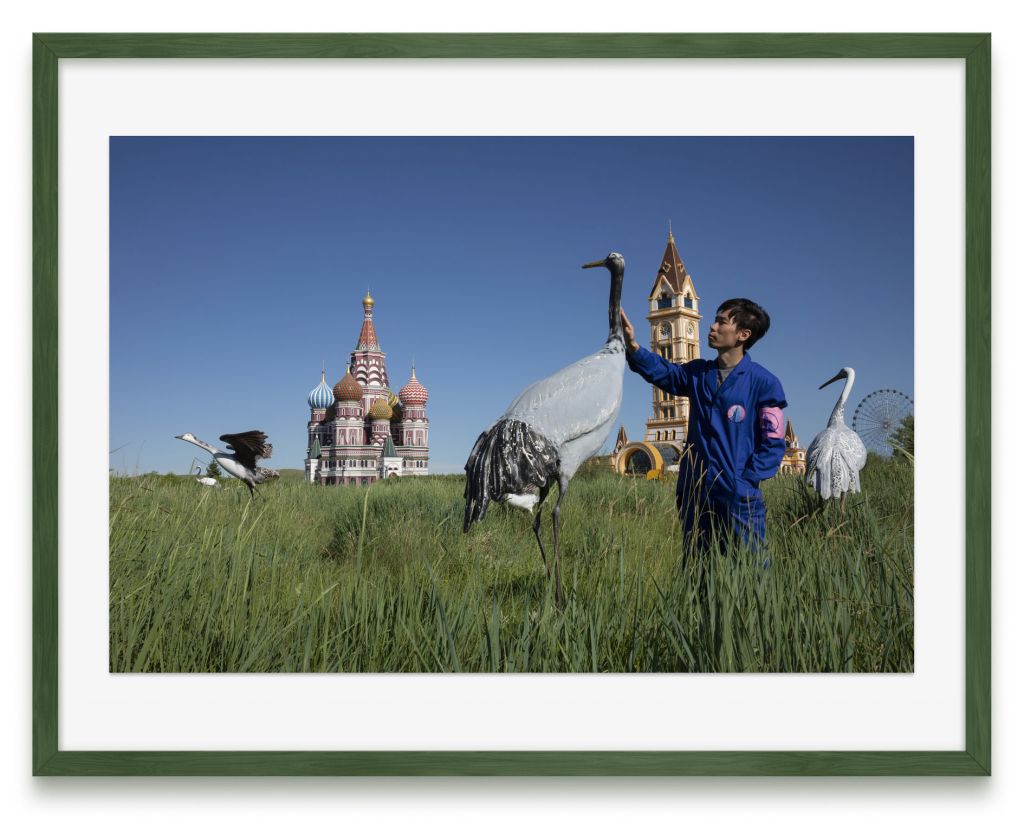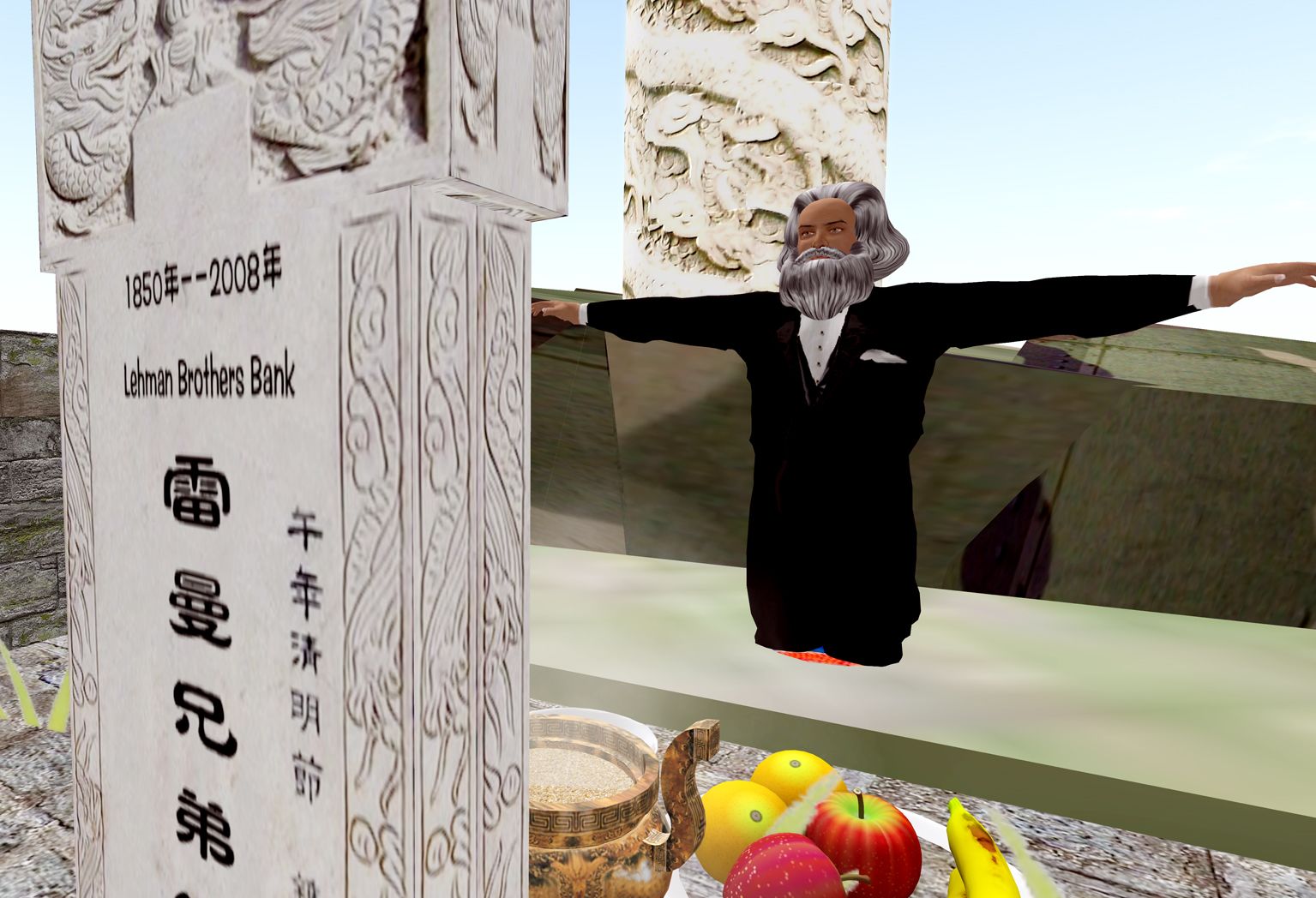 In many ways, Cosplayers also explored the emerging neoliberal collective identity brought on by global networking, a theme Cao would continue to probe in later works. Her celebrated project RMB City (2007–11) was named after the renminibi, the Chinese currency often abbreviated as RMB. It was created on the then immensely popular cyberspace platform Second Life and can still be found there today, albeit largely abandoned. RMB City is an exuberant virtual island metropolis whose buildings either imitate real, iconic structures from all over the world or were entirely inspired by fantasy; Cao invited other artists, curators, architects and collectors to contribute to its design. The cyber-city’s hallmark is a giant bicycle wheel reminiscent of Duchamp. The project, which has been documented in a series of hypnotic video works, is less the invention of an alternative parallel world than the narrative processing of the existing world of China, its incomparable construction boom and turbo-capitalism. While initially optimistic in its outlook, the project gained more post-apocalyptic traits near its end.