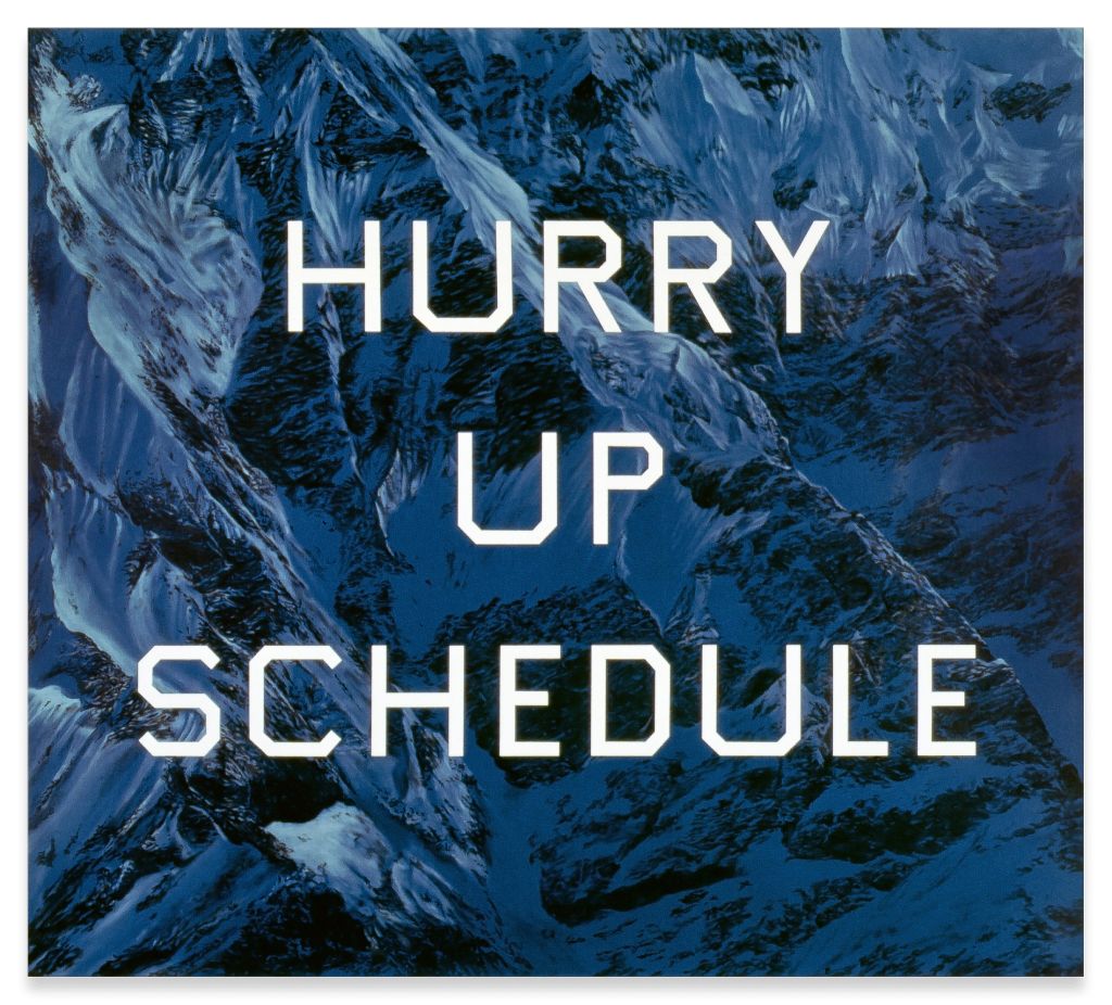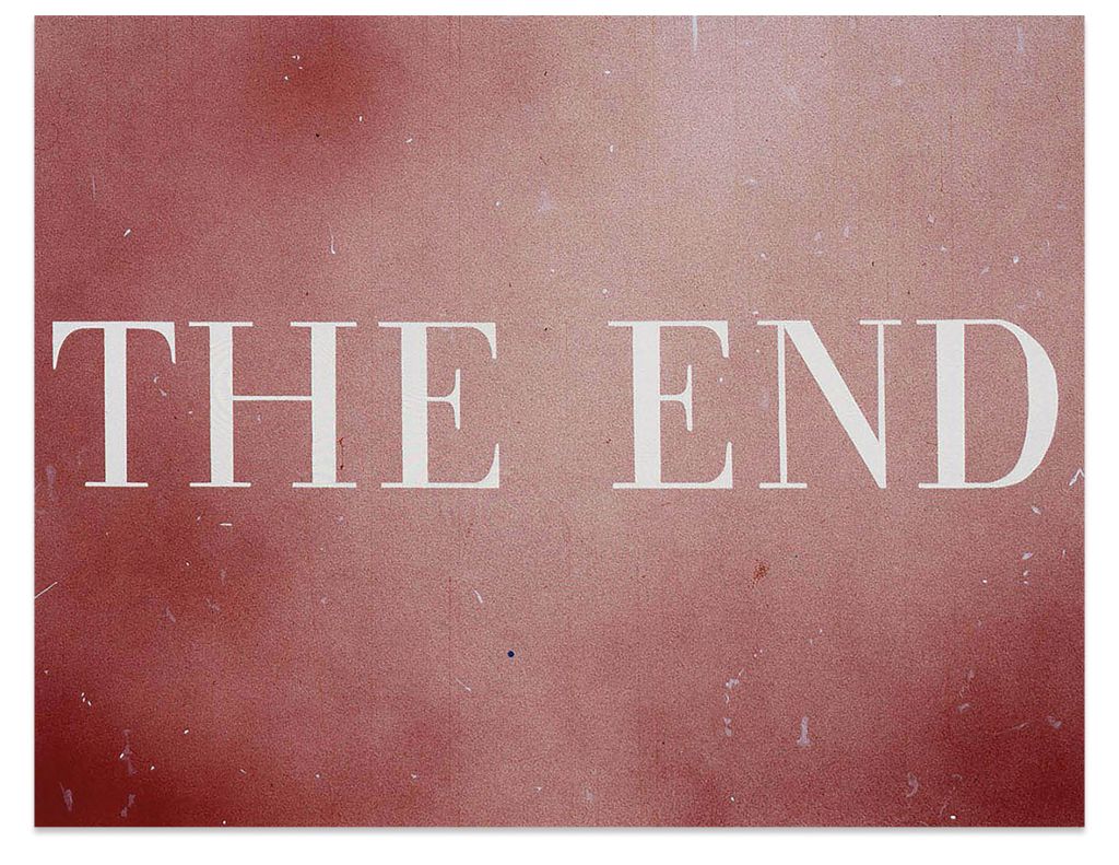 Much of the artist’s work since the 1970s involves a new type of picture that combines the illusory depth of landscape painting with the flat space of typography. At the center of these works are familiar-sounding, often tongue-in-cheek phrases and short sentences that could be described as “readymade” language from media, music, literature and advertising. Since the 1980s, these words have almost always appeared in a plain, functional font that Ruscha designed himself and ironically refers to as Boy Scout Utility Modern. The backgrounds of these works usually consist in sections of sky, nocturnal cityscapes or snowy mountain peaks—almost generic-looking images that nevertheless exude a kind of dim majesty. While paintings such as Not a Bad World, Is It? (1984) or Daily Planet (2003) seem to try to secularize transcendental emotions, others including his The End series (ongoing since 1991) engage with social and societal decay.