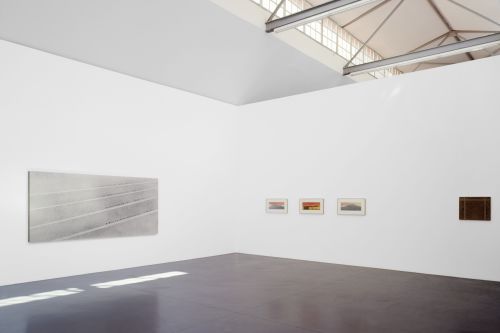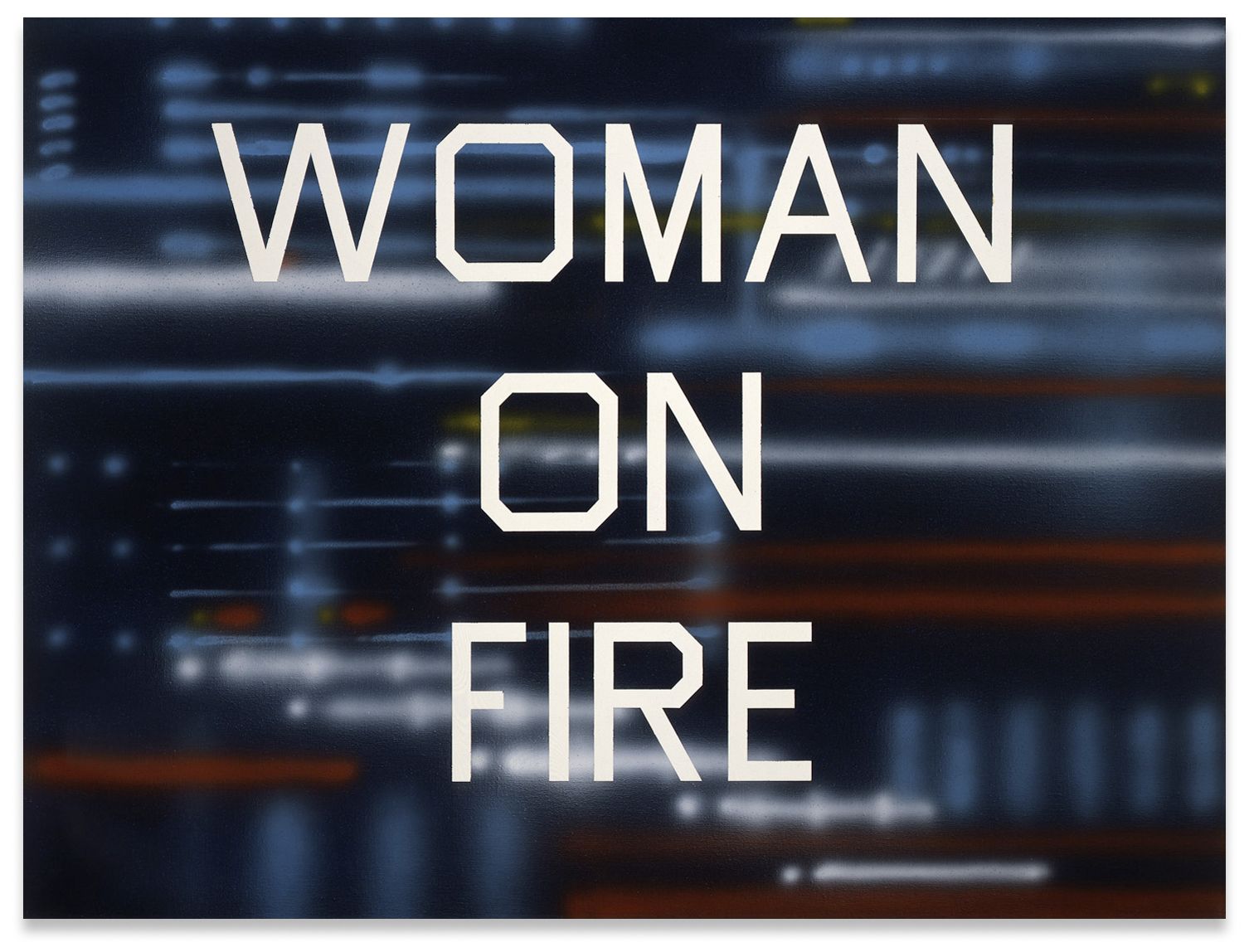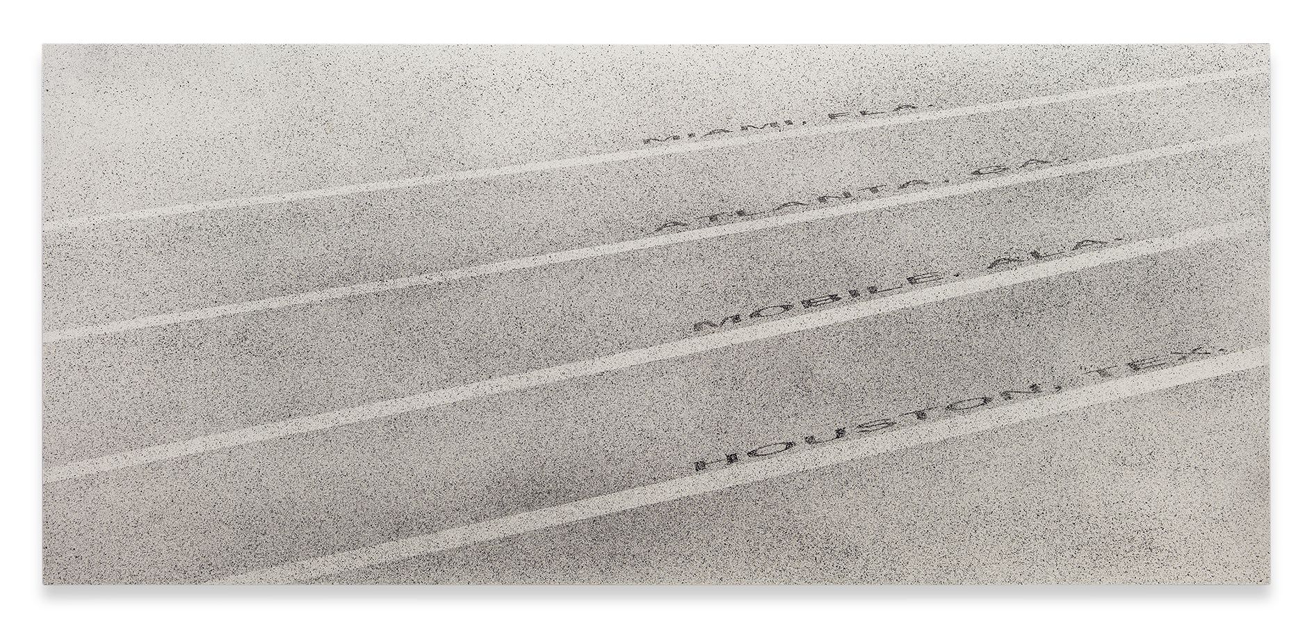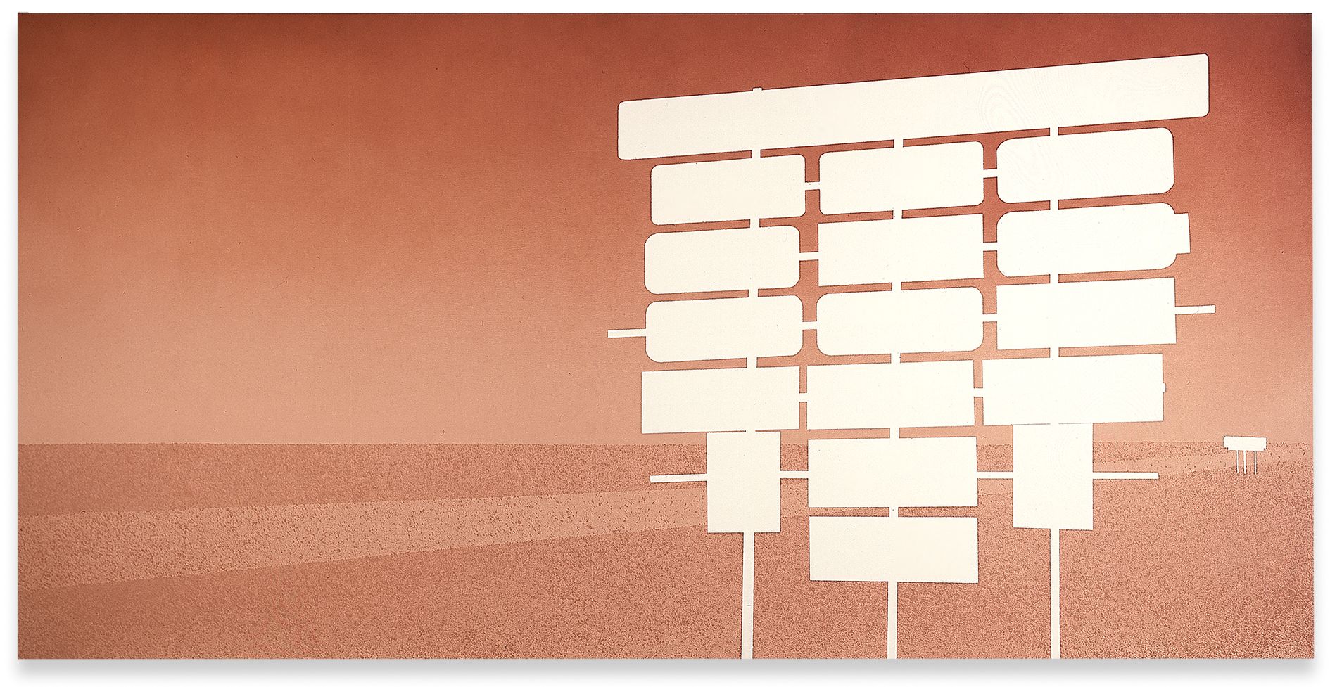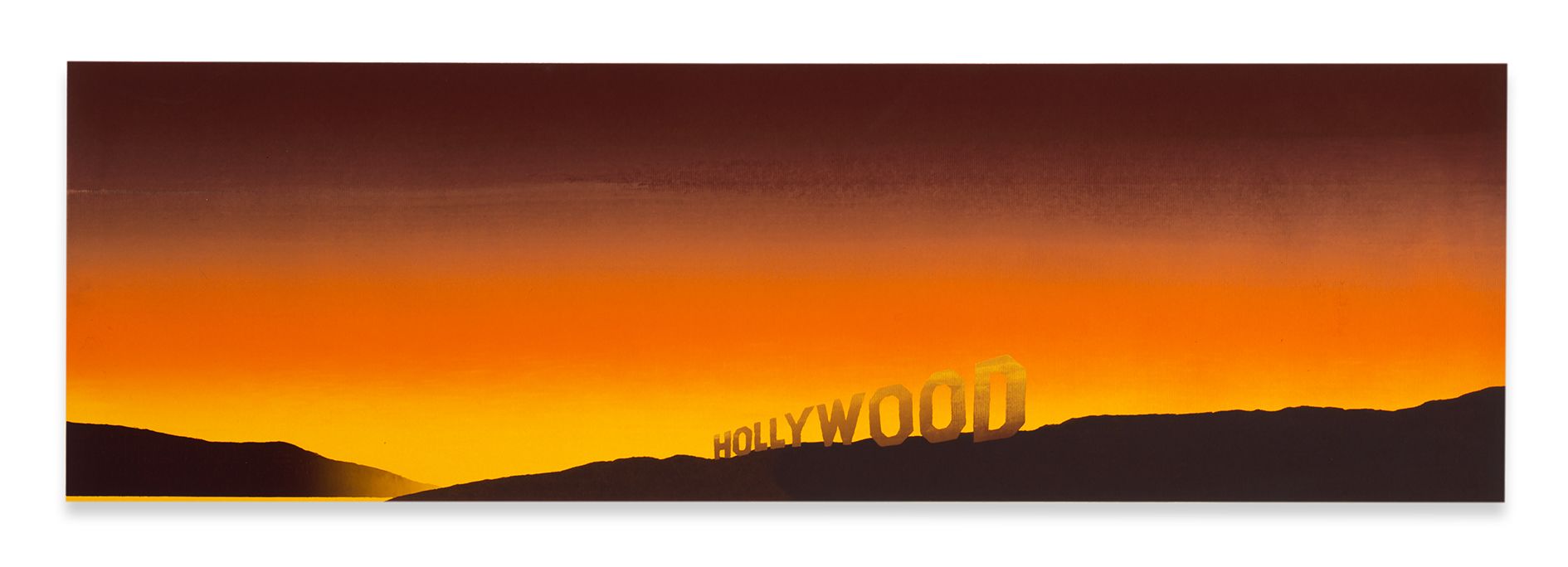 Ruscha’s painterly oeuvre derives from a perpetual expansion of the medium’s boundaries, often with recourse to visual strategies from advertising, graphic design and film. Early paintings from the first half of the 1960s show the artist breaking with Abstract Expressionism’s dogma of subjectivity to foreground ubiquitous brand logos or product packaging instead. Emphatically horizontal works including Large Trademark with Eight Spotlights (1962)—a monumental, deeply elongated rendering of the Twentieth-Century Fox logo—explore notions of landscape and the American West and recall widescreen CinemaScope film projections.