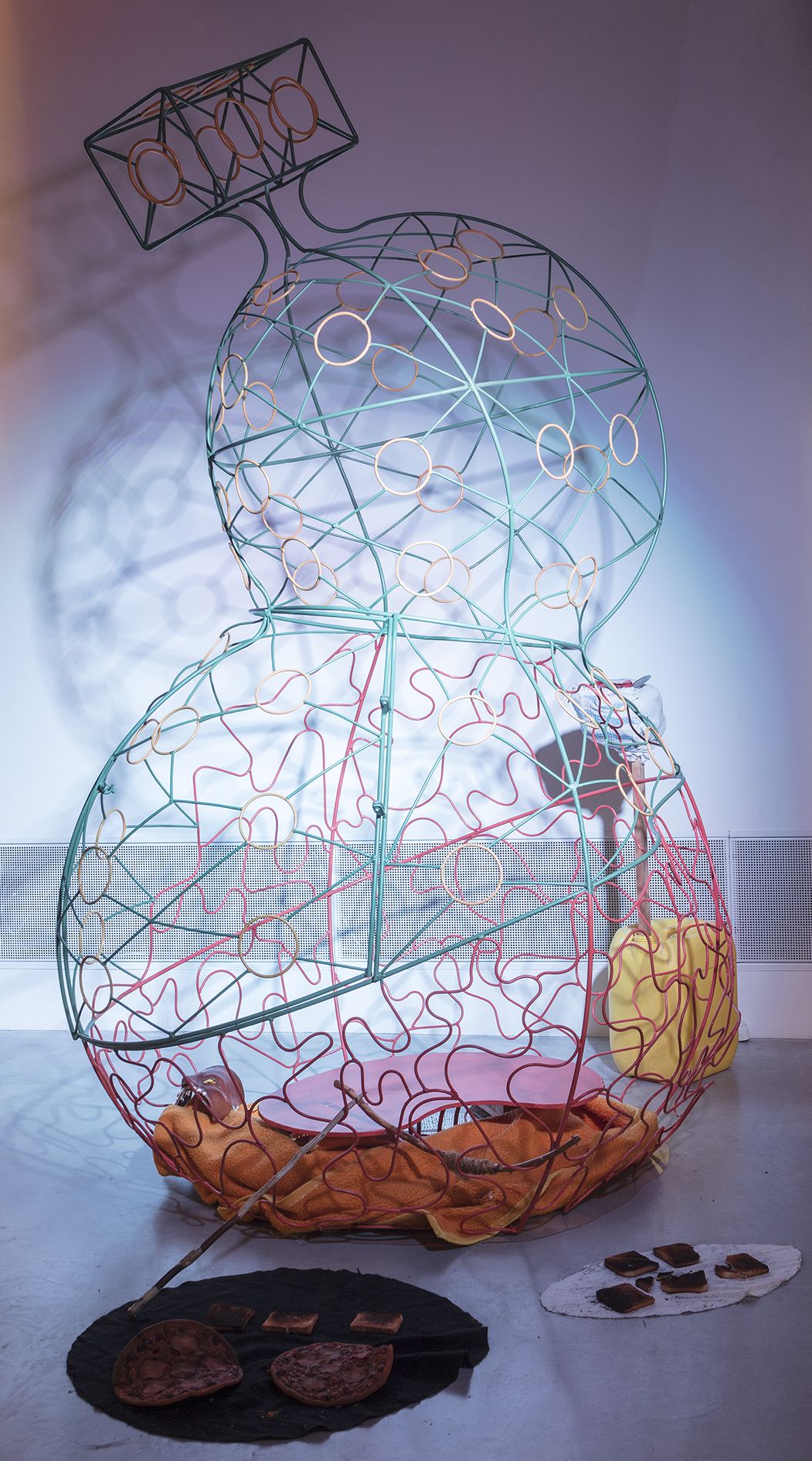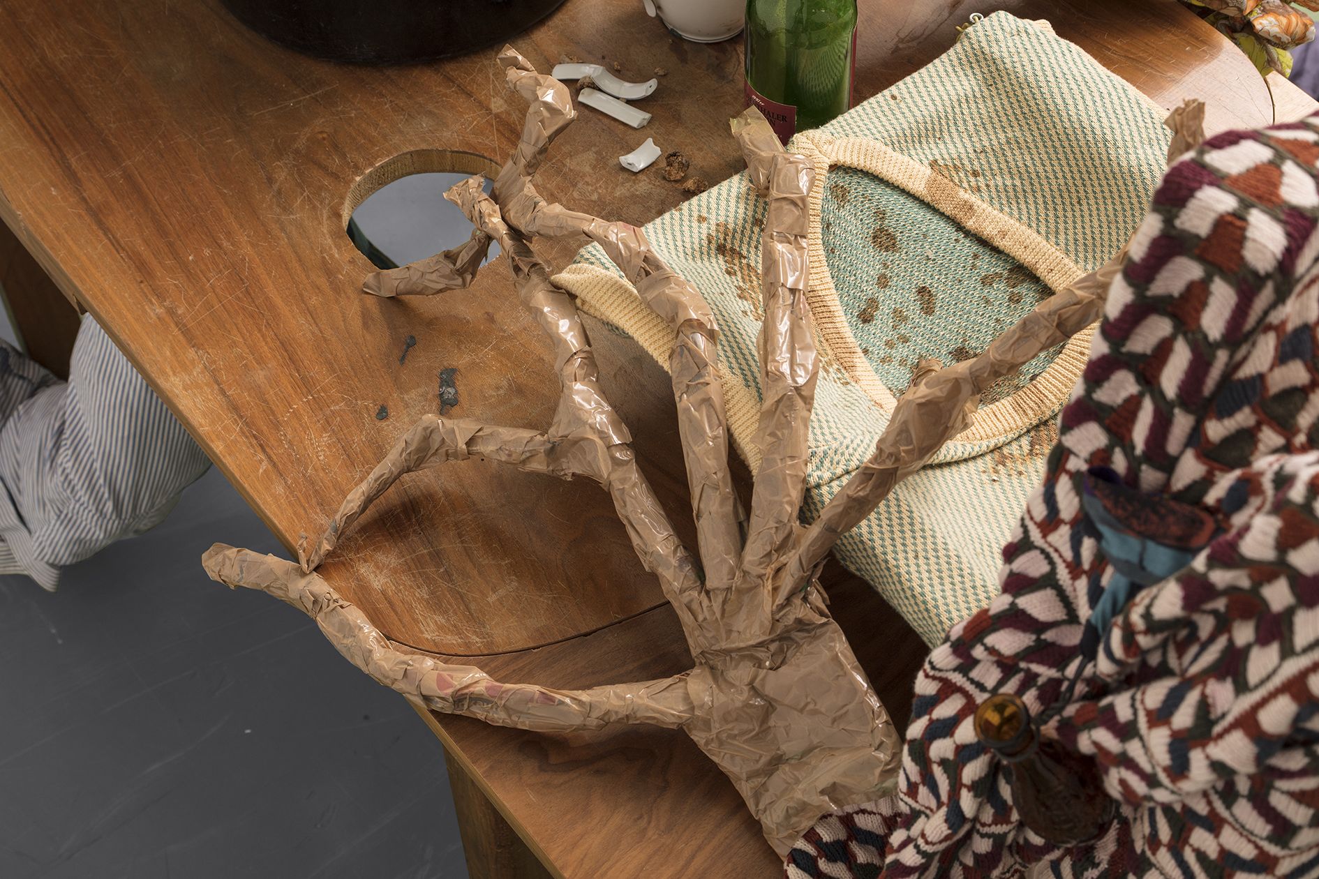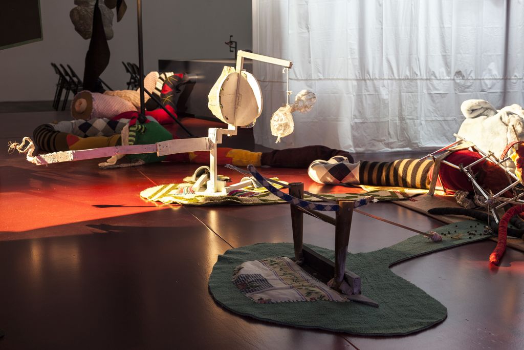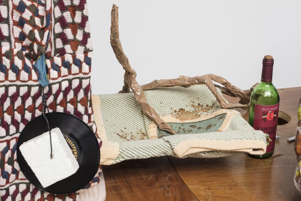 The films often play a synthesizing role in these installations. Initially created only in tandem with Bock’s live performances, recent years have seen them draw on an increasingly complex array of cinematographic typologies. Examples include Der magische Krug (The Magic Jug, 2013), which taps the aesthetic vocabulary of silent film, but also Unheil (Doom, 2018), a radical mash-up of the medieval fantasy genre. Other works, such as Unzone Eierloch (Unzone Egghole, 2013), are amalgamations of almost every genre, from experimental, horror and gangster films, road, sci-fi and Z movies, as well as romantic comedies and crime dramas. Bock’s films are often set in a schizophrenic, fairytale-like parallel world where adversaries might be strangled by the intestines spilling from the protagonist’s abdomen. Despite their freewheeling, associative play with words, objects and narrative elements, these works have all the coherence of feature films. A number of costumes and props shown in the films also reappear in the cosmos of objects that make up the surrounding installations. The props and objects become autonomous agents, bringing the film to life as unpredictable characters in their own right.