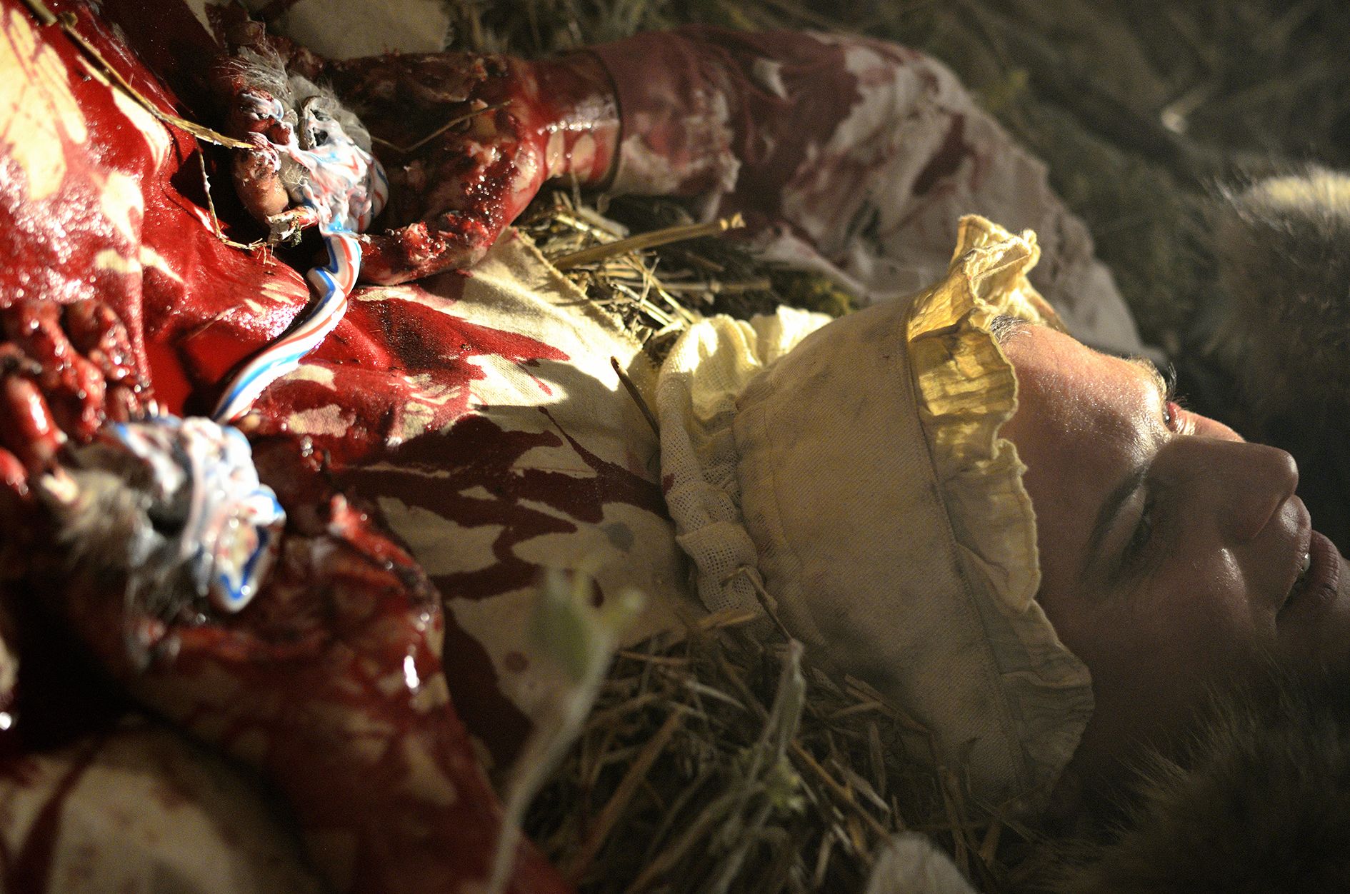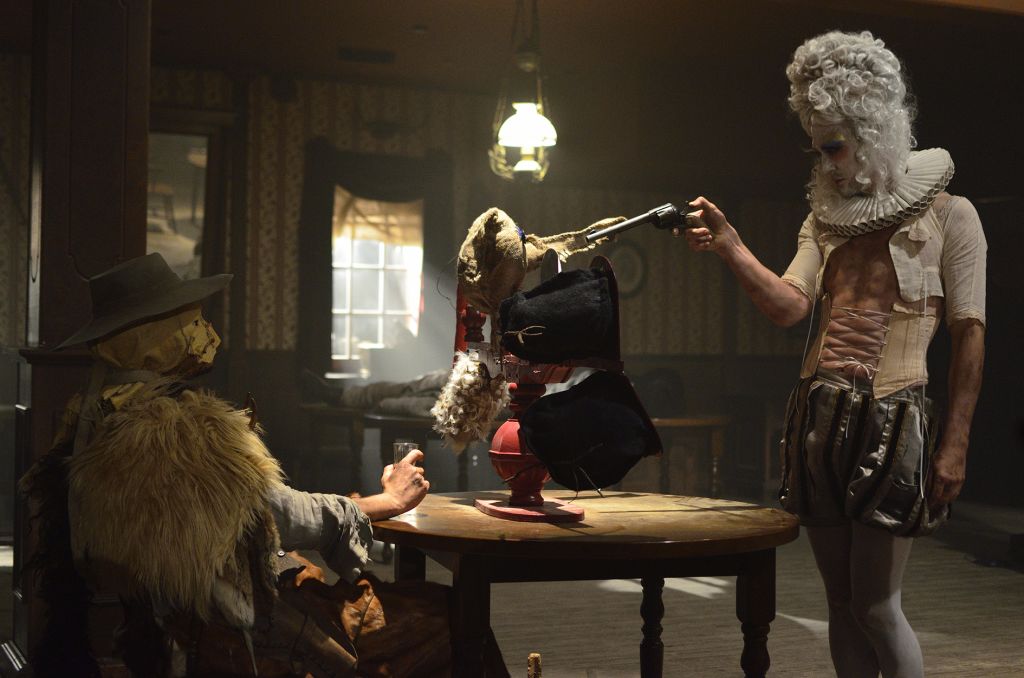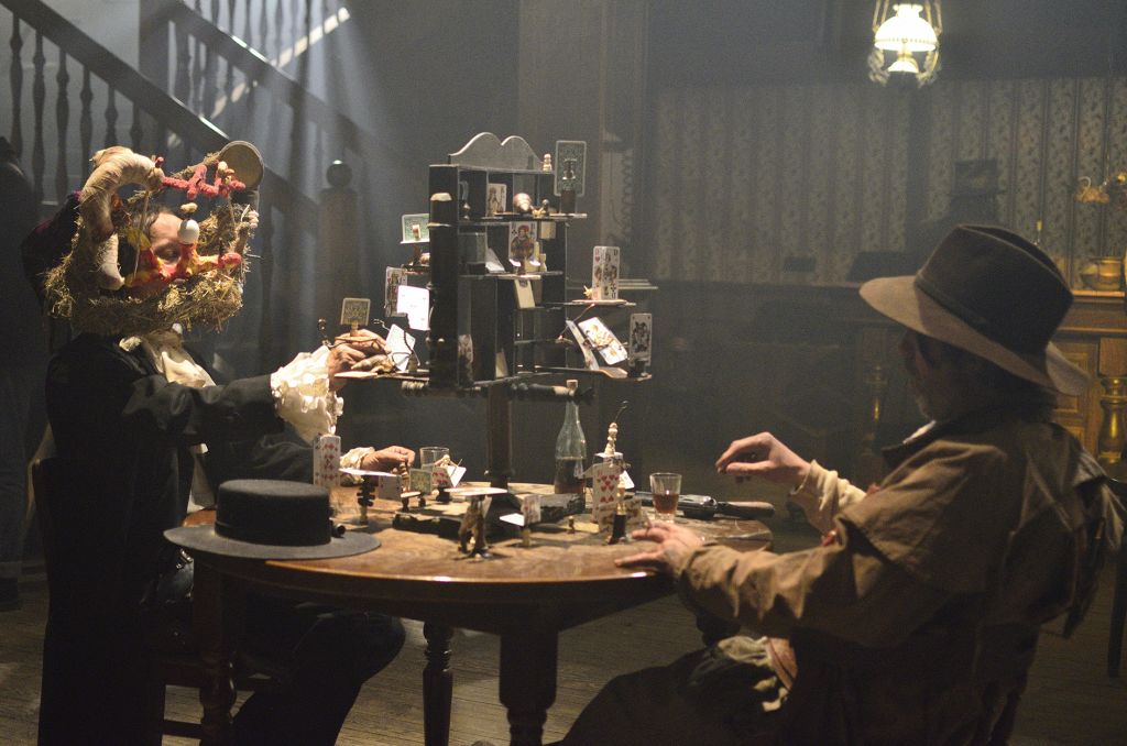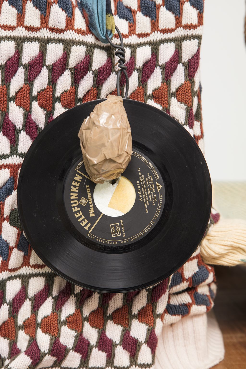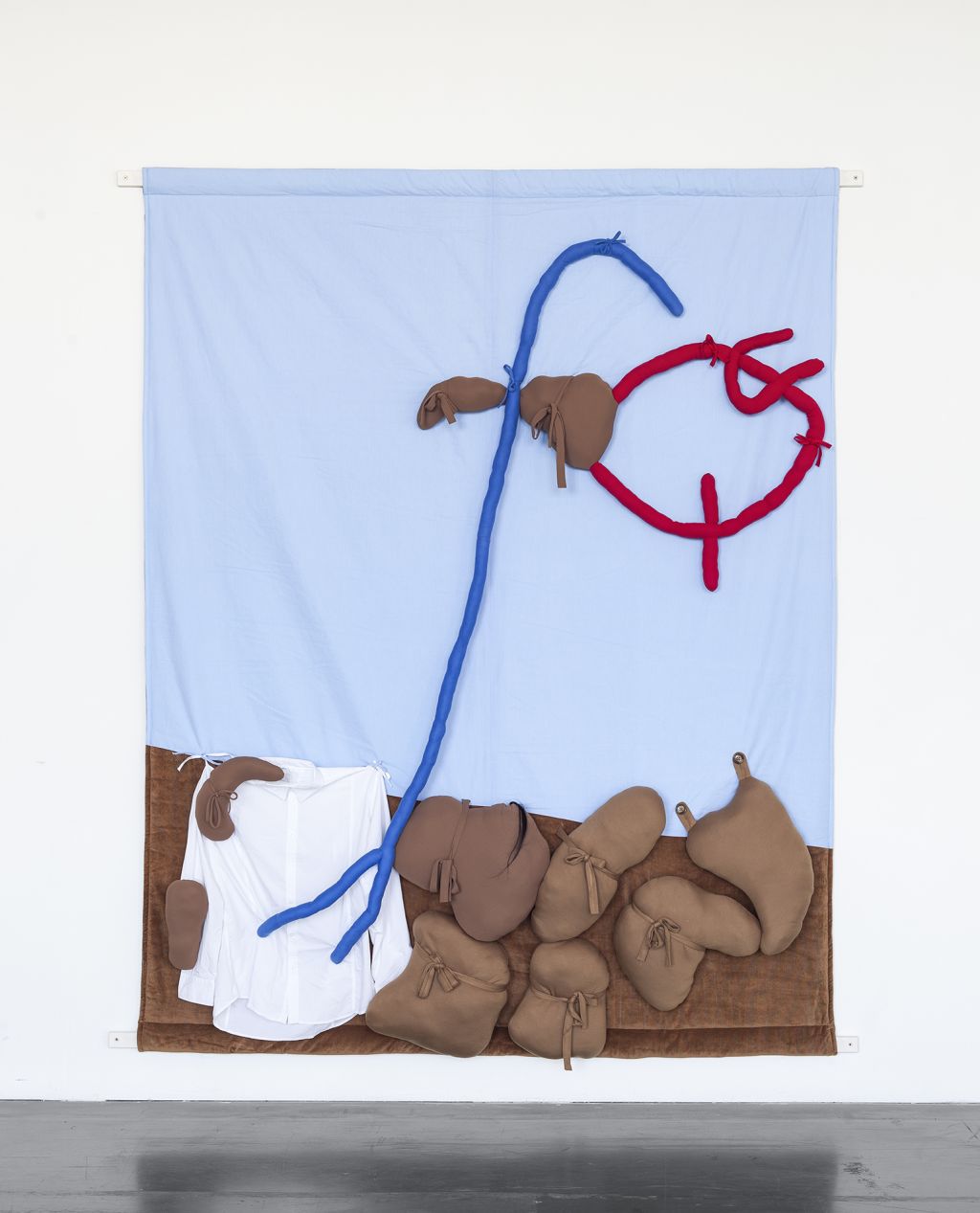 The films often play a synthesizing role in these installations. Initially created only in tandem with Bock’s live performances, recent years have seen them draw on an increasingly complex array of cinematographic typologies. Examples include Der magische Krug (The Magic Jug, 2013), which taps the aesthetic vocabulary of silent film, but also Unheil (Doom, 2018), a radical mash-up of the medieval fantasy genre. Other works, such as Unzone Eierloch (Unzone Egghole, 2013), are amalgamations of almost every genre, from experimental, horror and gangster films, road, sci-fi and Z movies, as well as romantic comedies and crime dramas. Bock’s films are often set in a schizophrenic, fairytale-like parallel world where adversaries might be strangled by the intestines spilling from the protagonist’s abdomen. Despite their freewheeling, associative play with words, objects and narrative elements, these works have all the coherence of feature films. A number of costumes and props shown in the films also reappear in the cosmos of objects that make up the surrounding installations. The props and objects become autonomous agents, bringing the film to life as unpredictable characters in their own right.