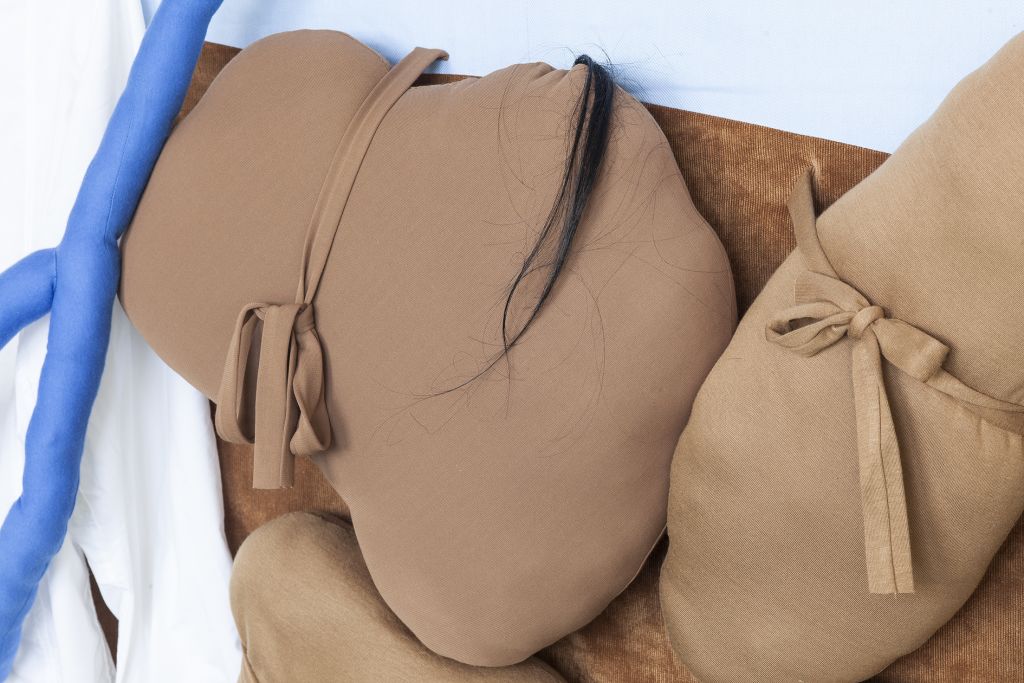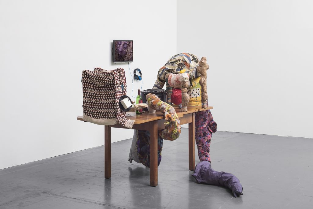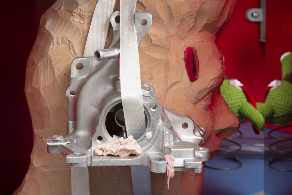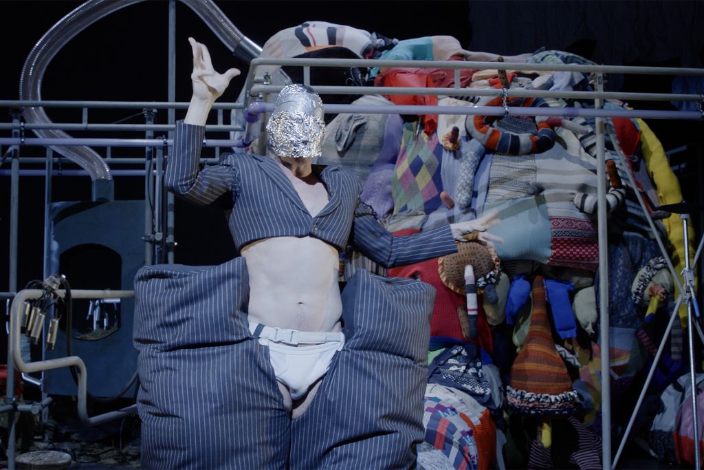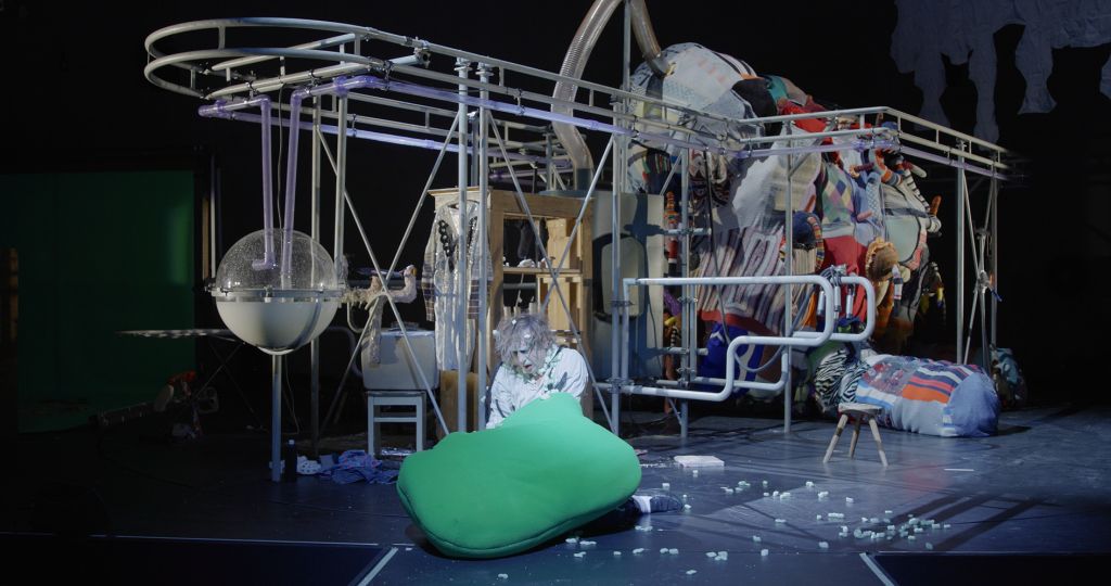 The films often play a synthesizing role in these installations. Initially created only in tandem with Bock’s live performances, recent years have seen them draw on an increasingly complex array of cinematographic typologies. Examples include Der magische Krug (The Magic Jug, 2013), which taps the aesthetic vocabulary of silent film, but also Unheil (Doom, 2018), a radical mash-up of the medieval fantasy genre. Other works, such as Unzone Eierloch (Unzone Egghole, 2013), are amalgamations of almost every genre, from experimental, horror and gangster films, road, sci-fi and Z movies, as well as romantic comedies and crime dramas. Bock’s films are often set in a schizophrenic, fairytale-like parallel world where adversaries might be strangled by the intestines spilling from the protagonist’s abdomen. Despite their freewheeling, associative play with words, objects and narrative elements, these works have all the coherence of feature films. A number of costumes and props shown in the films also reappear in the cosmos of objects that make up the surrounding installations. The props and objects become autonomous agents, bringing the film to life as unpredictable characters in their own right.