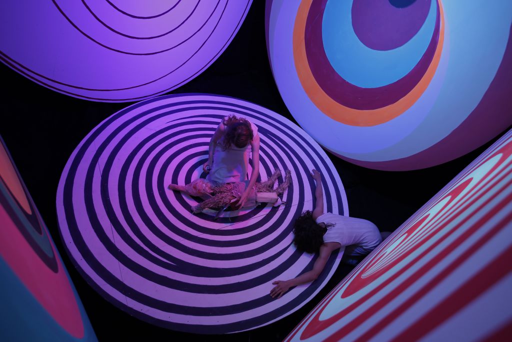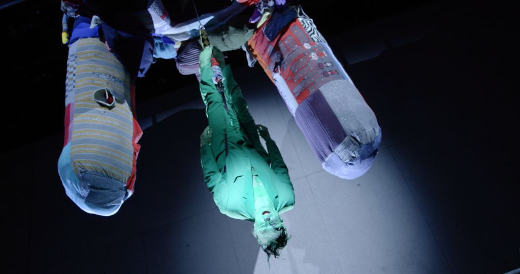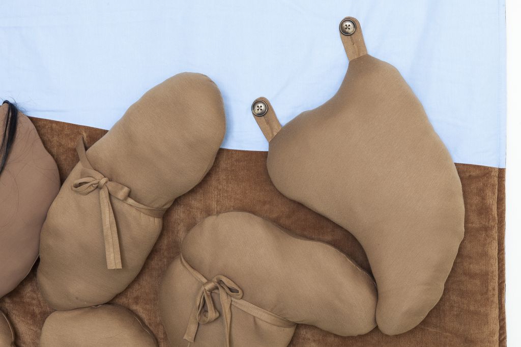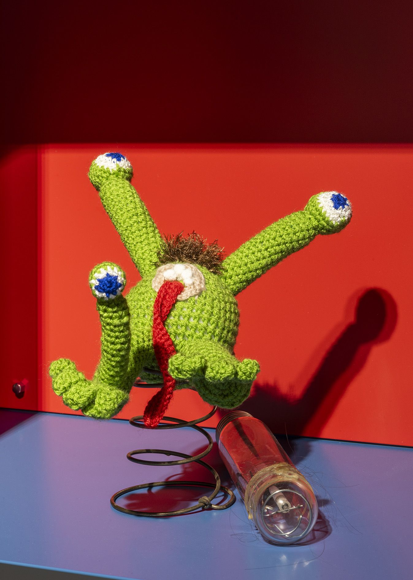The films often play a synthesizing role in these installations. Initially created only in tandem with Bock’s live performances, recent years have seen them draw on an increasingly complex array of cinematographic typologies. Examples include Der magische Krug (The Magic Jug, 2013), which taps the aesthetic vocabulary of silent film, but also Unheil (Doom, 2018), a radical mash-up of the medieval fantasy genre. Other works, such as Unzone Eierloch (Unzone Egghole, 2013), are amalgamations of almost every genre, from experimental, horror and gangster films, road, sci-fi and Z movies, as well as romantic comedies and crime dramas. Bock’s films are often set in a schizophrenic, fairytale-like parallel world where adversaries might be strangled by the intestines spilling from the protagonist’s abdomen. Despite their freewheeling, associative play with words, objects and narrative elements, these works have all the coherence of feature films. A number of costumes and props shown in the films also reappear in the cosmos of objects that make up the surrounding installations. The props and objects become autonomous agents, bringing the film to life as unpredictable characters in their own right.