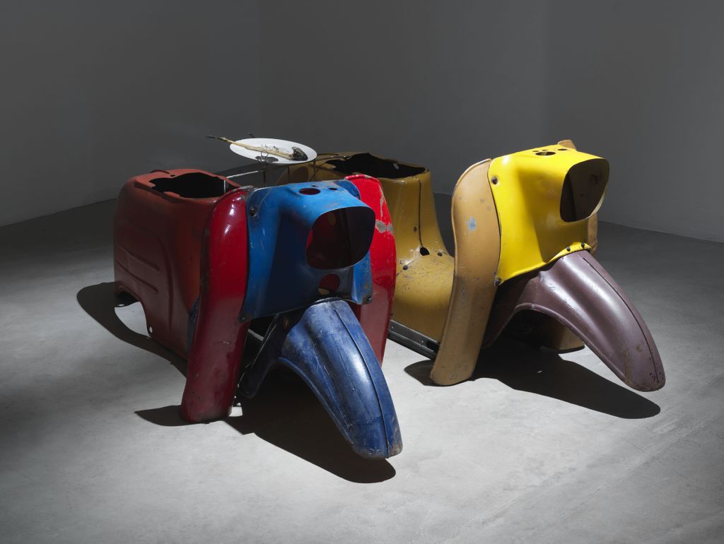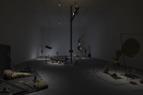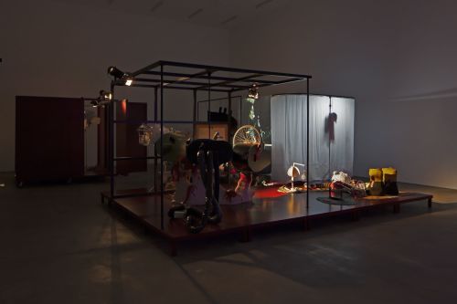 Expansive installations bearing darkly humorous, lyrical titles play a key role in the artist’s oeuvre. Quotidian objects—articles of clothing, toiletries, electrical appliances, furniture, wallpaper and sometimes even agricultural machinery—form ludicrous artistic landscapes subject to auditory and sometimes olfactory manipulation. They are also the sites for the artist’s films and performances, the so-called lectures, and can be understood as a Gesamtkunstwerk that both exposes and dissolves the traditional boundaries of the exhibition in a form of sustained institutional critique.