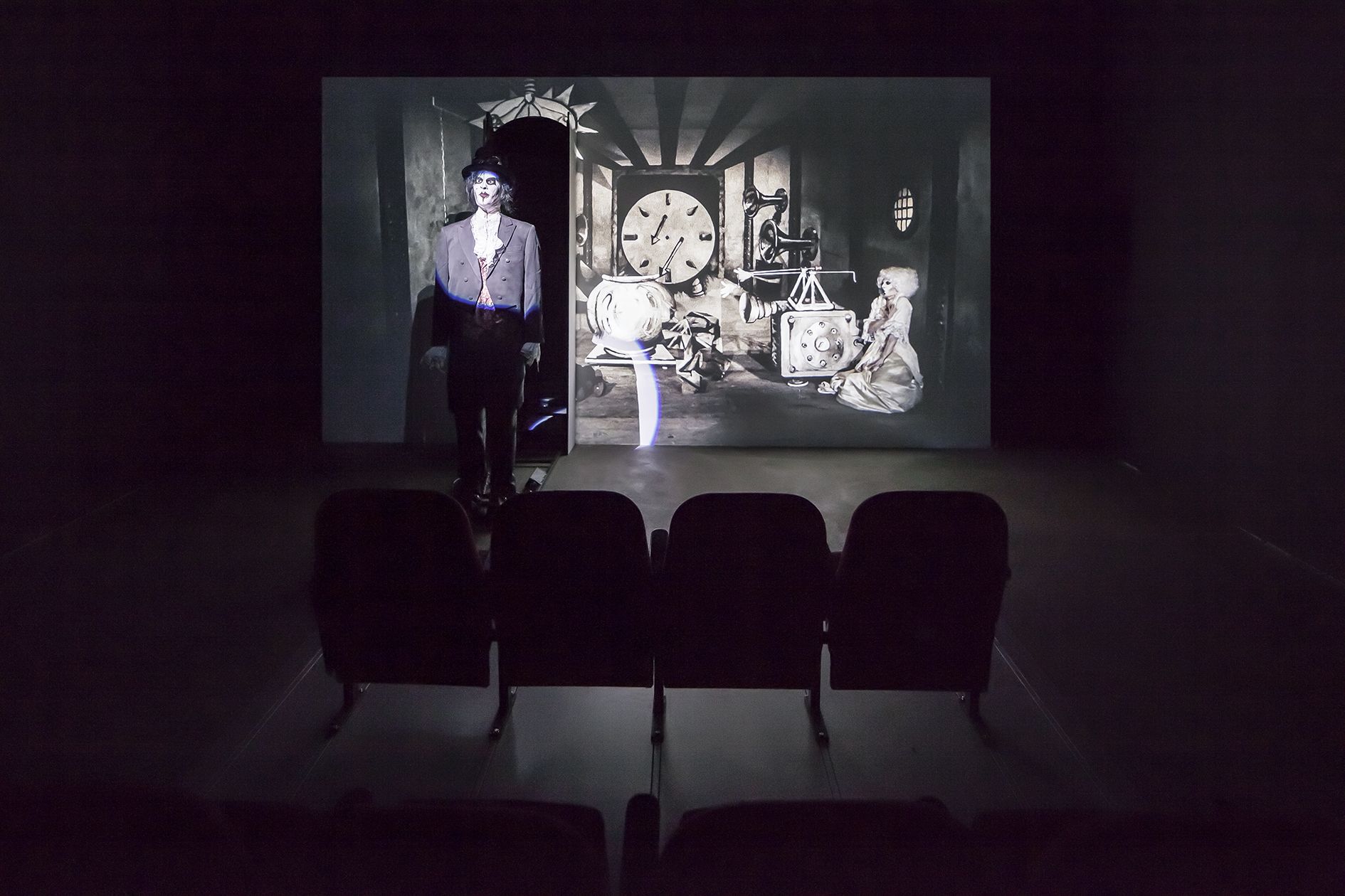 Bock calls his total works of art Summenmutationen—a neologism combining the German words for “sum” and “mutation”—an allusion to the fact that interdependencies arise between objects, actors, films and viewers and that the overall arrangement always leads to something new. The concept opens up an intricate discursive web for his works, and the word itself is inspired by the language of economics and informative yet hard-to-decipher German coinages such as Kunstwohlfahrt (art-welfare), Liebeselastizitäten (love-elasticities) or Triebgenialitäten (drive-genialities).