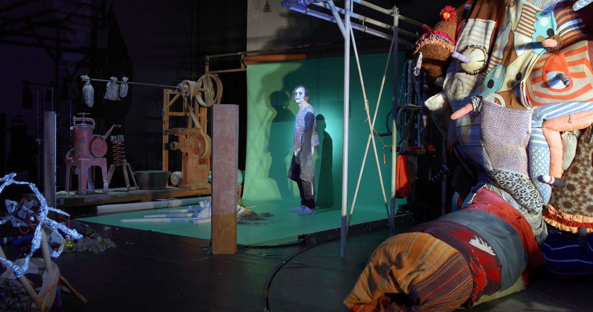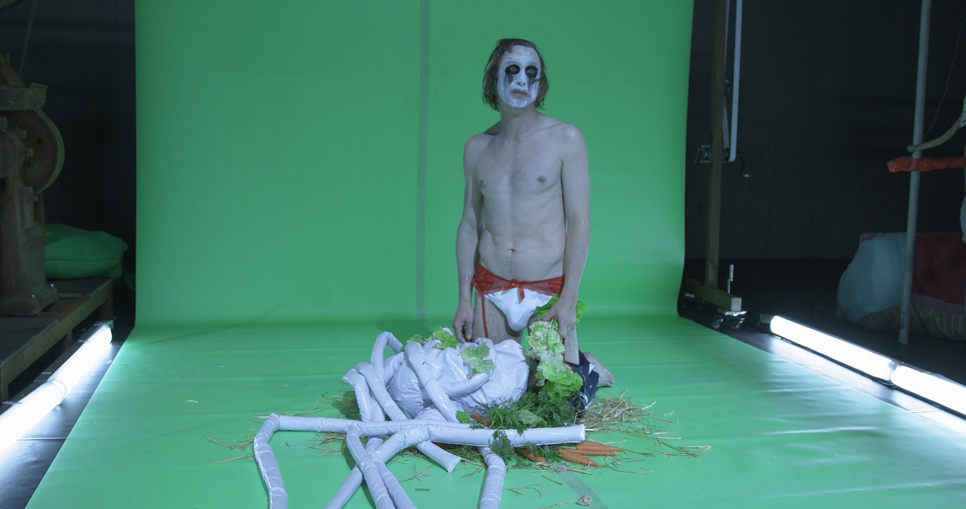 John Bock’s work clearly distances itself from the pathos of Viennese Actionism and its ideology of physical and sexual liberation. It also diverges from the explicit video works of Paul McCarthy, Tony Oursler and Mike Kelley, with whom the artist is often compared. Perhaps the biggest influence on Bock’s artistic universe can be found in Antonin Artaud’s notion of the absurd Theatre of Cruelty as a subversive counter-model to reality. Bock’s contemporary take on existentialist Dadaism defies the efficiency-loving and alignment-requiring neoliberal present with an absurd and glorious breach of boundaries and taboos. He counters the omnipresent disciplining of body and psyche with a radical staging of physicality and unrestraint. His oeuvre consistently exposes the anarchic chaos that we collectively repress.
