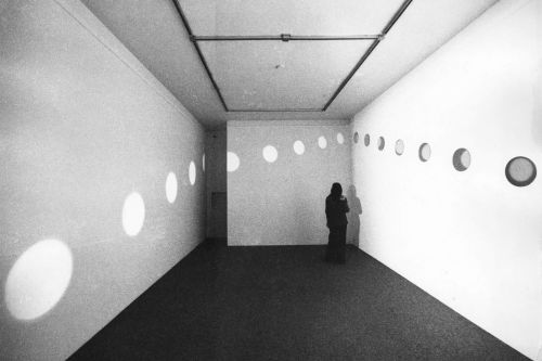 Whether emanating from the stars or plugged to electricity grids, the perceptual qualities of light fascinated Holt. The room-sized installation Mirrors of Light (1973–74) materializes light reflections and brings awareness to the body in space through the careful positioning of mirrors, a theatre spotlight, and the perceiver. In the 1980s Holt’s exploration of systems moved to the built environment with her Systems Works, sculptures connecting to usually unseen internal architectural organs. Electrical System (1982), for example, comprises more than a hundred light bulbs connected to the museum’s power system which Holt described as being “part of open-ended systems, part of the world.”