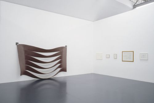 The sculptural, minimalist objects Morris developed in those same years are radically charged with performativity. Works including Three L-Beams (1965), Mirrored Cubes (1965) or Ring with Light (1965/66) deliberately enact specific moments of perceptual confusion, soliciting from the viewer a range of different “I” positions and a constant re-adjustment of their sensory experience. Morris would intensify this quality in later work by making greater use of such flexible, changeable materials as plywood, steel wire mesh and felt. The felt sculptures he made from the late 1960s onward balance on the threshold between form and anti-form. Gravity determines the shape this malleable material will ultimately take. The metal grommets used to attach these sculptures to the wall are a visible part of the work and represent a departure from the Minimalist insistence on the autonomous aura of the art object.