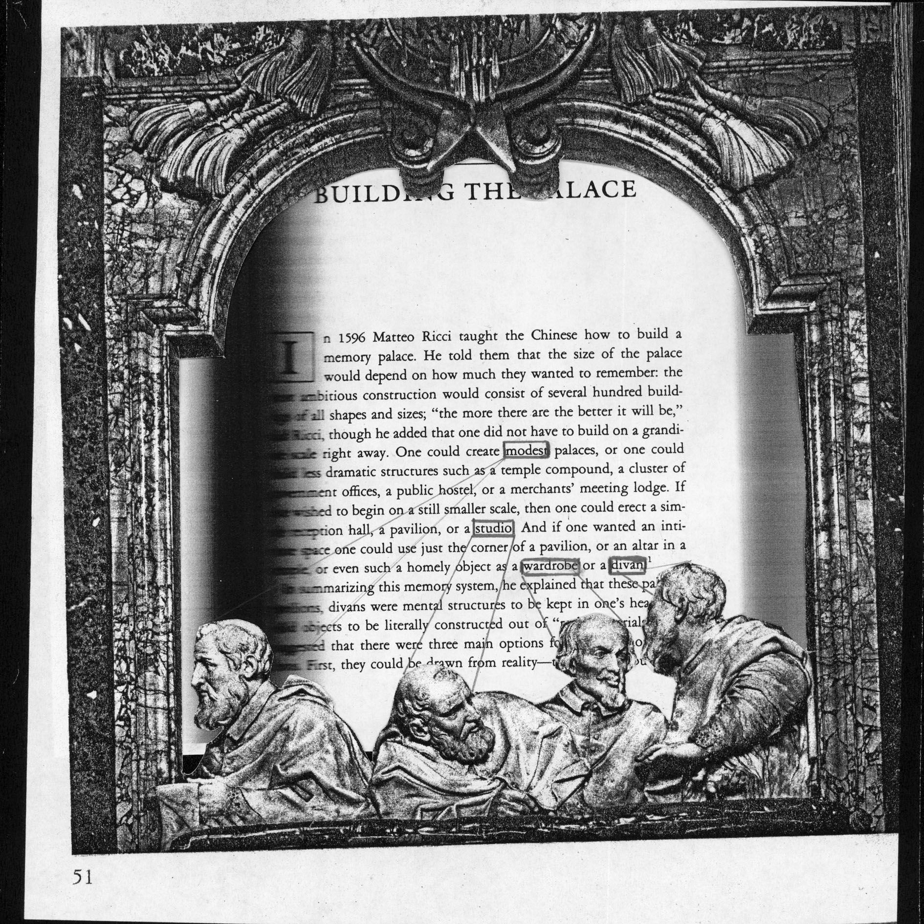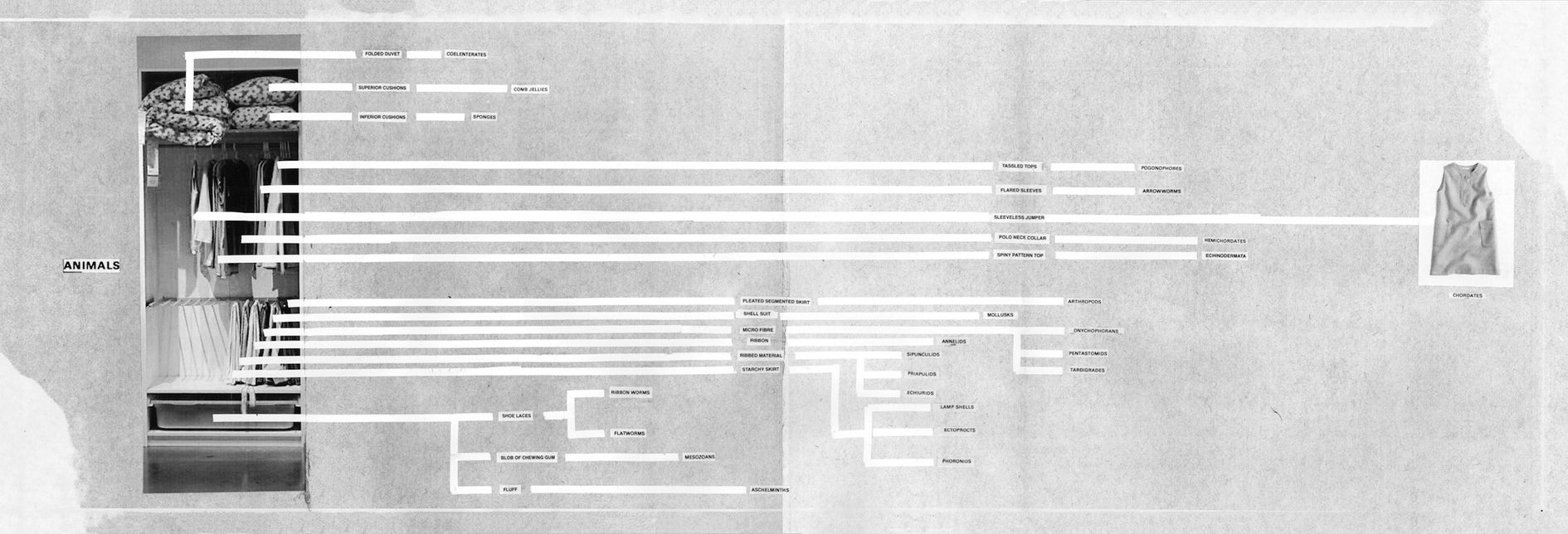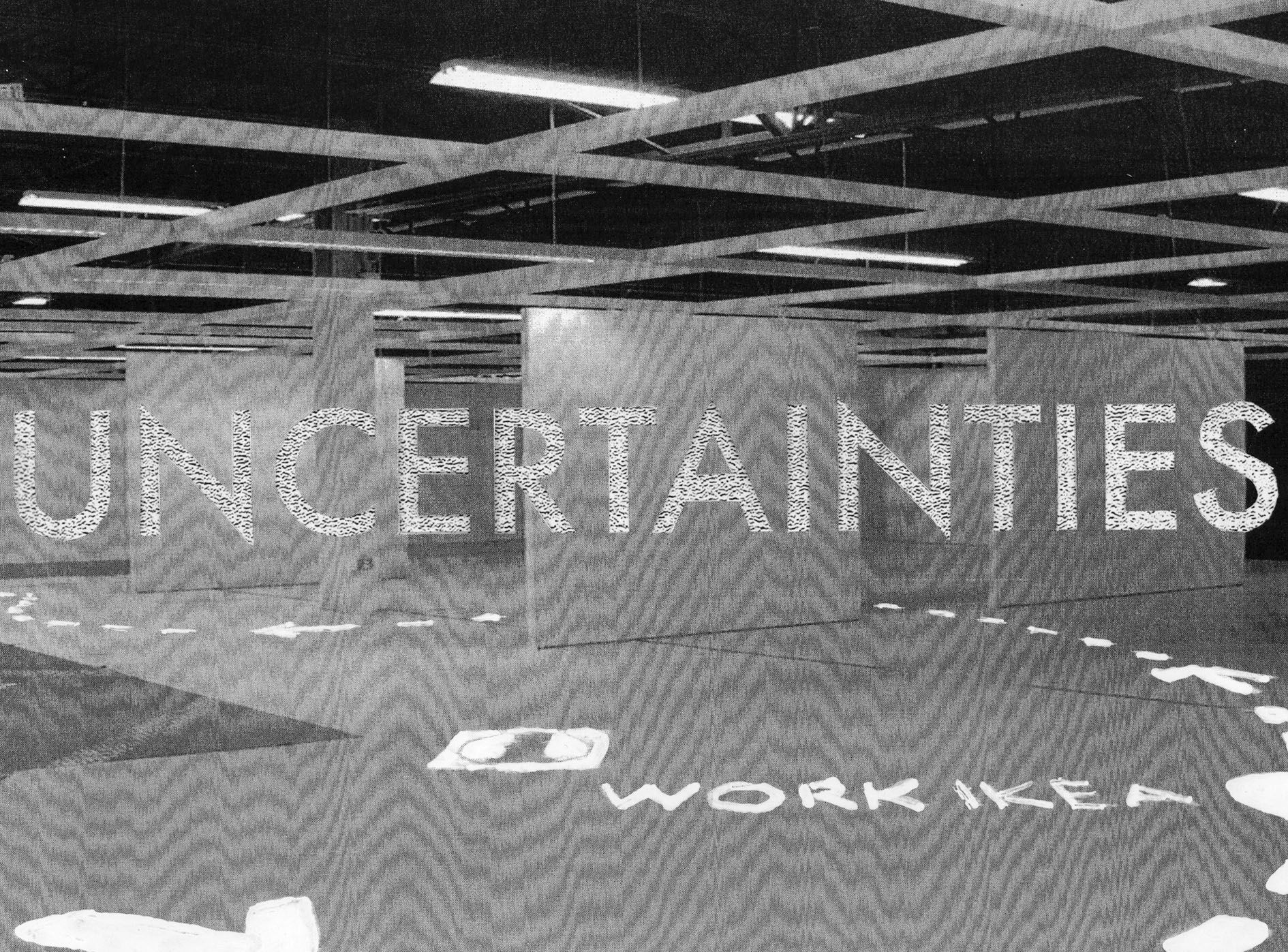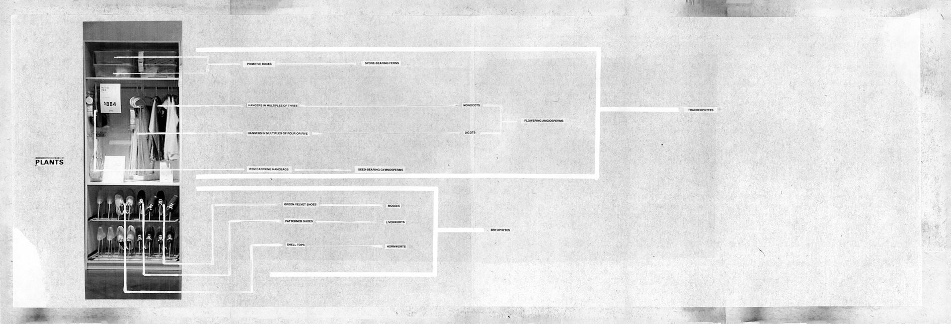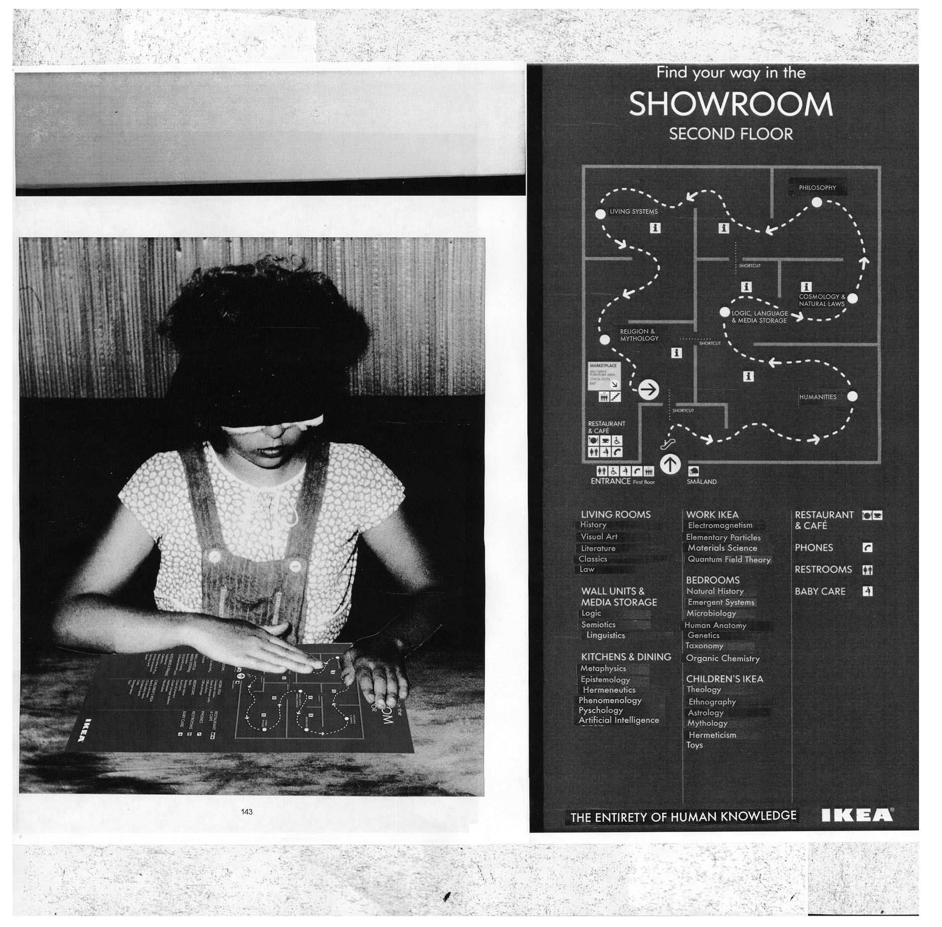 His Assembly Instructions works, two of which are presented in the exhibition, visualize the artist’s fantastically woven stories in the form of wall-mounted, photocopied collages visually connected by dotted lines penciled directly onto gallery walls. Presented in both live form as public lectures using overhead projectors and transparencies, Singh’s narratives delve into diverse disciplines such as science, pseudo-science, industry, magic, business and art history; each element is linked to another producing unexpected congruencies and points of intersection. The work Assembly Instructions (IKEA) improbably takes as its starting point the development of the internationally successful home-goods retailer, and from the standardised floor plan of the stores infers what amounts to a history of human consciousness.