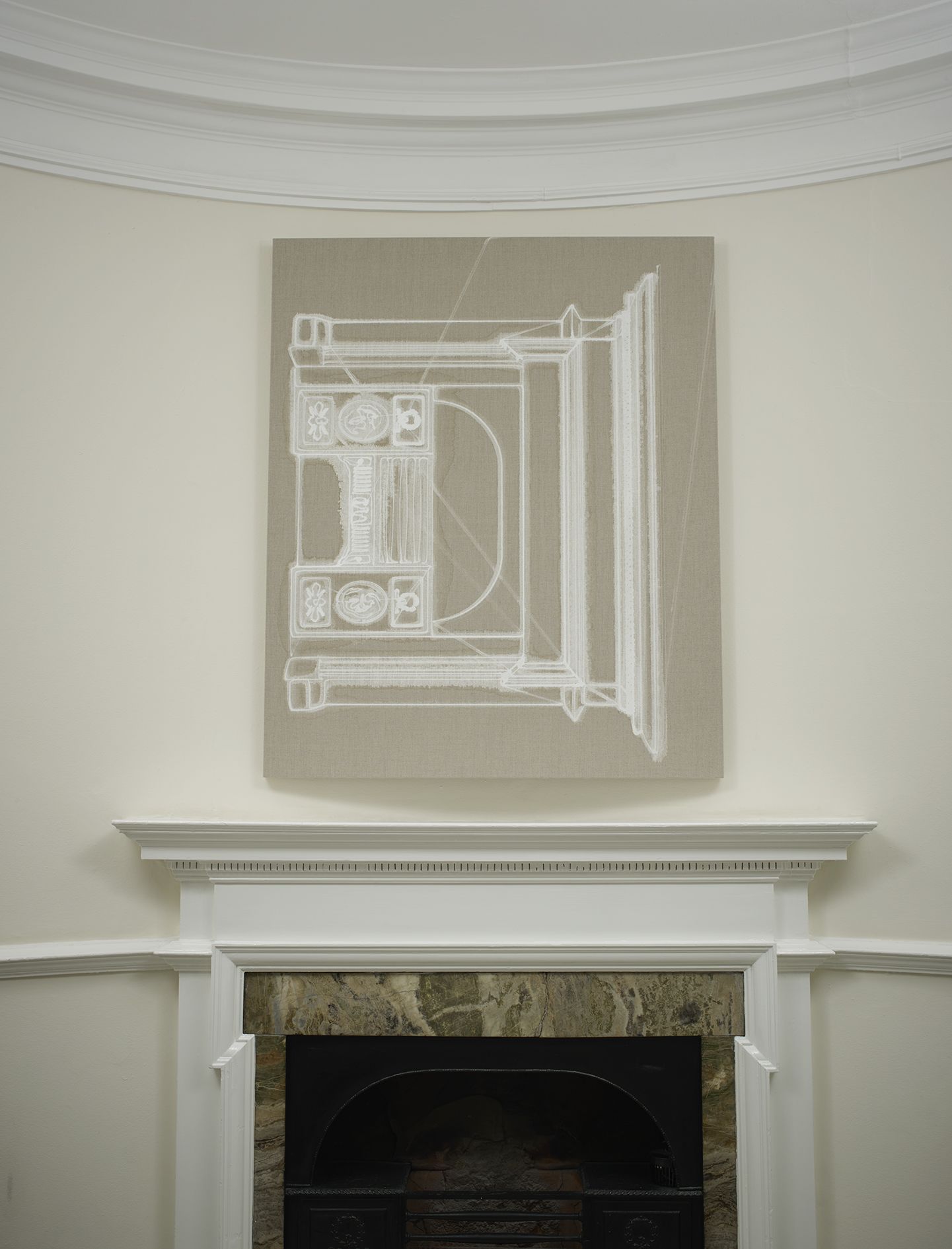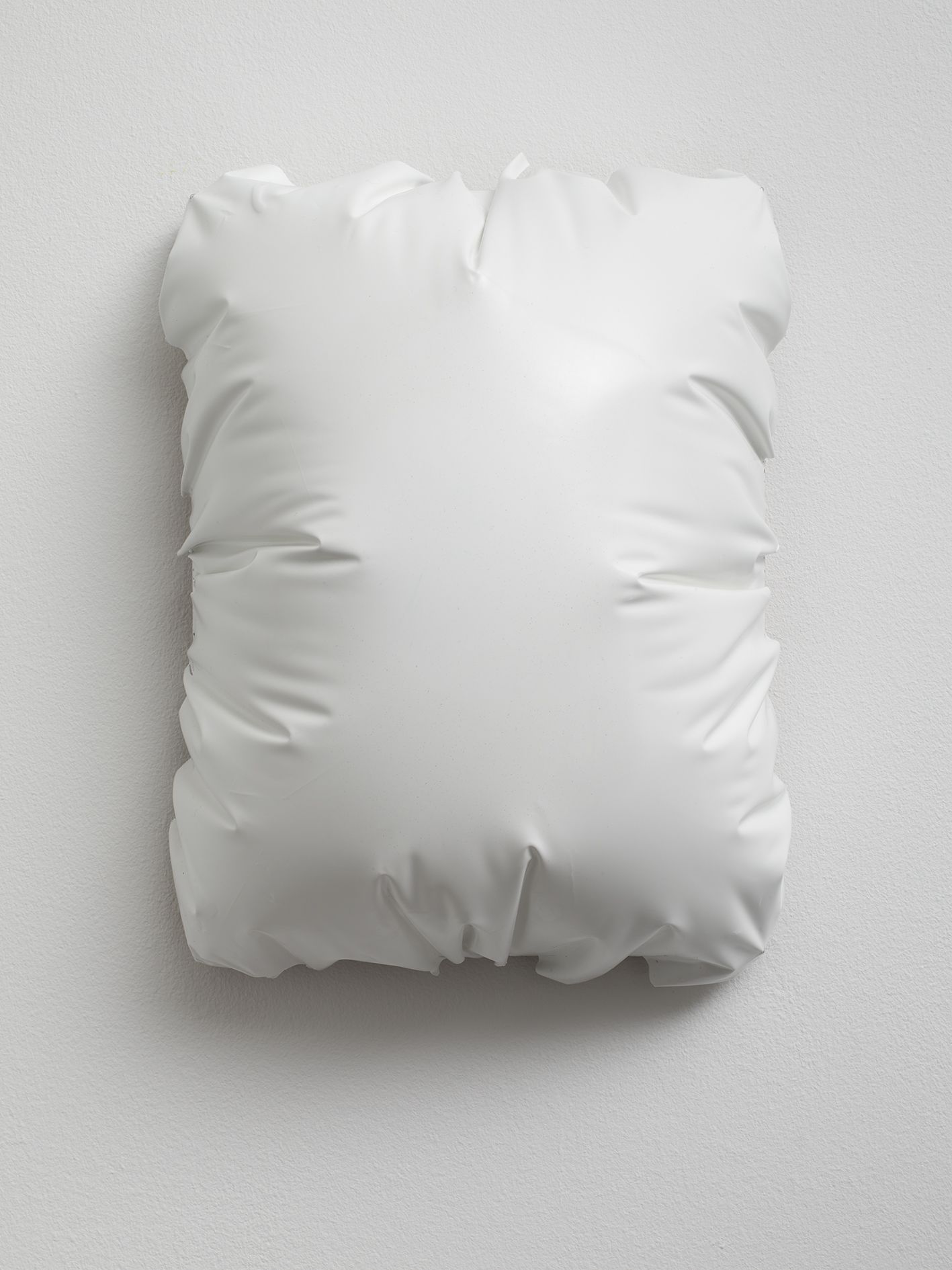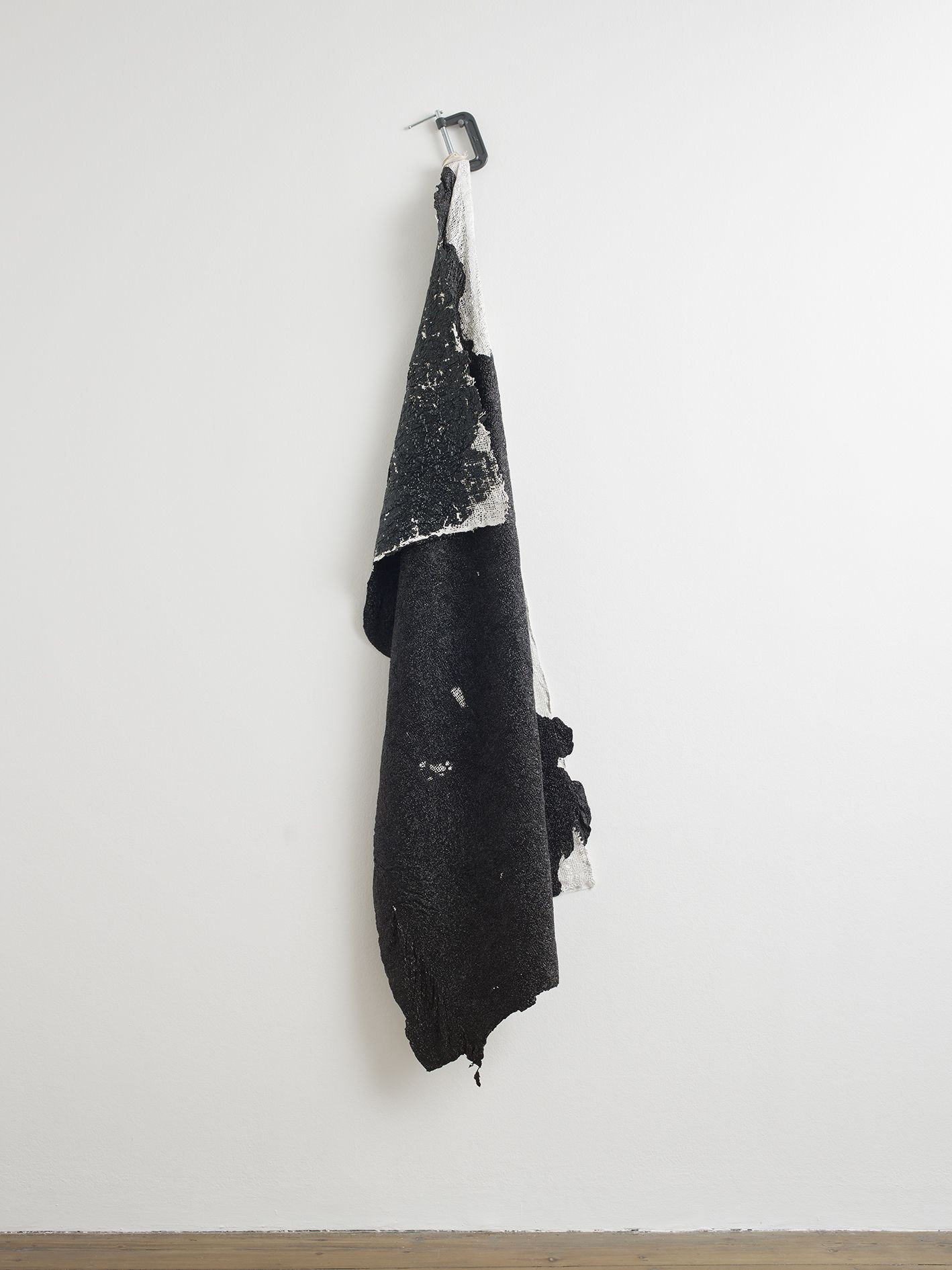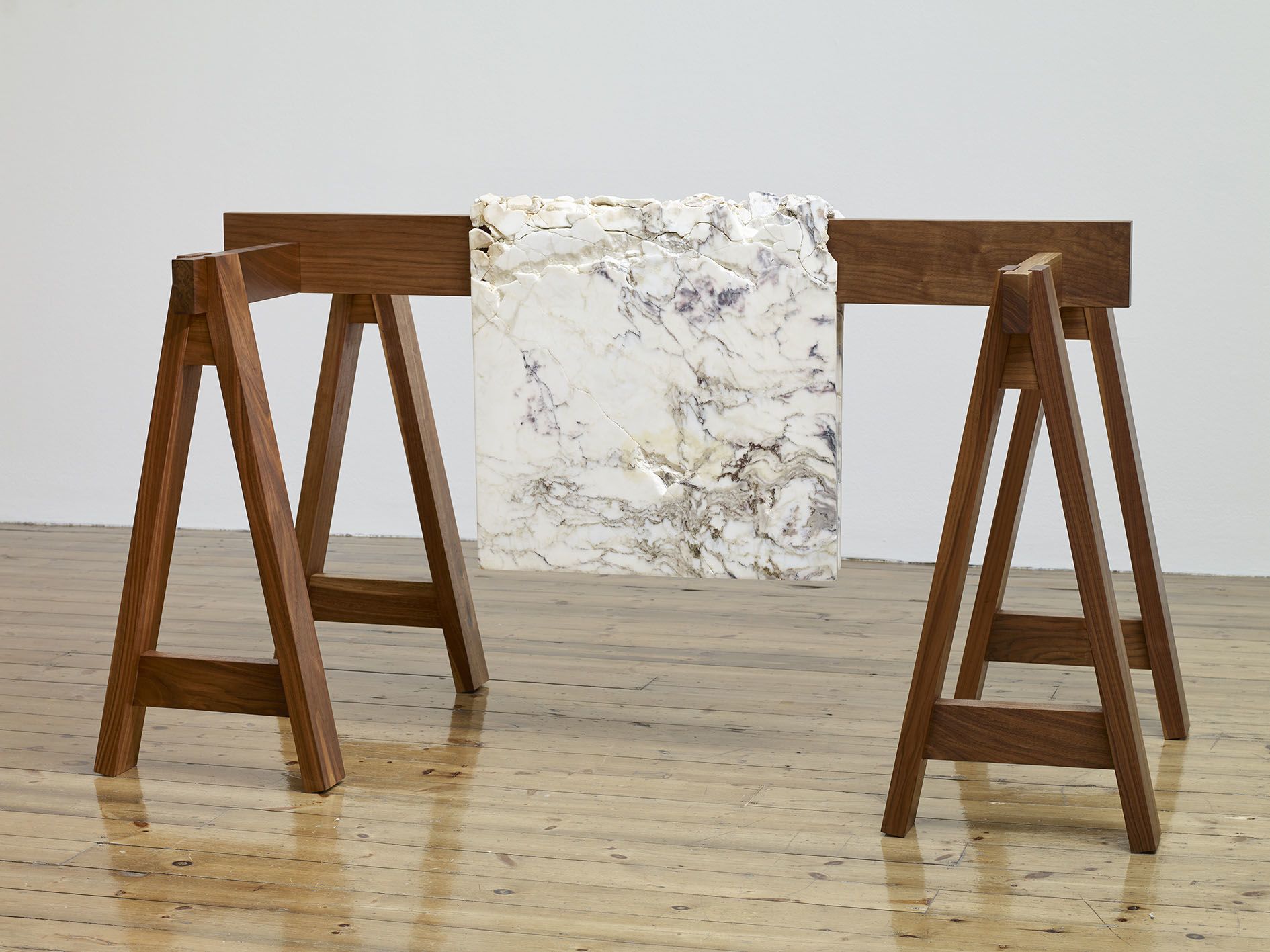 In the large gallery, Claim (from Chesterfield Sofa) (2014) appears at first glance like two objects—a sofa and, with a sly nod to that interior-decorating cliché, the painting above it in matching neutral colours. But the work is in fact a single, integrated sculpture, with both objects unified by the large piece of canvas that they share. The canvas spreads and grows from the stretcher, invading the interior of the room, perversely merging with the sofa. The paradoxical mood of this work extends to Draped Marble (Fior di Pesco Apuano) (2015), where a thin slab of marble hangs from a pristine sawhorse as if it were a wet towel. Cracking where it folds, yet just maintaining its form, the marble fails to live up to its essence as a material prized for hardness and permanence.