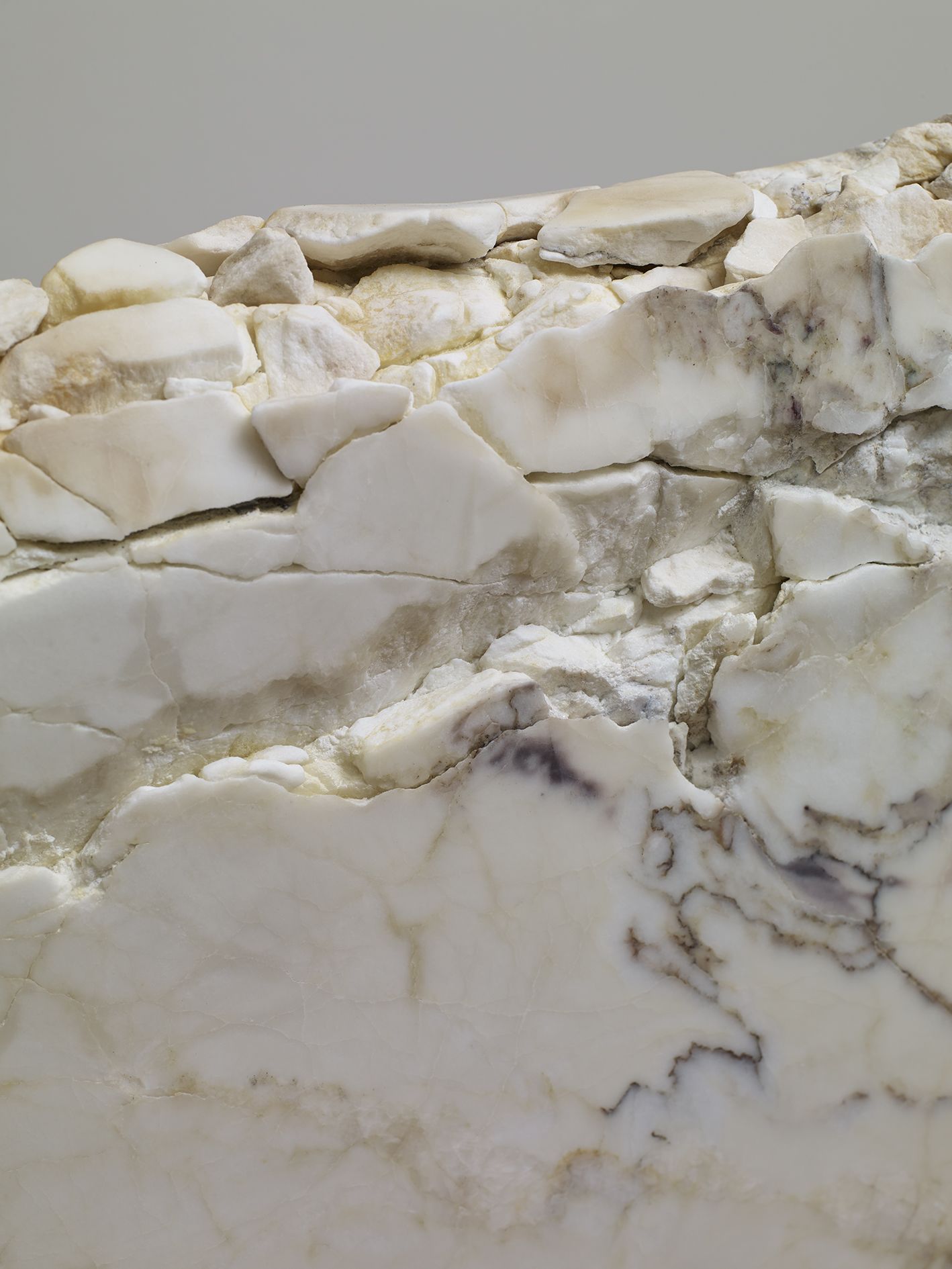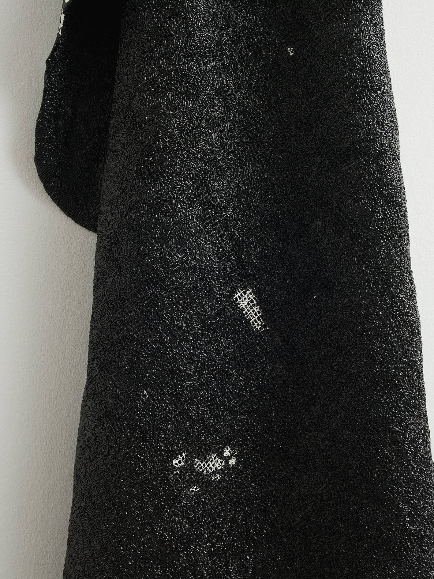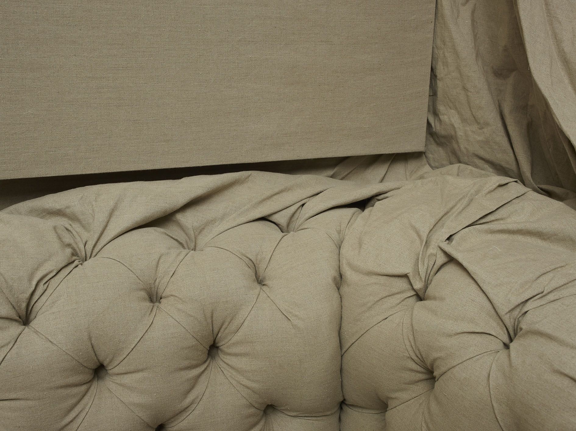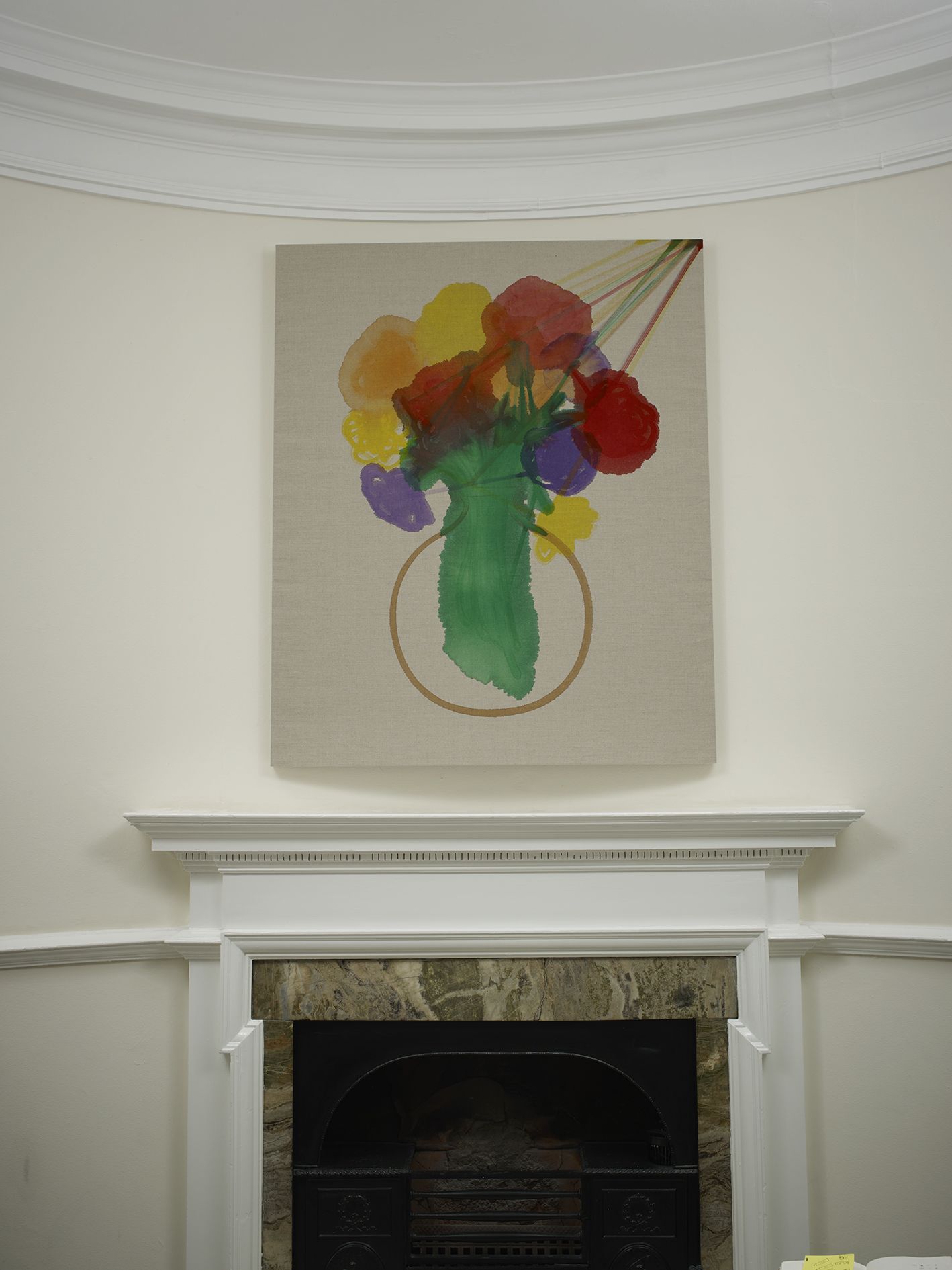In the large gallery, Claim (from Chesterfield Sofa) (2014) appears at first glance like two objects—a sofa and, with a sly nod to that interior-decorating cliché, the painting above it in matching neutral colours. But the work is in fact a single, integrated sculpture, with both objects unified by the large piece of canvas that they share. The canvas spreads and grows from the stretcher, invading the interior of the room, perversely merging with the sofa. The paradoxical mood of this work extends to Draped Marble (Fior di Pesco Apuano) (2015), where a thin slab of marble hangs from a pristine sawhorse as if it were a wet towel. Cracking where it folds, yet just maintaining its form, the marble fails to live up to its essence as a material prized for hardness and permanence.