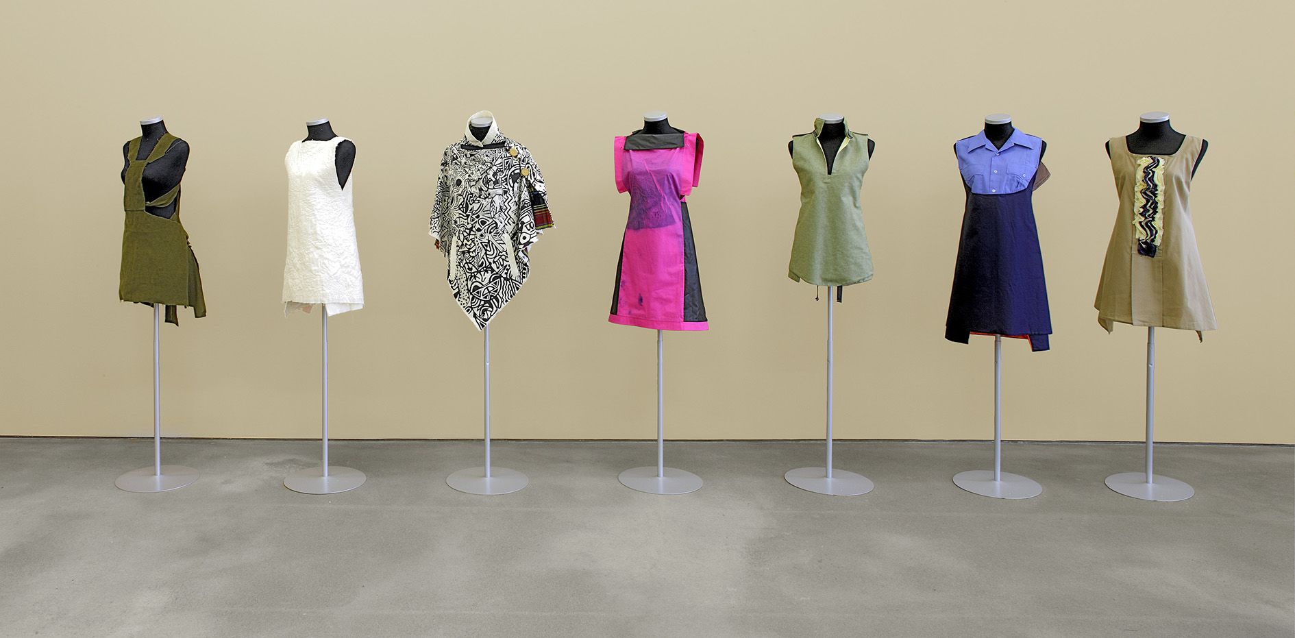 Each smock conforms to the same basic shape and form, but there is nonetheless an infinite array of colour, texture and pattern possibilities, as their method of manufacture derives from Zittel’s principle that ‘rules make us more creative’. Since it was founded in 2007, almost 300 smocks have been made by the collective. The process of making is collaborative, as each smocker is given license to interpret and rework Zittel’s designs according to their own interests and skills. The clothes range from monochrome simplicity to lurid dazzle, and from formal elegance to sculptural inventiveness. Yet though each smock is completely unique, they have all been designed and made with a sense of universal functionality in mind; suiting most body sizes or shapes, and offering socially appropriate attire in both casual and formal settings, the smock is conceived as a garment for everywoman (and maybe everyman) at any time.