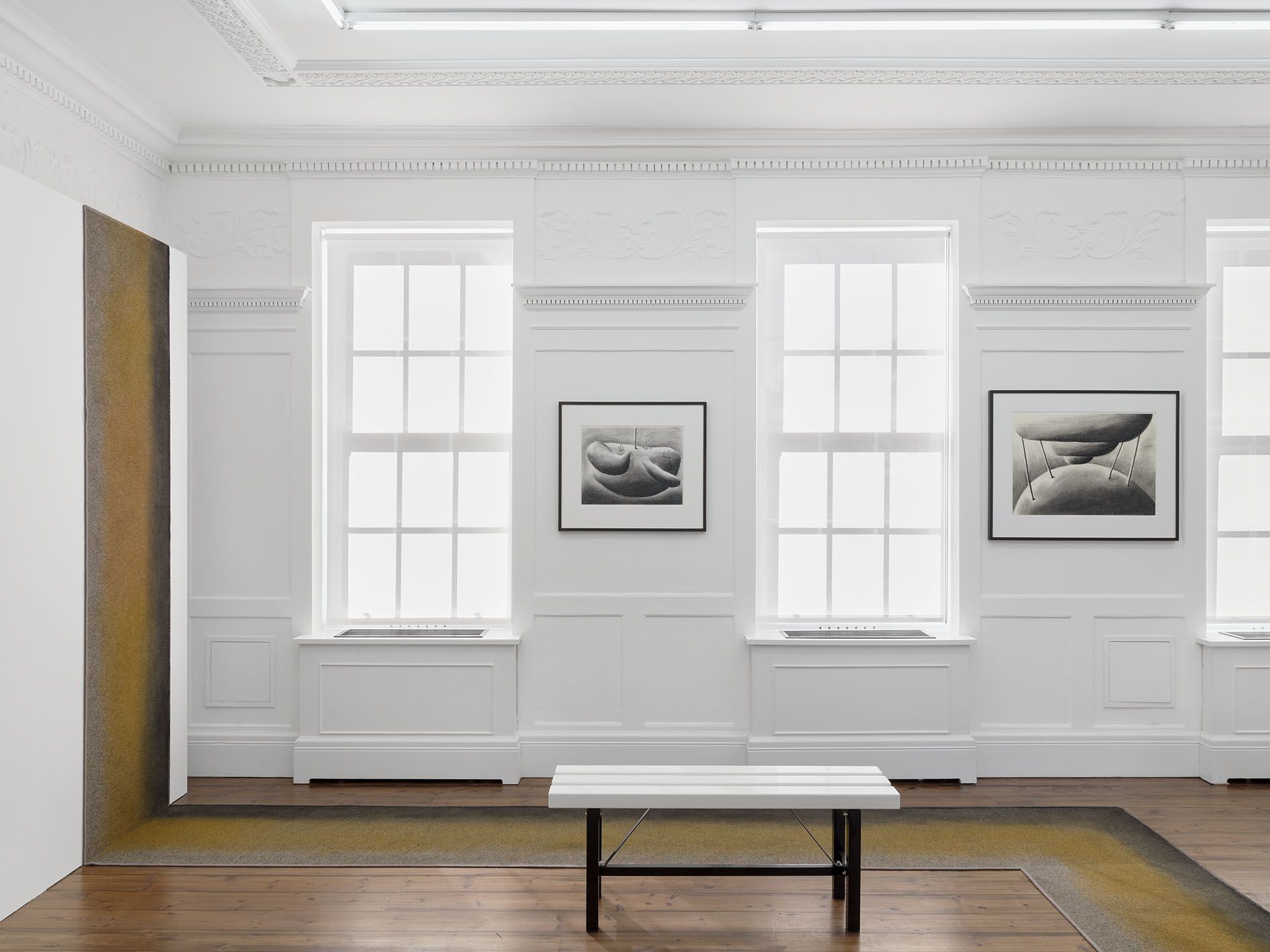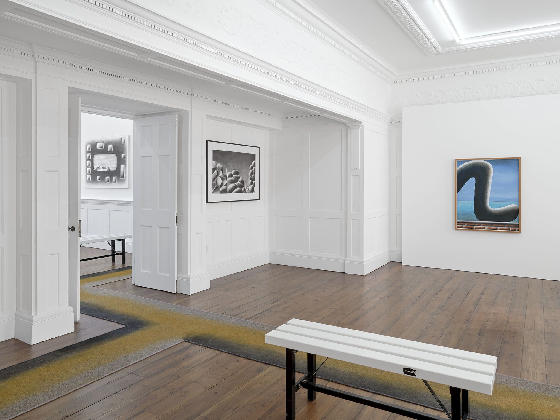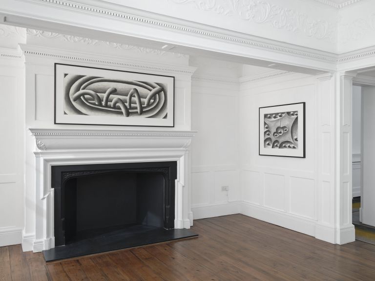 Land’s End is Andreas Schulze's fourth solo exhibition at the London gallery and features works on paper: rarely shown black-and-white charcoal drawings from the 1980s are presented alongside new colored acrylic works, which, due to their thick application of color, are characterized as paintings by the artist. Together, both bodies of works highlight Schulze’s playful and experimental way of creating illusionistic, ambiguous pictorial spaces – parables of the supposedly familiar and the uncannily bizarre – and demonstrate the artist’s creative, compositional process, as many of the black-and-white drawings were later realized as paintings.