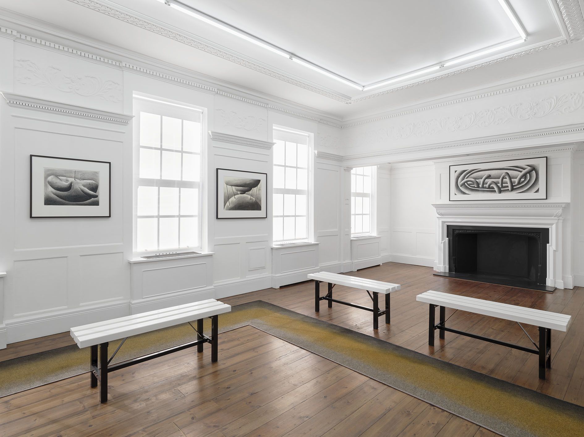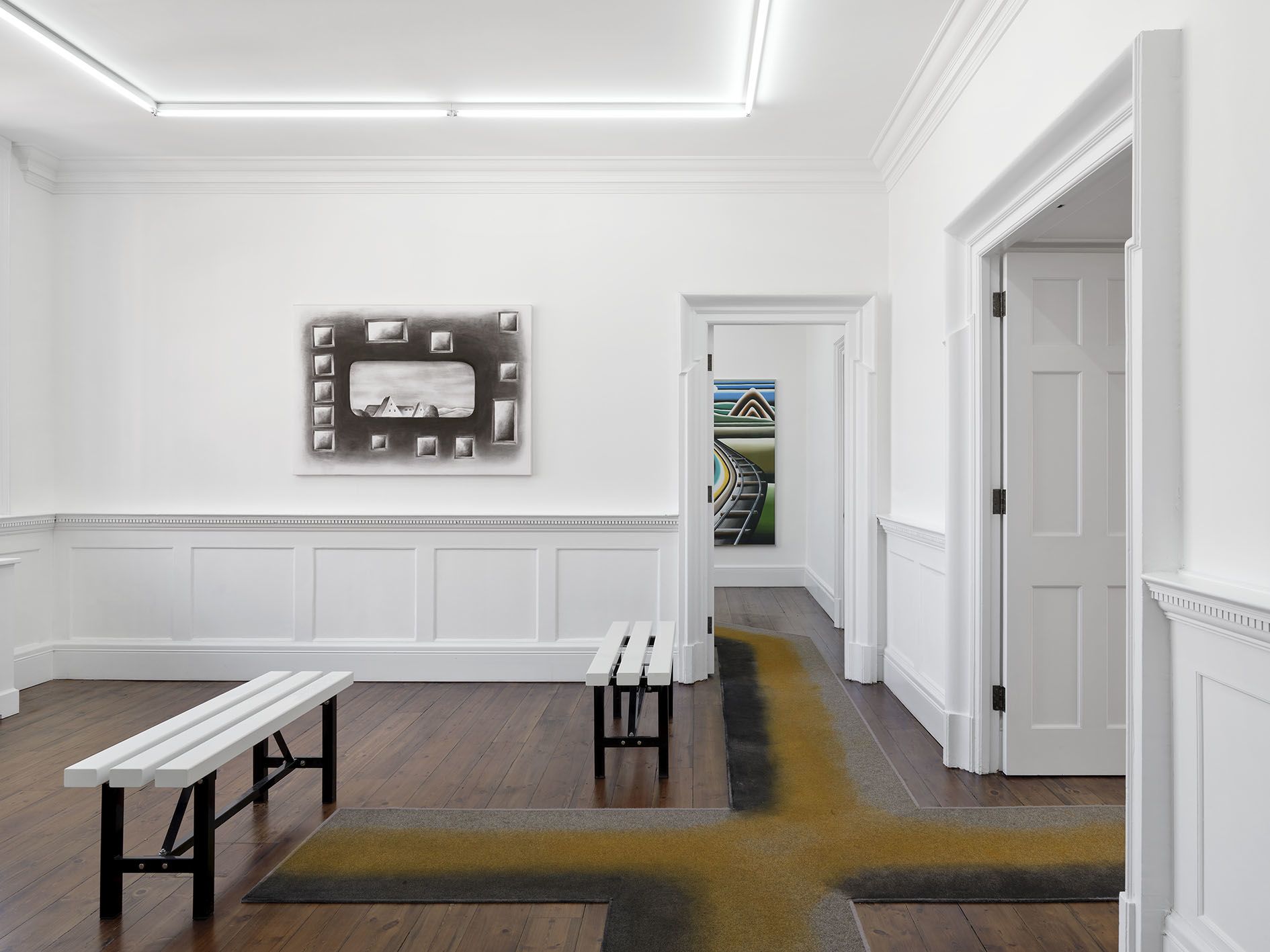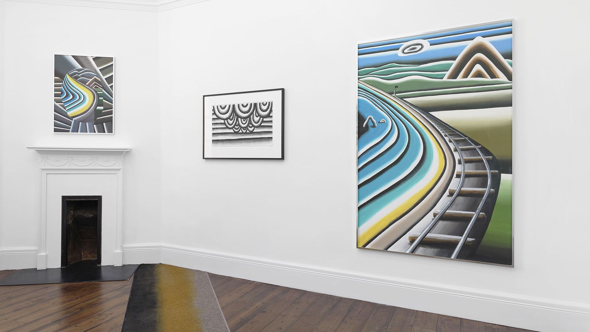 Land’s End is Andreas Schulze's fourth solo exhibition at the London gallery and features works on paper: rarely shown black-and-white charcoal drawings from the 1980s are presented alongside new colored acrylic works, which, due to their thick application of color, are characterized as paintings by the artist. Together, both bodies of works highlight Schulze’s playful and experimental way of creating illusionistic, ambiguous pictorial spaces – parables of the supposedly familiar and the uncannily bizarre – and demonstrate the artist’s creative, compositional process, as many of the black-and-white drawings were later realized as paintings.