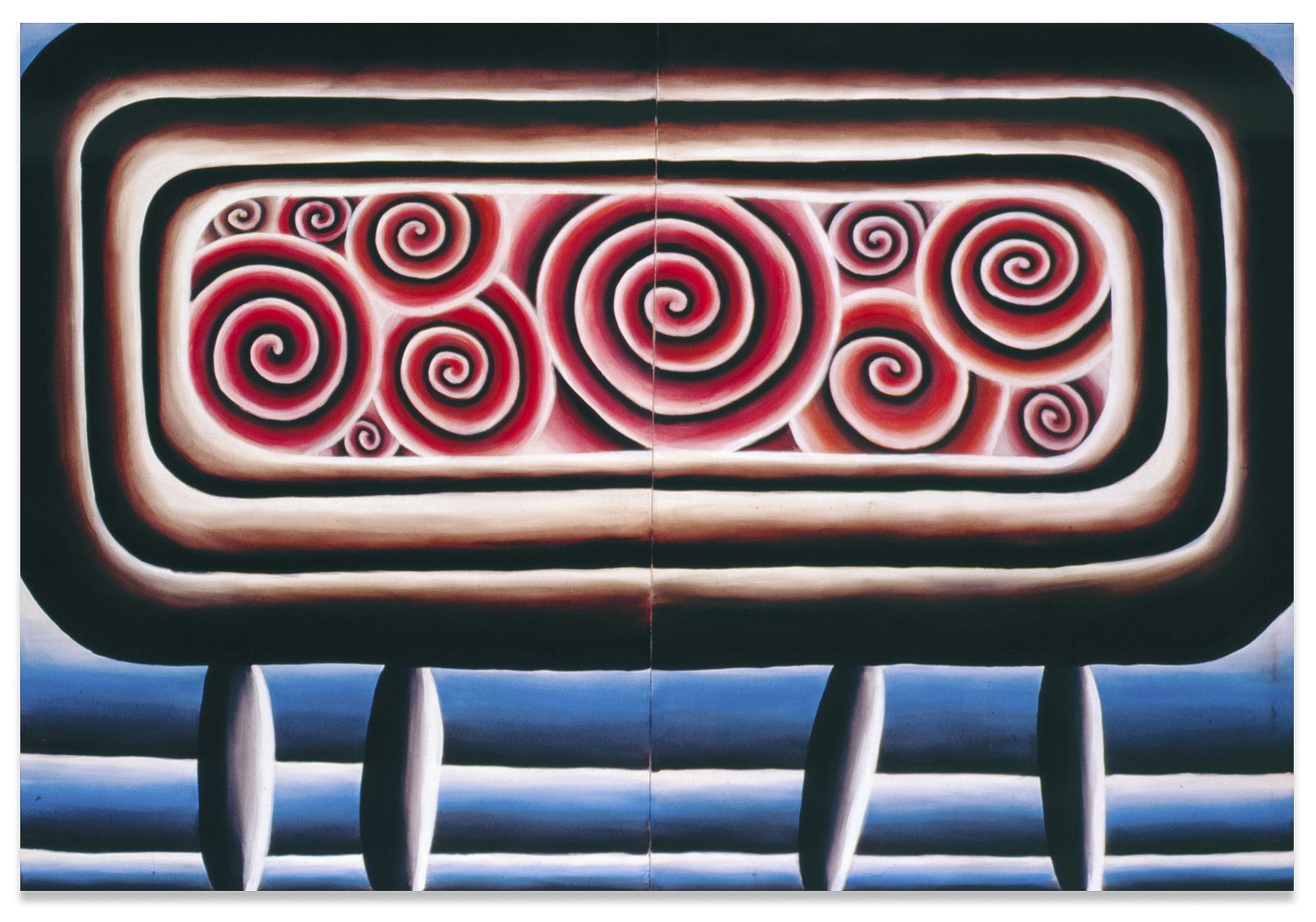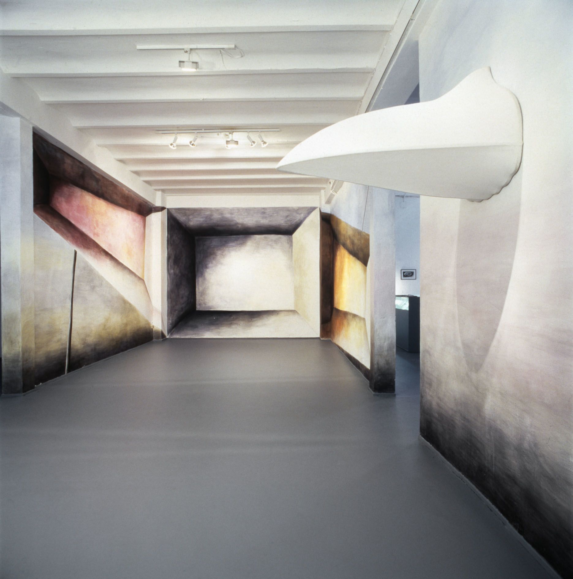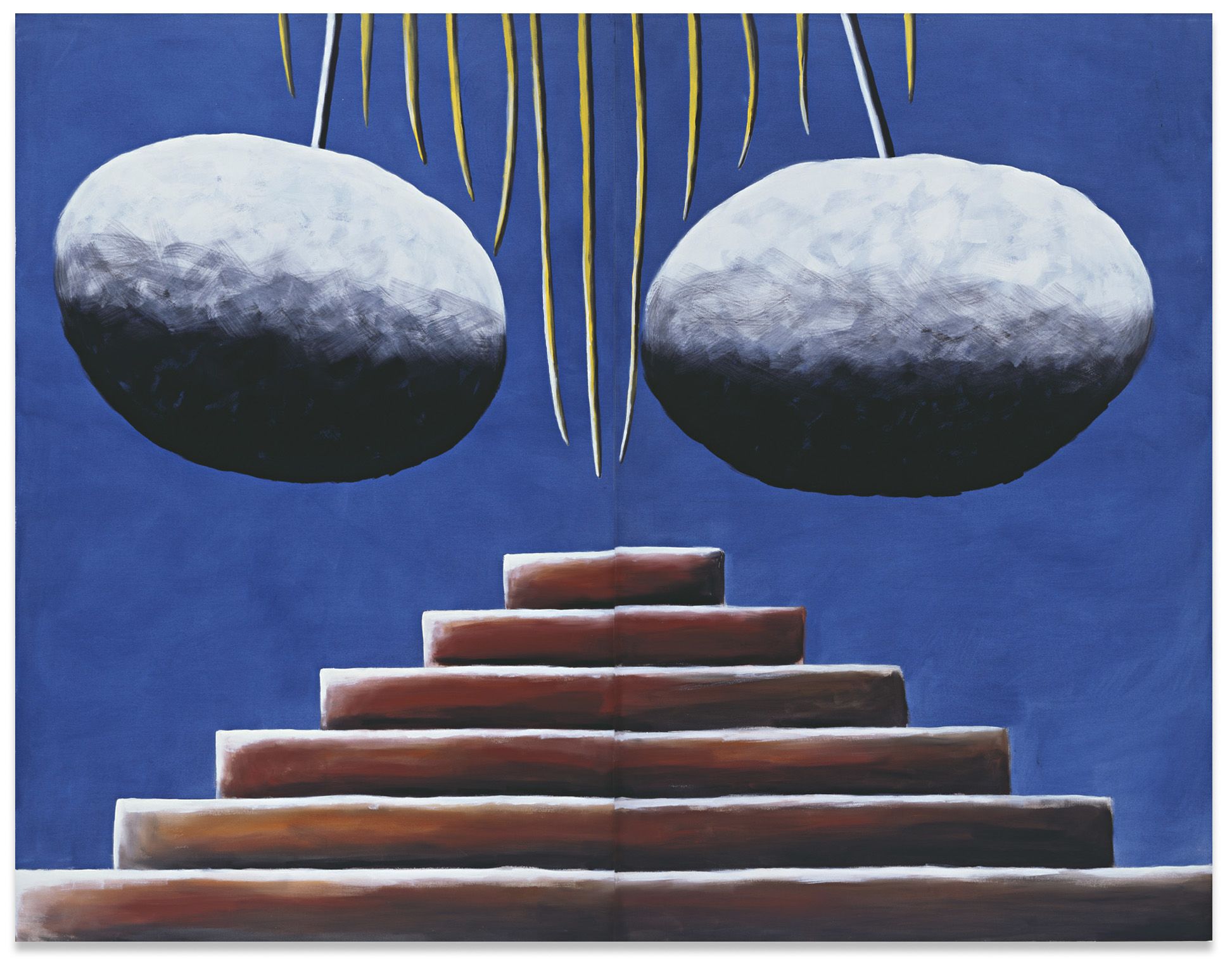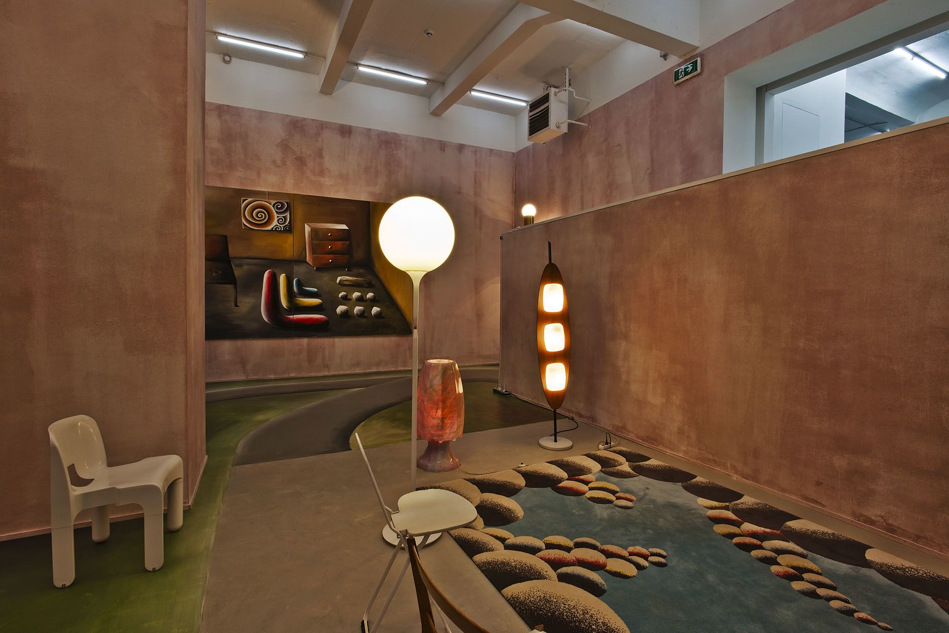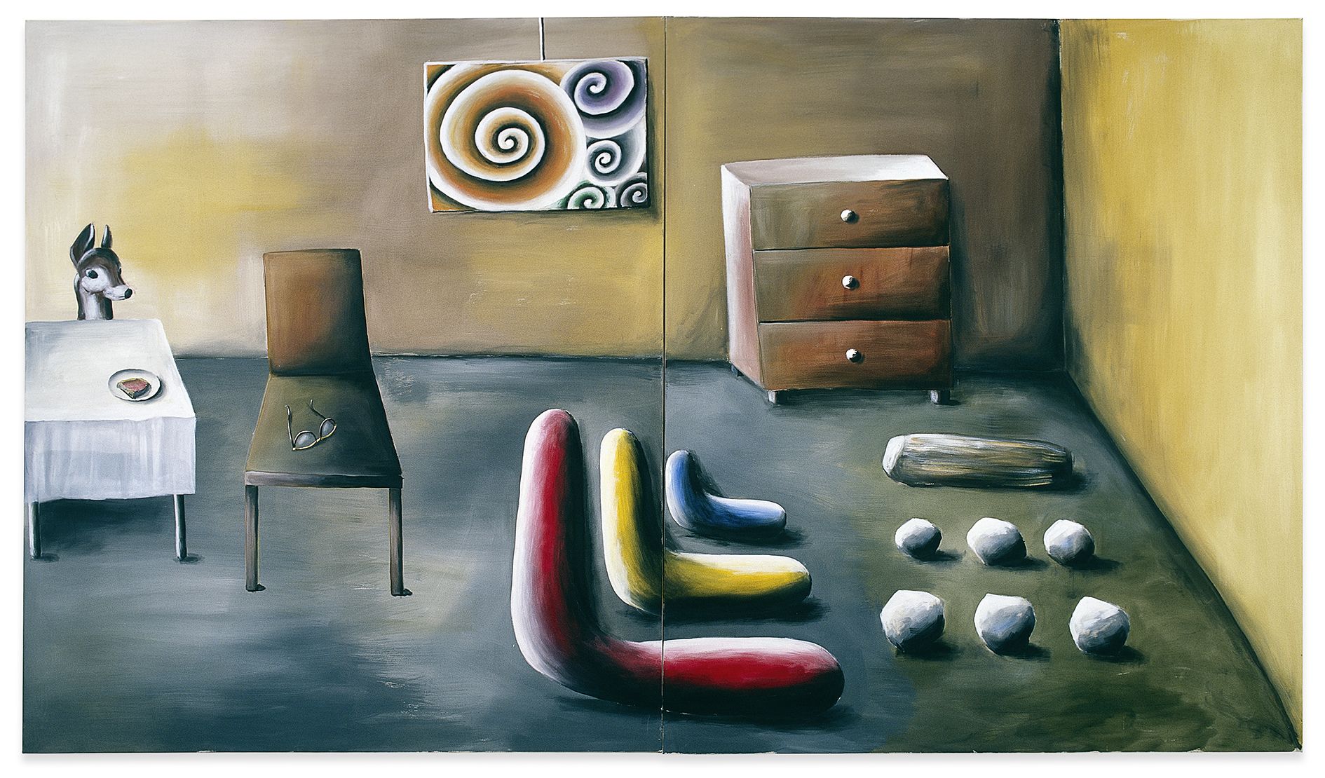 The arrangement is, no doubt, alluding to a famous collaborative piece of Gerhard Richter and Blinky Palermo, two influential Dusseldorf artists of a previous generation whose work for Schulze – having studied at Dusseldorf Academy, and today teaching there – inevitably is closely familiar, yet somewhat distant in timbre and sense of humor (though Blinky Palermo, with his romantic wit, certainly is less distant than the soberly determined Richter). Palermo had made a wall painting at Galerie Heiner Friedrich in Munich: He had painted one wall in so-called Munich yellow, a kind of ochre, with the exception of white stripes delineating the fringes; on the opposite wall, he reversed the order of colors (Wandmalerei auf gegenüberliegenden Wänden (Mural Painting on Opposite Walls, 1971)). Shortly after, in the Cologne space of Friedrich, Palermo extended the dominating yellow color on all of the room’s walls, while Richter contributed two bronze, face-cast portraits of himself and Palermo placed on slender, cubic man-size steles, all covered in grey oil paint and facing one another (Zwei Skulpturen für einen Raum von Palermo (Two Sculptures for a Room by Palermo, 1971)). It’s hard to decide whether the work is just provocatively flirting with self-aggrandizement or actually going a step further, towards a tongue-in-cheek self-entombment: Death masks suppressing a laugh. But in any case, in his cover version, Schulze replaces the theme of male artist friendship with narcissist tautology; the restrained lead grey of Richter’s sculptures with the joyously unrestrained, bright colors of the ceramics; Palermo’s heavy ochre with a type of pistachio reminiscent of 1970s bathroom appliances; and the poised calmness of the precursors’ collaboration with a psychedelic penchant for the aesthetically unclean.