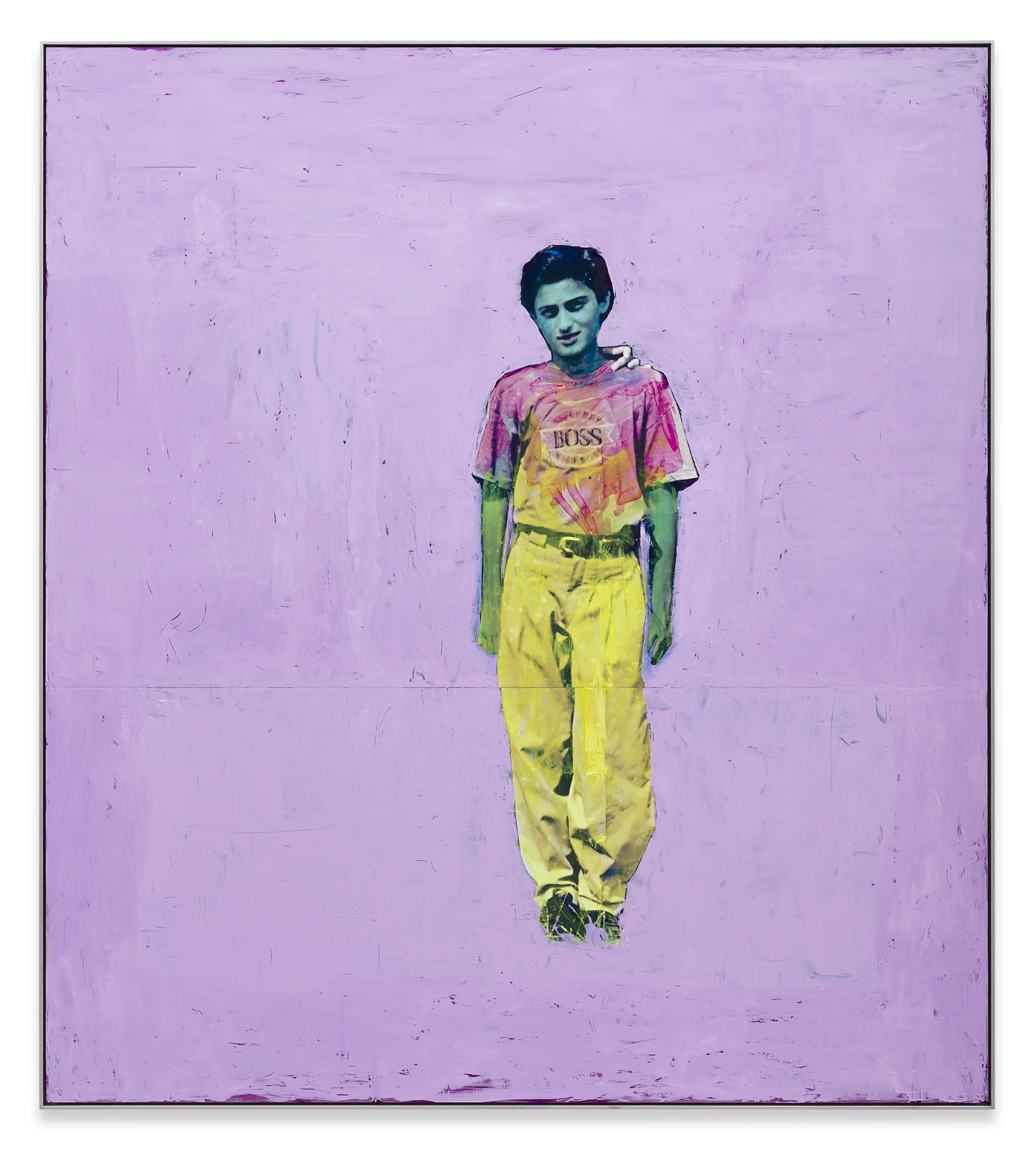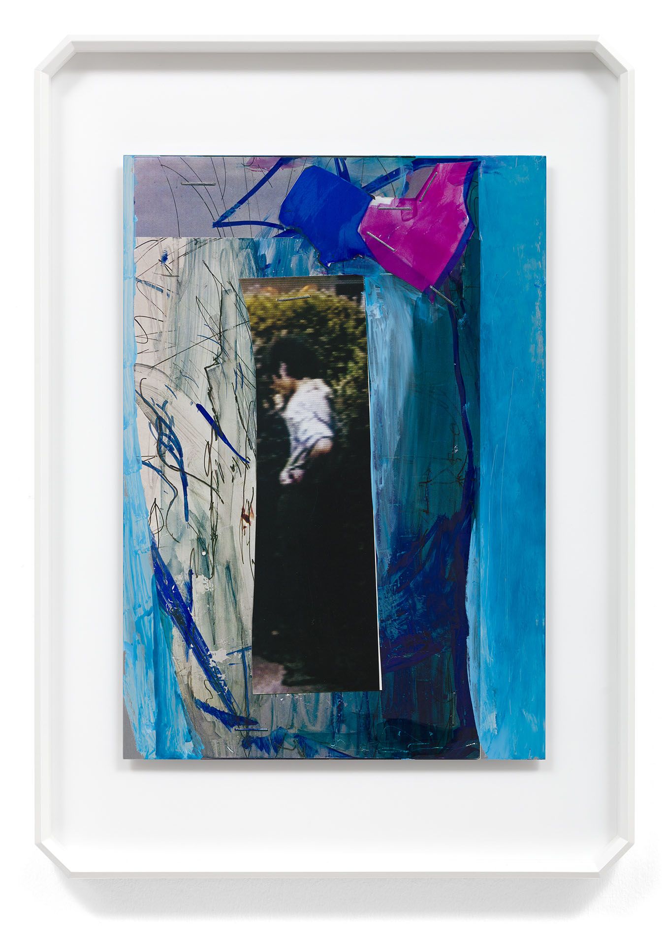 The sculpture is surrounded by a series of paintings. Wekua uses an architectural redefinition of the space to create his own viewing plane for the paintings while simultaneously reflecting the centrally-positioned sculpture as an object in space. Like the sculpture, the process of creating the exhibited paintings is based on strategies of assemblage and collage. Photographs were often a starting point for these works; Wekua treats these photos as archive material. First they appear in paper collages, then the collages are transferred to aluminum-composite plates using a complex, painterly silkscreen-printing process with different layers of pigment. The finished paintings emerge when Wekua edits and paints over these plates. Using a process of continuously applying oil paint and removing it, changing backgrounds, blurring or adding details, he constructs new contexts of meaning for his source material. The dominance of the respective color background and proportions of the original photos he incorporates often evoke the tradition of icon painting. The process of creating these paintings follows the same self-reflective, abstracting and sometimes effacing process that our memory does. Wekua succeeds in compressing several levels of time into one image while countering the past with a poetic reality of his own. These works are not to be understood as commentaries on the past and certainly not as its reconstruction. Rather, they are aimed at its complete, aesthetic transfiguration.