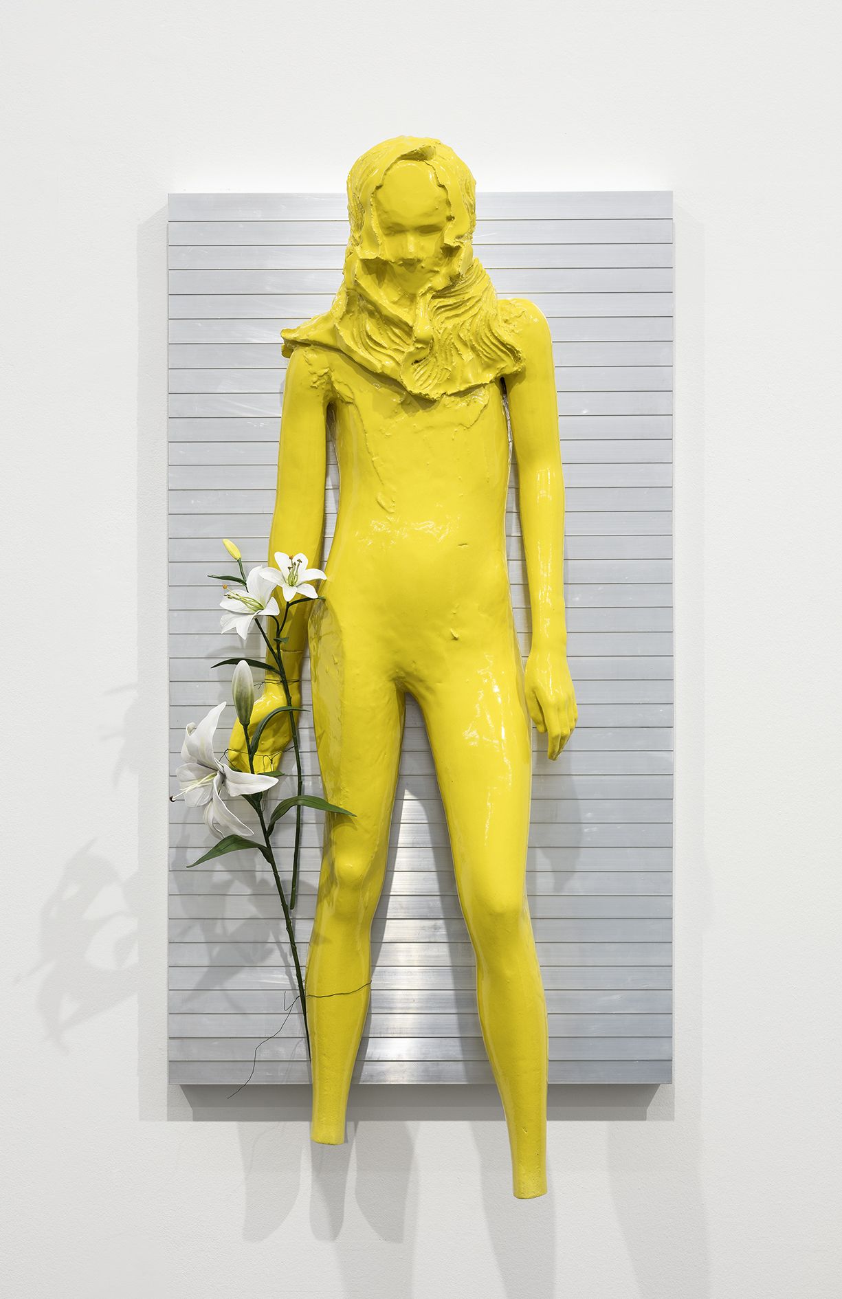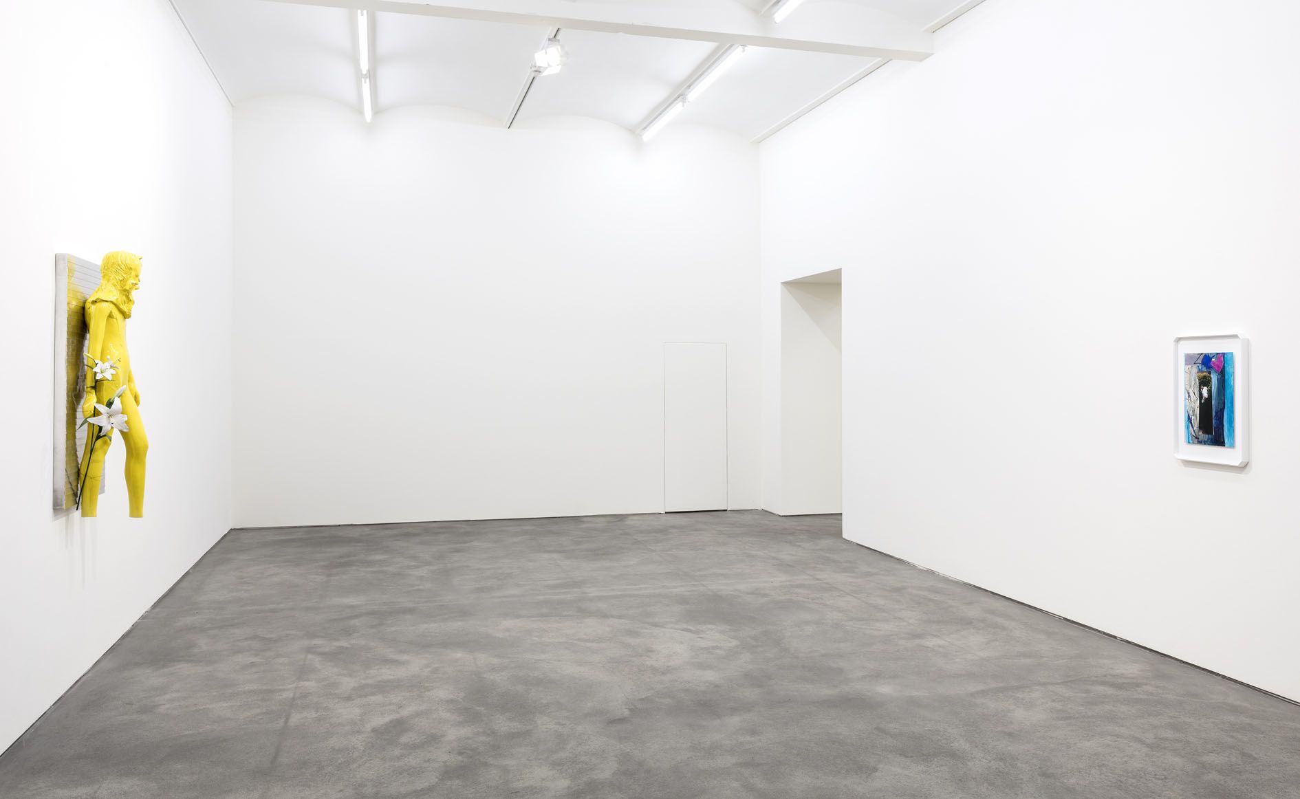 At the center of Andro Wekua’s new exhibition at Sprüth Magers is a life-size sculpture made of nickel silver – a silver-like alloy of copper, nickel and zinc – and a group of paintings. The untitled sculpture recalls Wekua’s earlier mannequin figures and continues their subtle formal vocabulary. The androgynous figure appears situated between the sexes; its body has a prepubescent, almost childlike look. On the back of the sculpture sits a small, white bronze Pegasus with grey wings – a futuristic element, childish toy and mythical reference in one. The physical proportions of this figure are realistic only at first glance; they are unthinkable in real life. The figure is a composite of various, non-related body parts. Before casting, it was composed of miscellaneous models of real limbs. Even the sculpture’s body posture probes the limits of what is physically possible. It recalls the Christ figure in Michelangelo’s unfinished Rondanini Pietà. In the original, the Virgin Mary stands behind her dead son and tries to hold him upright. Wekua’s figure stands in a pool; water runs from parallel slits on its arms and shoulders. Its silvery surface is in constant motion and yet it appears preserved in a state of perpetual stagnation. For all its overt artificiality, this figure seems to lead a psychological life of its own. It seems strangely, if improbably, alive.