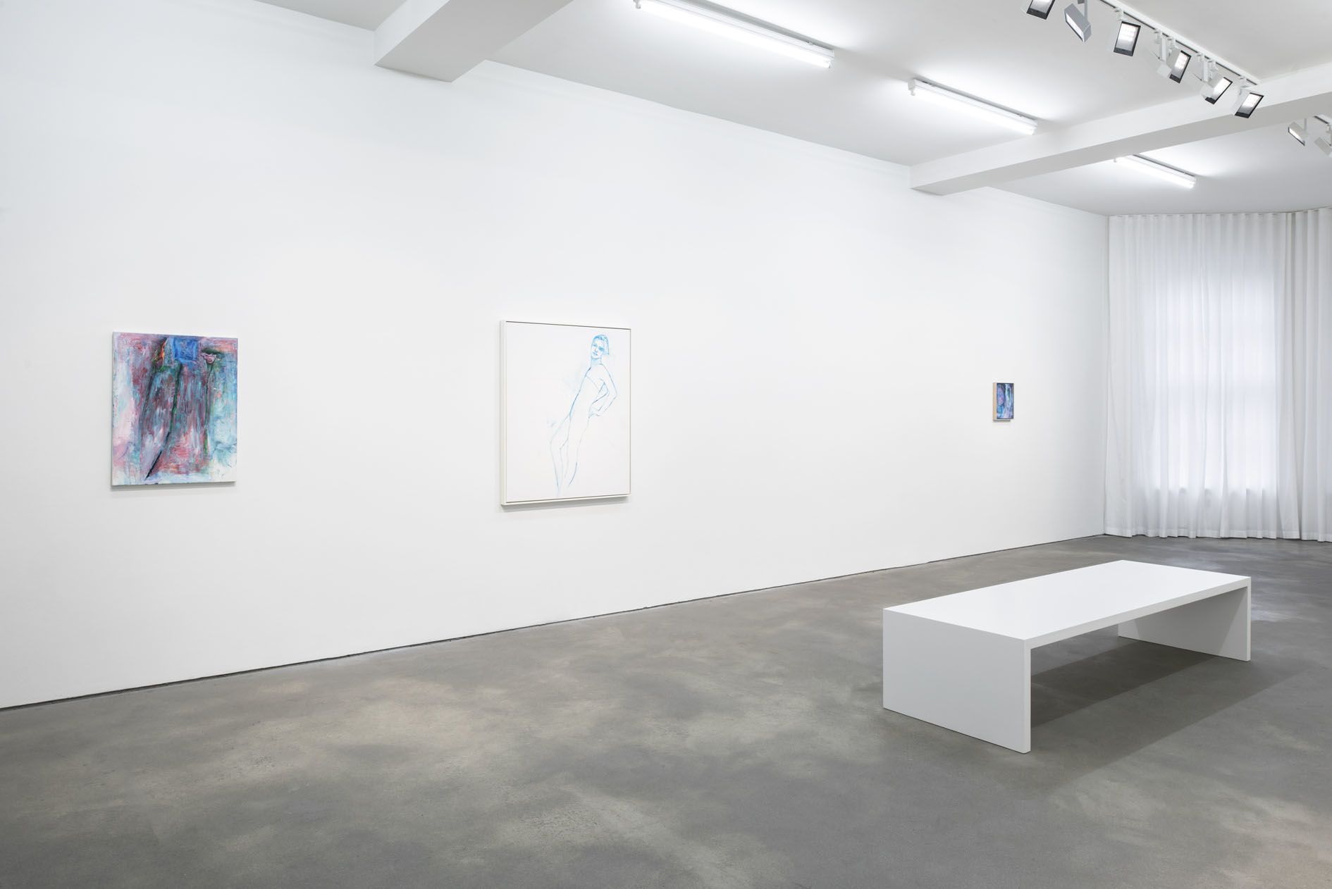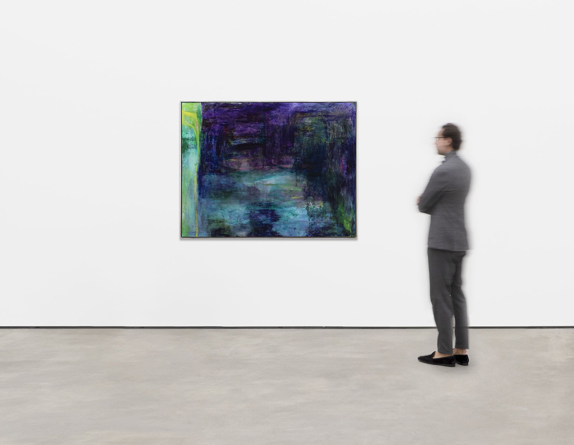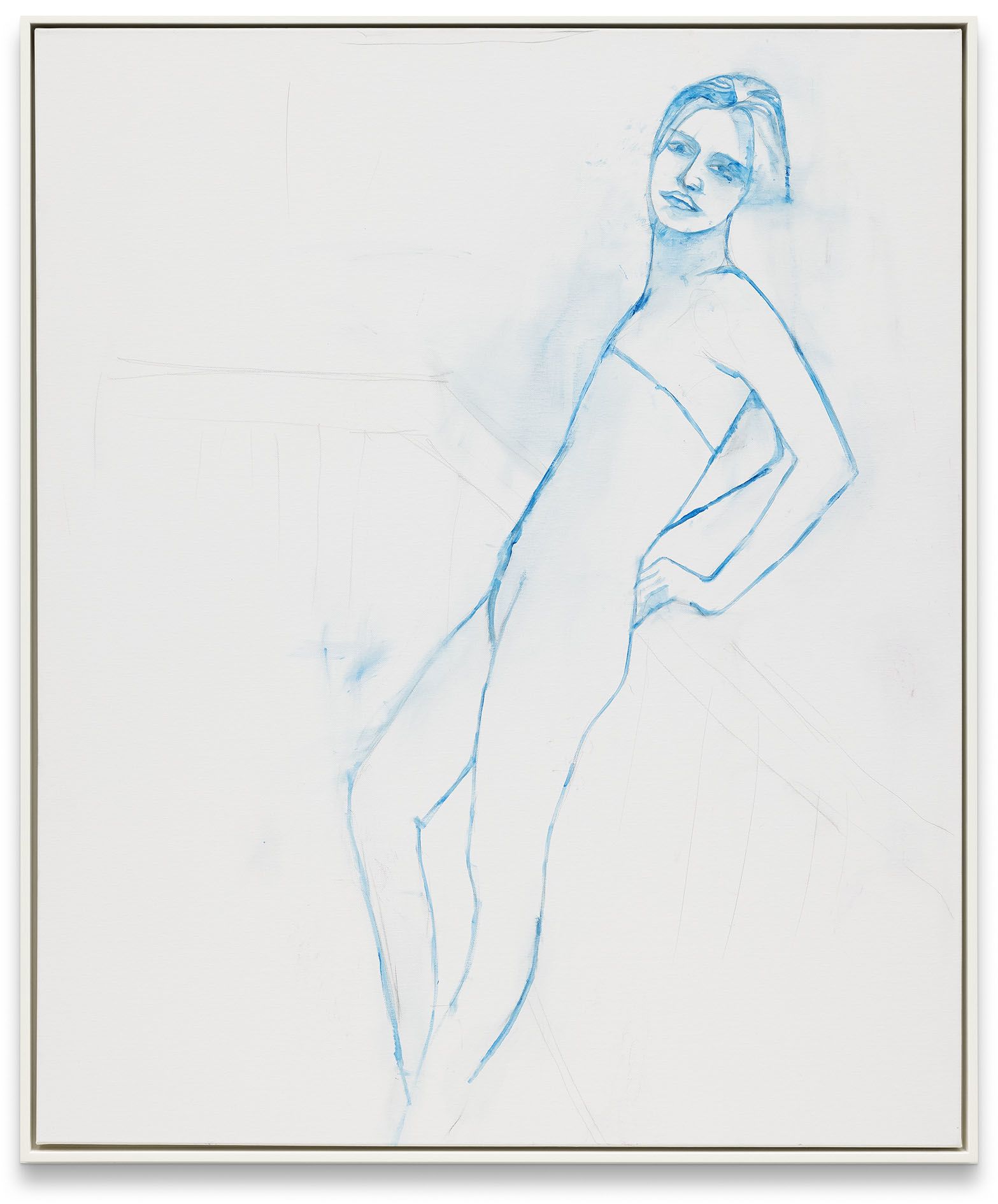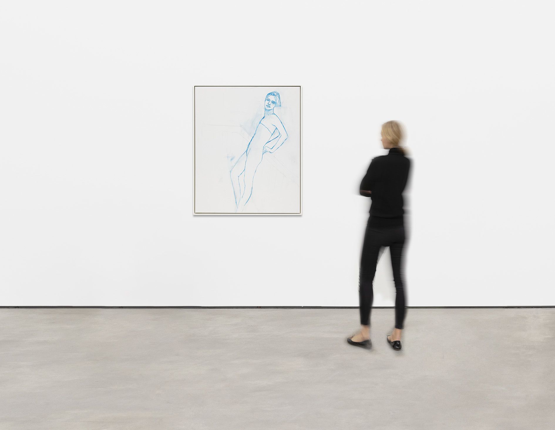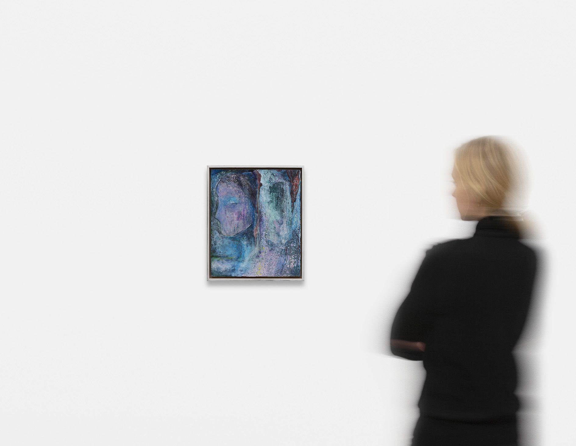 Known for his dense, multilayered paintings and collages, Wekua’s It Seems Like That (2021) is striking in its comparatively lean imagery, though both its motif and subtle formal language echo his earlier mannequin figures as well. At the center of an otherwise empty canvas is a figure painted with a single, sketchily-rendered blue line. The slightly mannerist proportions of the figure’s limbs are typical Wekua; its body refuses any clear gender classification. Heightening this impression of androgyny is the figure’s cropped hairstyle: although the definitive line indicates chin-length hair, whispers of blue hint that it might be longer. The figure’s vague, unfocused gaze seems momentarily directed at the viewer until a closer look reveals its eyes to be looking in different directions.