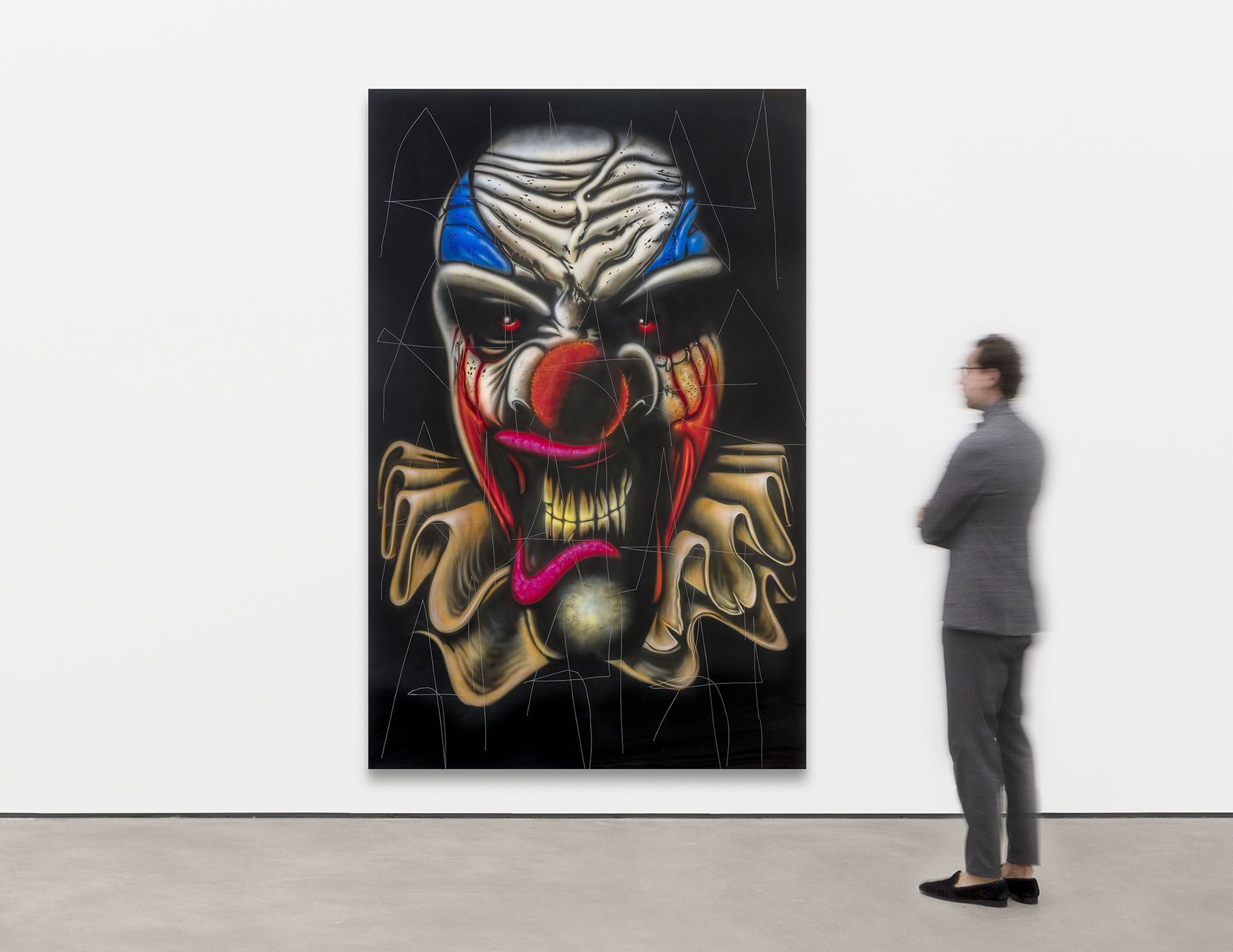 Anne Imhof’s solo exhibition EMO is the largest presentation of the artist’s work in the United States to date and her first in Los Angeles. It brings together several bodies of work across multiple mediums, putting each in dialogue with found objects in ways that implicate visitors’ bodies as they move through the space, at turns exalting and frustrating the viewing experience.