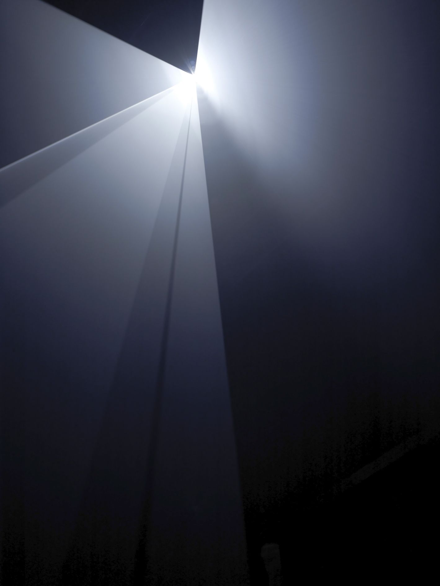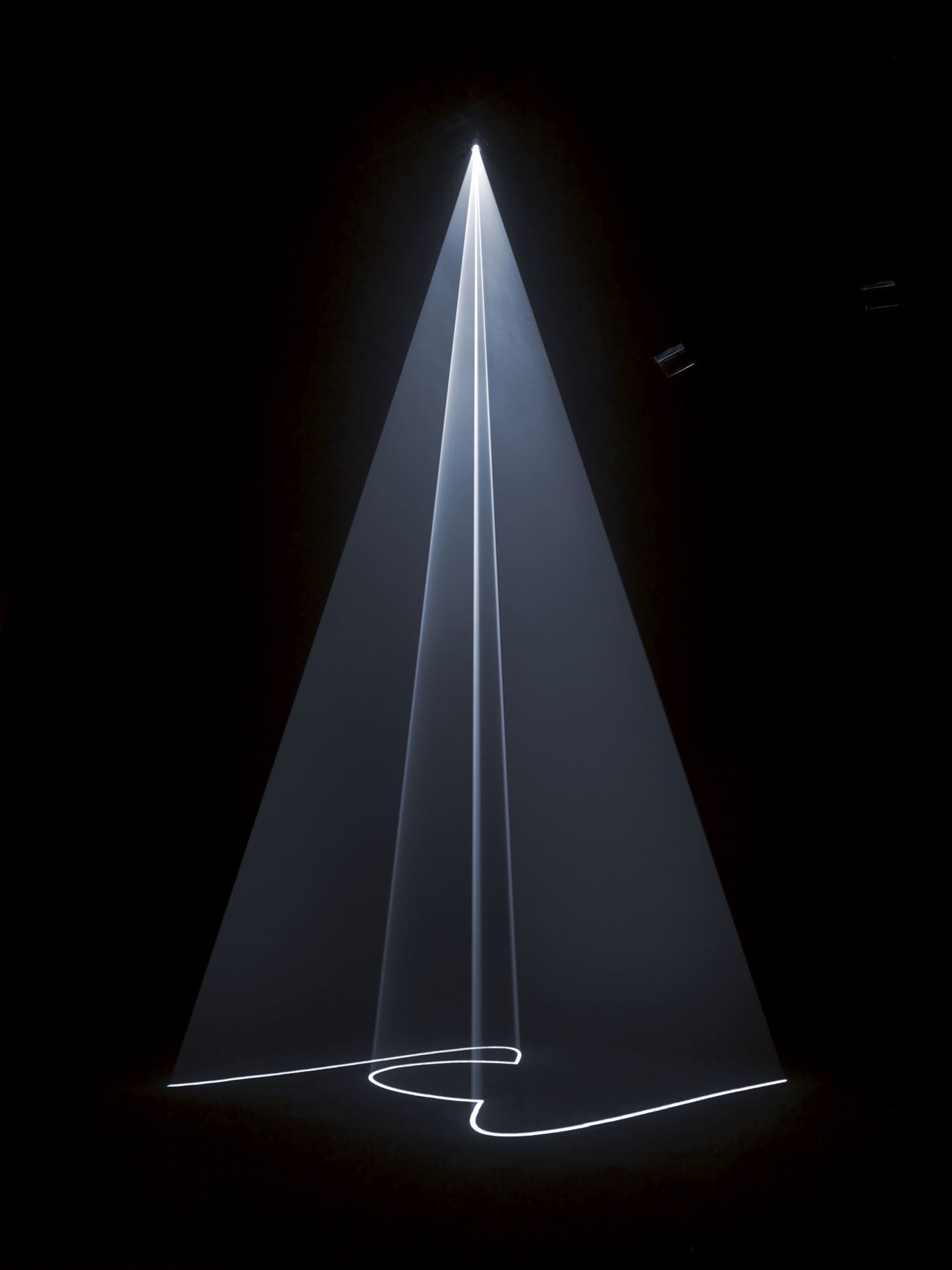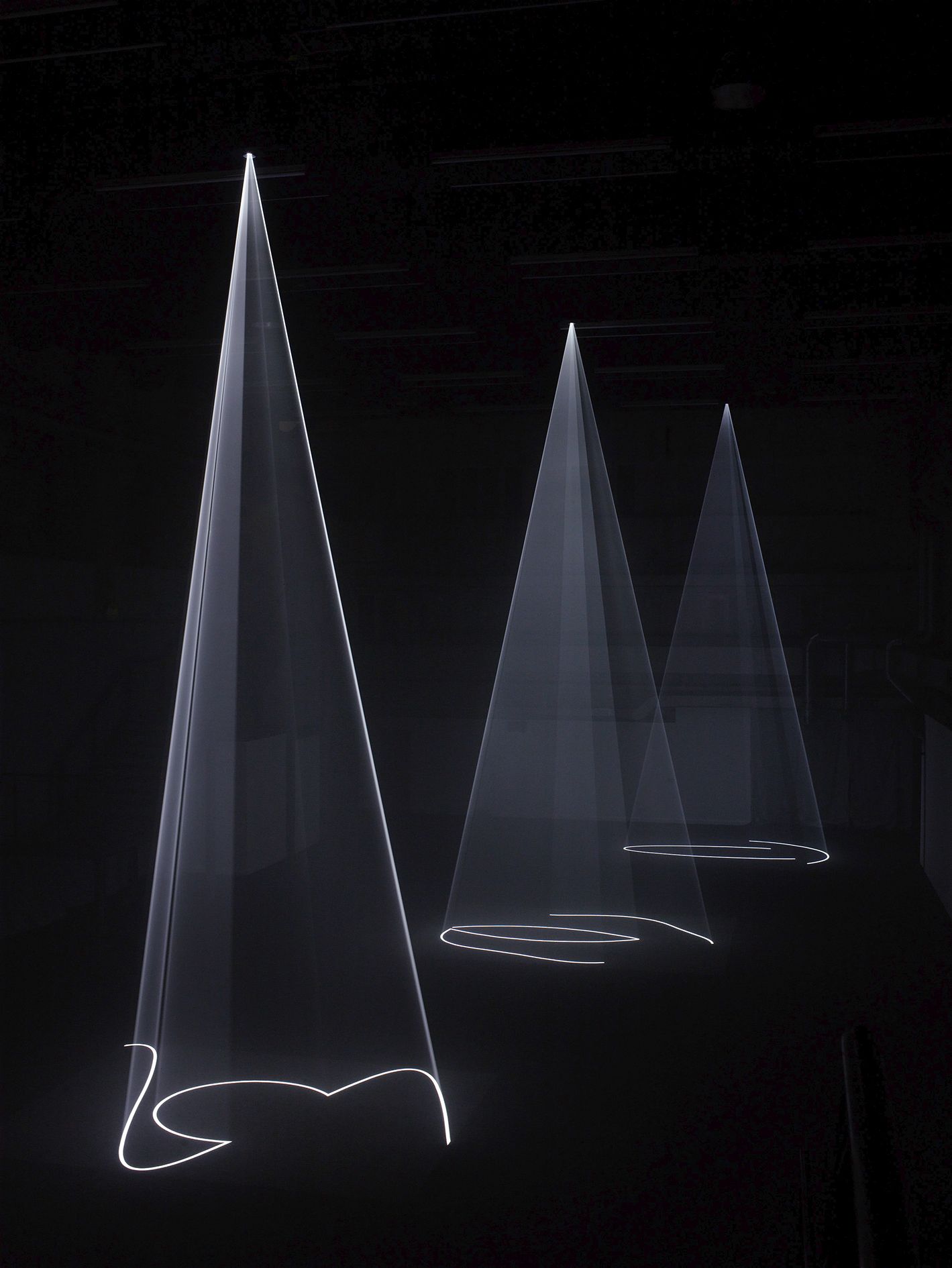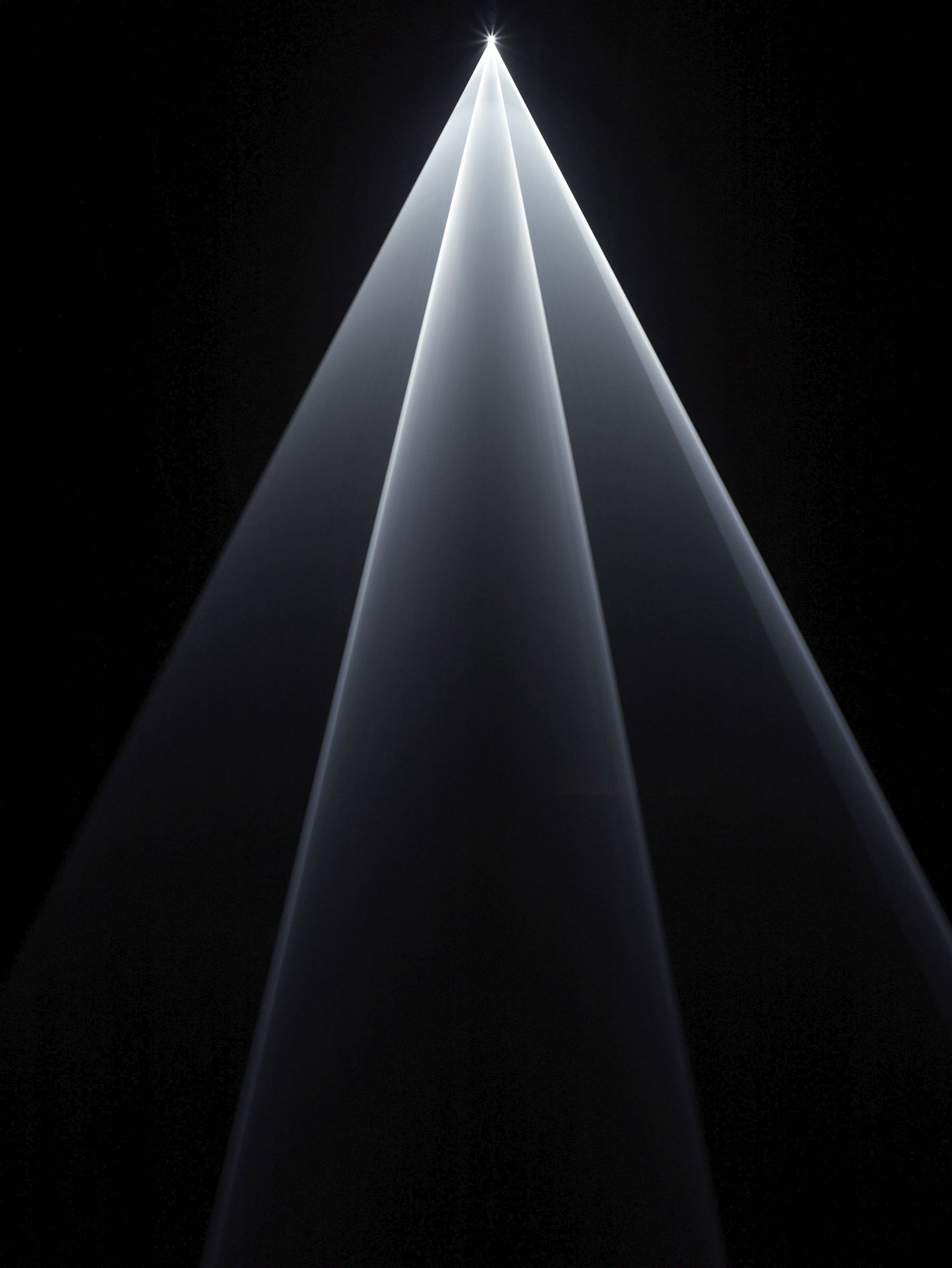 Over the past five years McCall has also explored solid-light works that are oriented vertically – projecting downwards from the ceiling onto the floor, forming 10-metre tall, conical ‘tents’ of light, with a base of about 4 metres. Here, the projected line-drawing on the floor is, quite literally, the footprint of the work, with the three-dimensional ‘body’ rising up from the floor and finally narrowing to a point at the lens of the projector, well-above one’s head. From the point-of-view of the observer, the vertical pieces create a profoundly different type of encounter. Four of these works, each of them showing in the UK for the first time, will be presented as a single installation in the Ambika P3 exhibition space. The works are Breath (2004), Breath III (2005), Meeting You Halfway (2009) and You (2010).