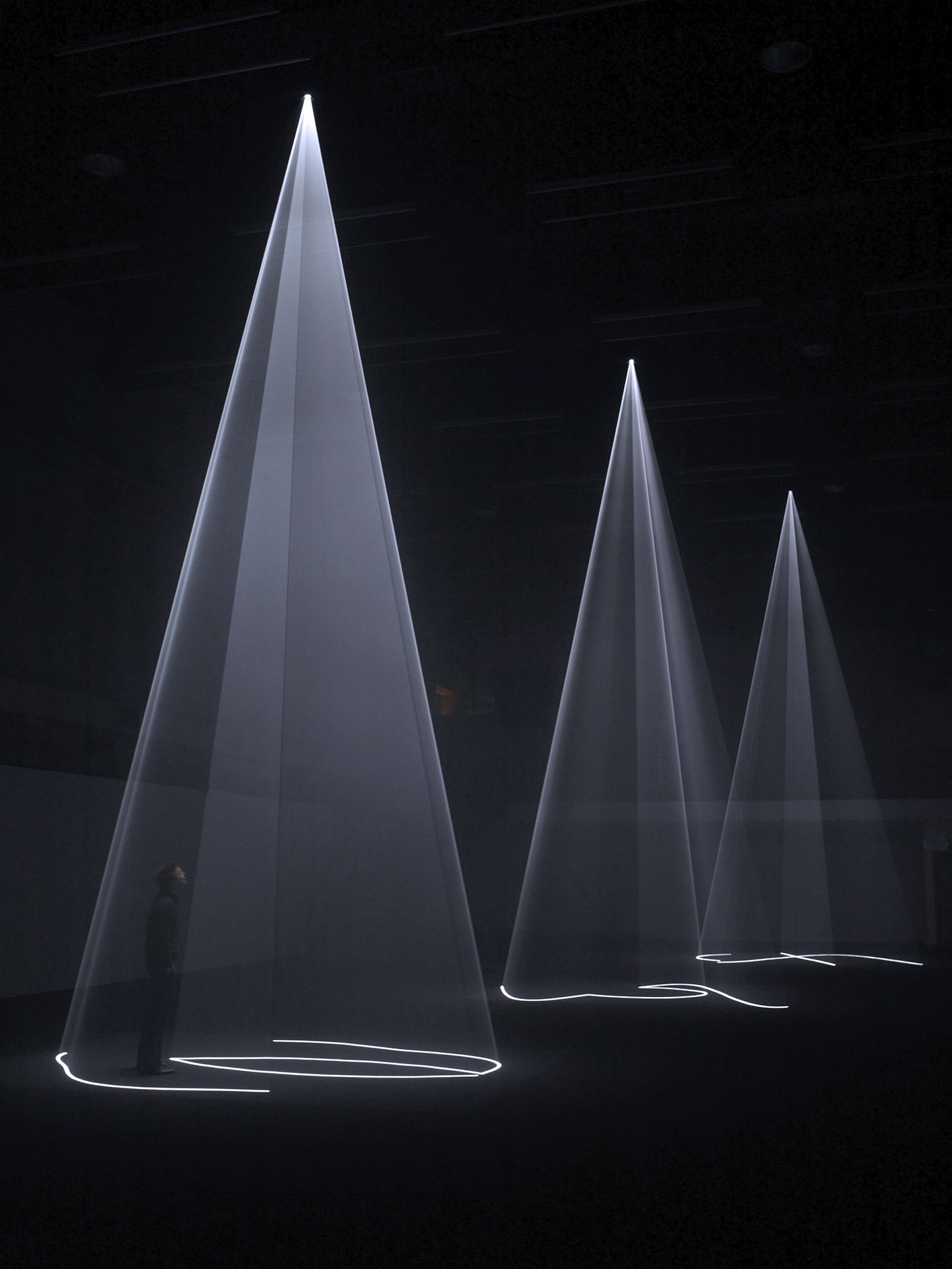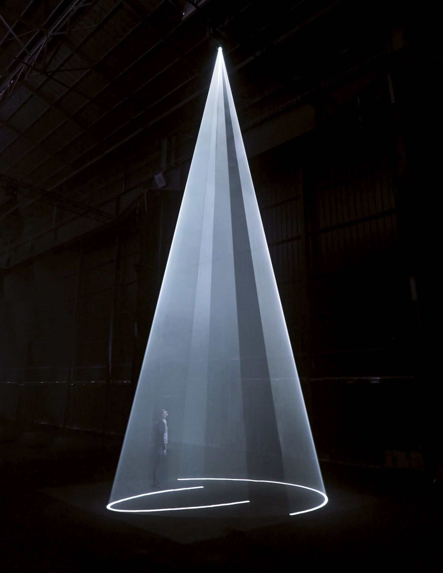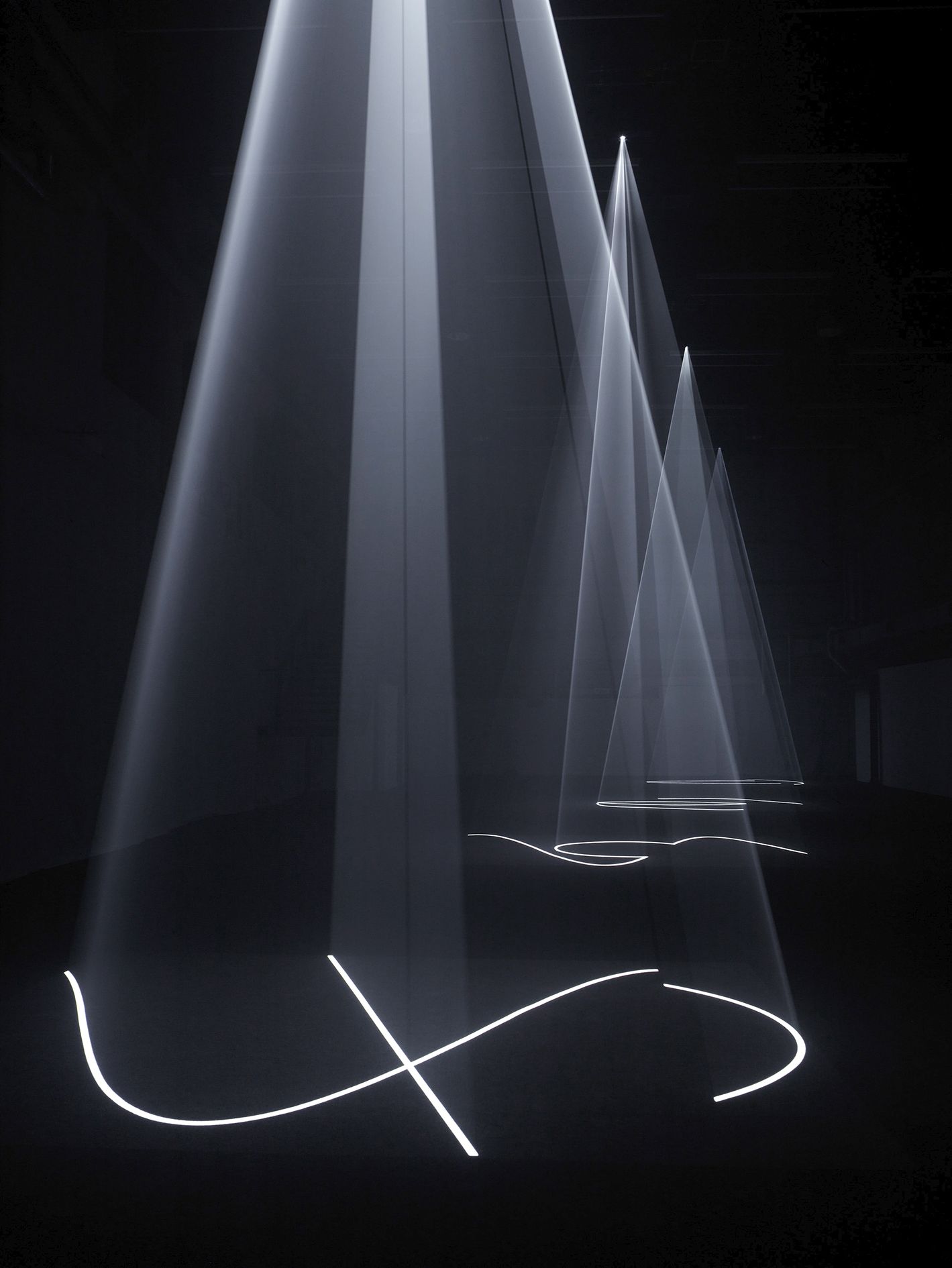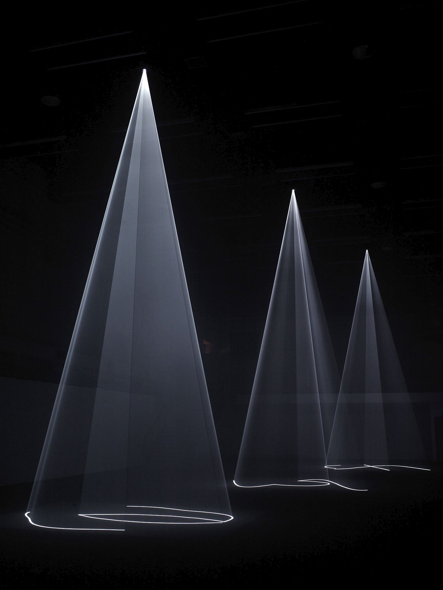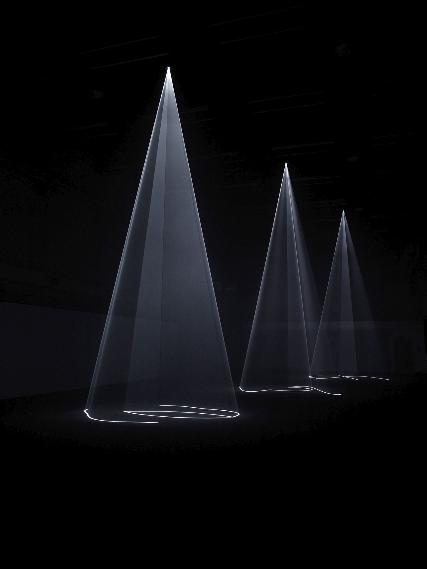 Over the past five years McCall has also explored solid-light works that are oriented vertically – projecting downwards from the ceiling onto the floor, forming 10-metre tall, conical ‘tents’ of light, with a base of about 4 metres. Here, the projected line-drawing on the floor is, quite literally, the footprint of the work, with the three-dimensional ‘body’ rising up from the floor and finally narrowing to a point at the lens of the projector, well-above one’s head. From the point-of-view of the observer, the vertical pieces create a profoundly different type of encounter. Four of these works, each of them showing in the UK for the first time, will be presented as a single installation in the Ambika P3 exhibition space. The works are Breath (2004), Breath III (2005), Meeting You Halfway (2009) and You (2010).