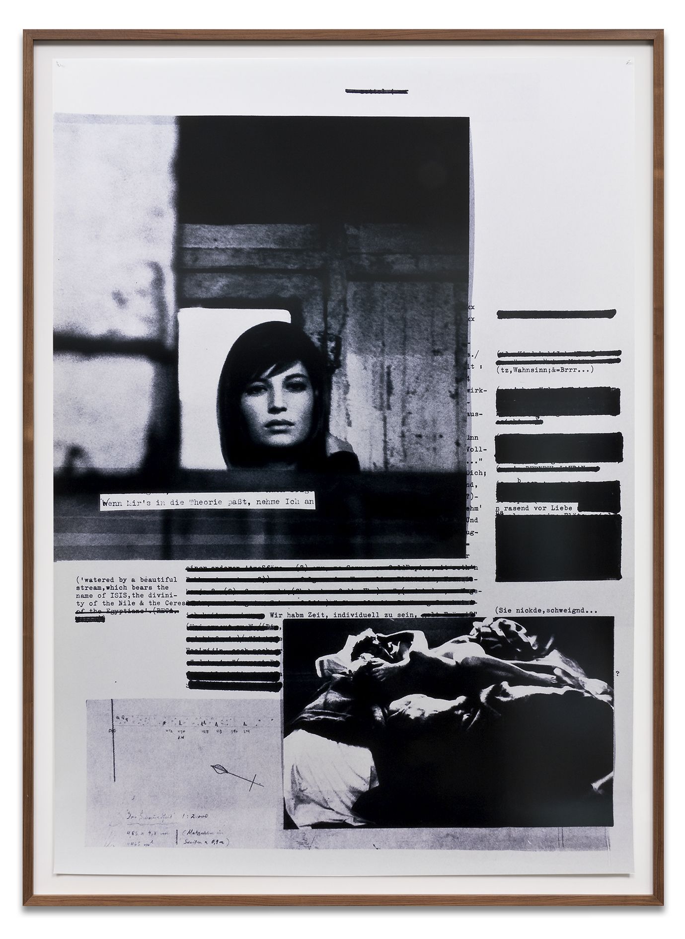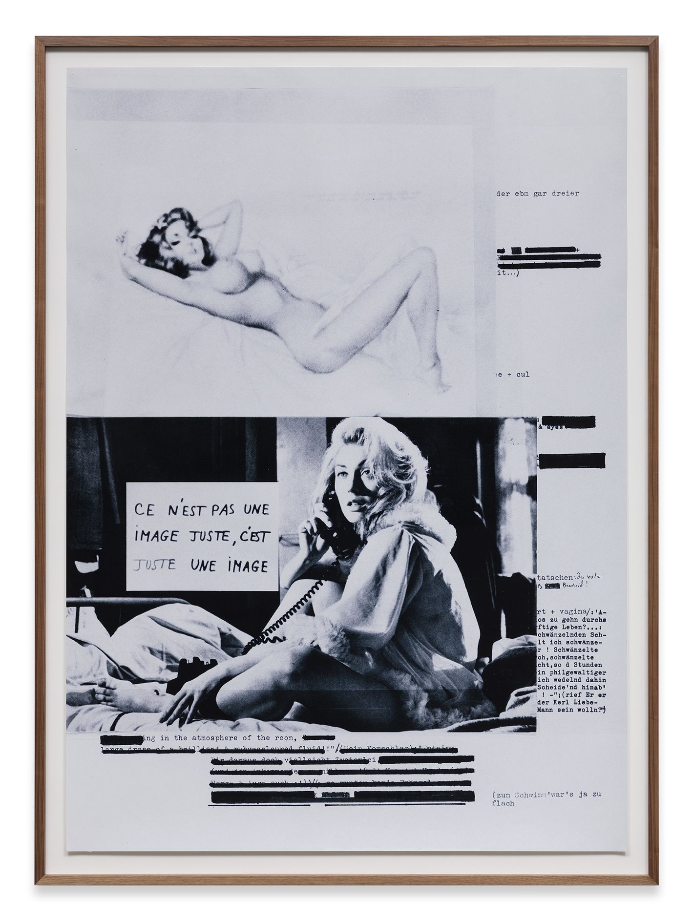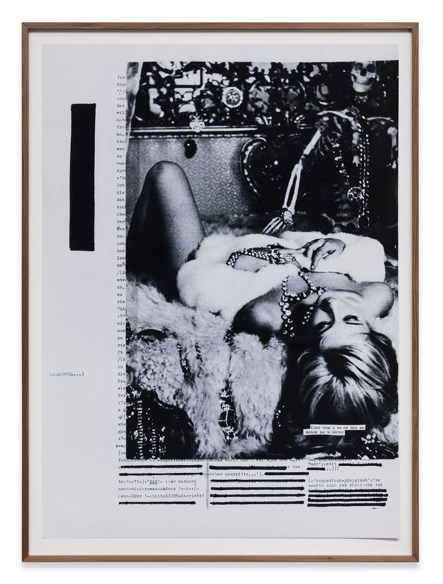 The large format works of the 1980 series Broken Heart use excerpts of text from Arno Schmidt’s seminal work Zettels Traum (1970) in relation to the representation of women in cinema and photonovels from the 60s and 70s. The latter were affected by a voyeuristic, masculine perspective along with this the fetishisation of the female form. In the collages, Astrid Klein links textual and pictorial material on a visual level that not necessarily share the same semantic level. This creates a context, in which new meanings are revealed.