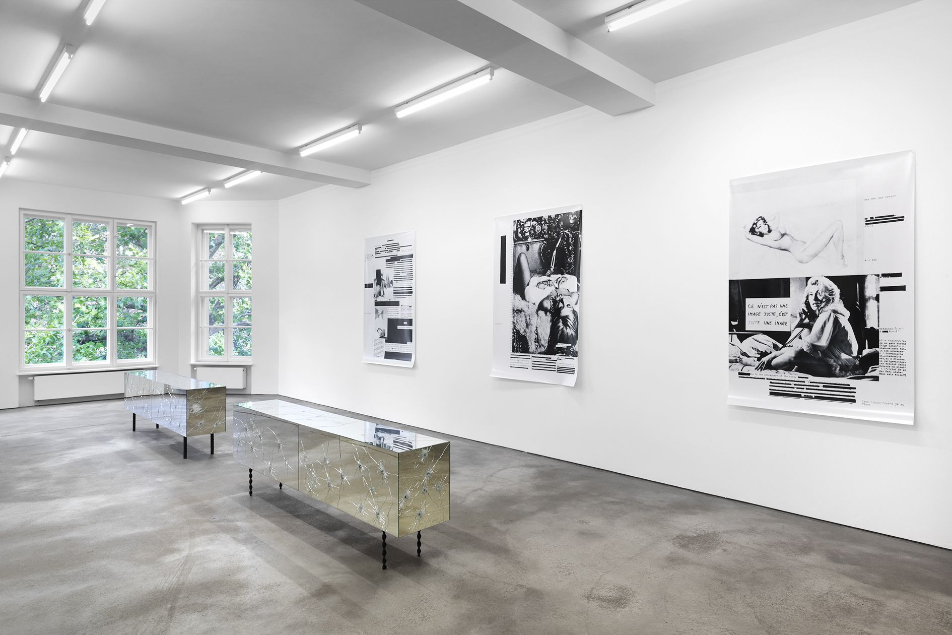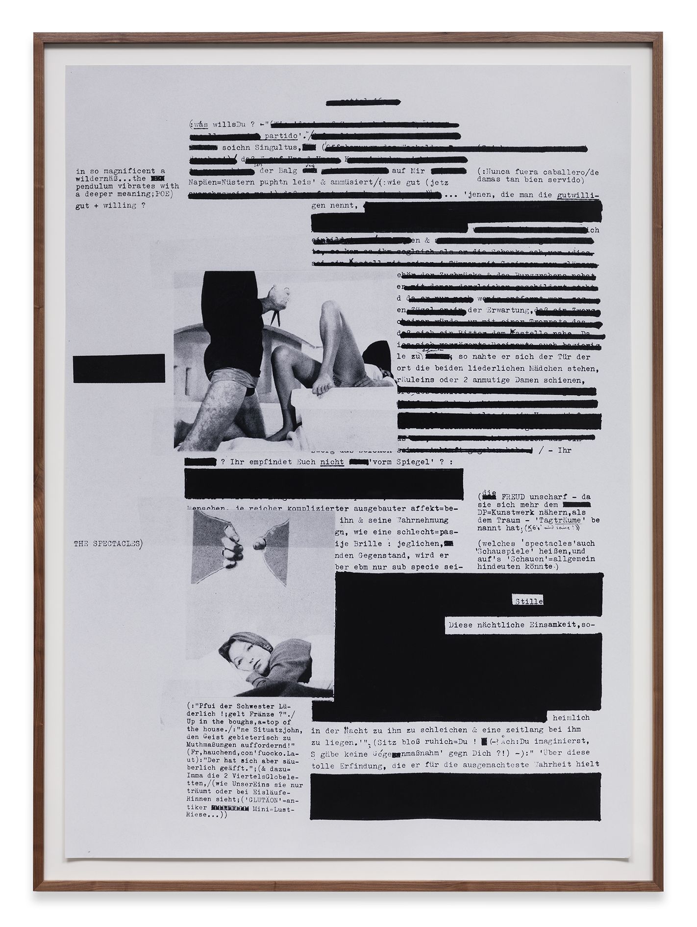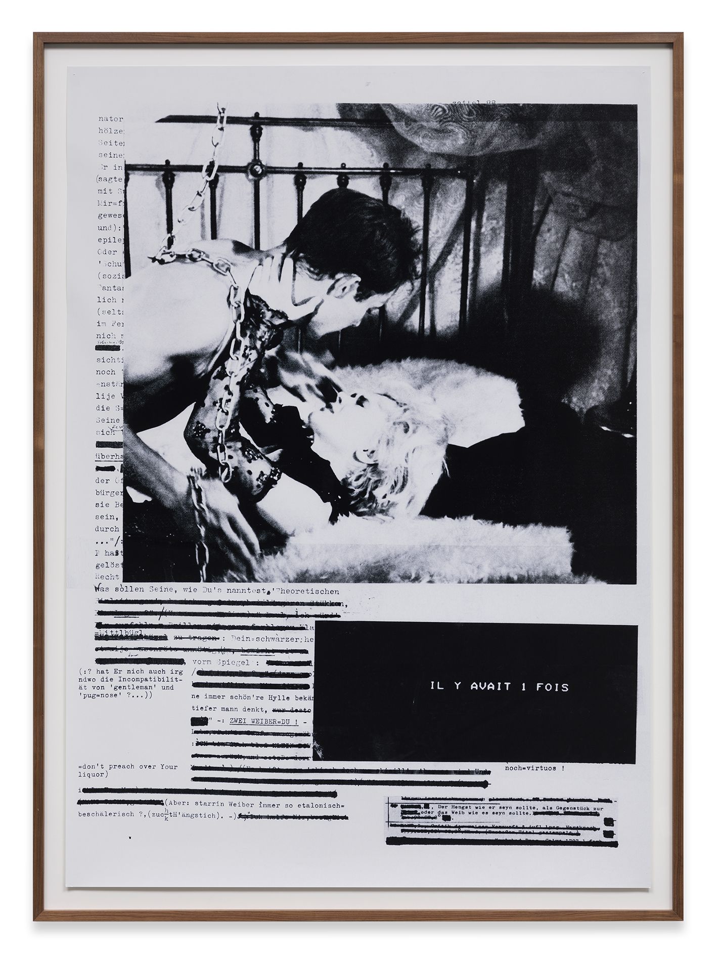 The large format works of the 1980 series Broken Heart use excerpts of text from Arno Schmidt’s seminal work Zettels Traum (1970) in relation to the representation of women in cinema and photonovels from the 60s and 70s. The latter were affected by a voyeuristic, masculine perspective along with this the fetishisation of the female form. In the collages, Astrid Klein links textual and pictorial material on a visual level that not necessarily share the same semantic level. This creates a context, in which new meanings are revealed.