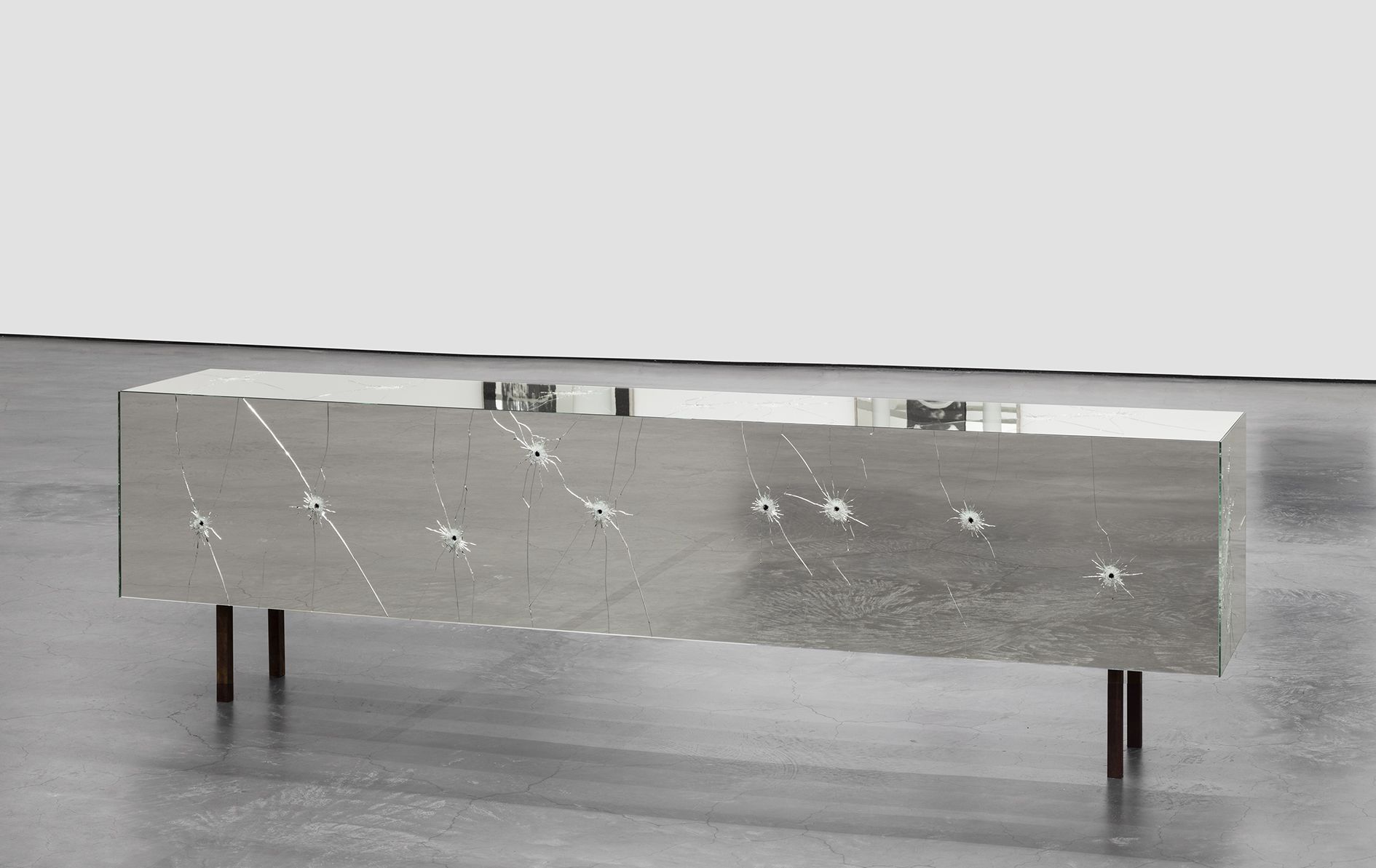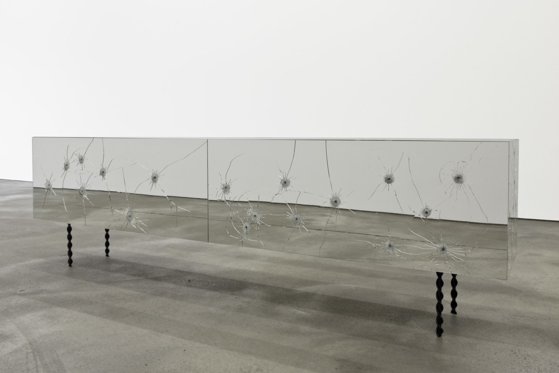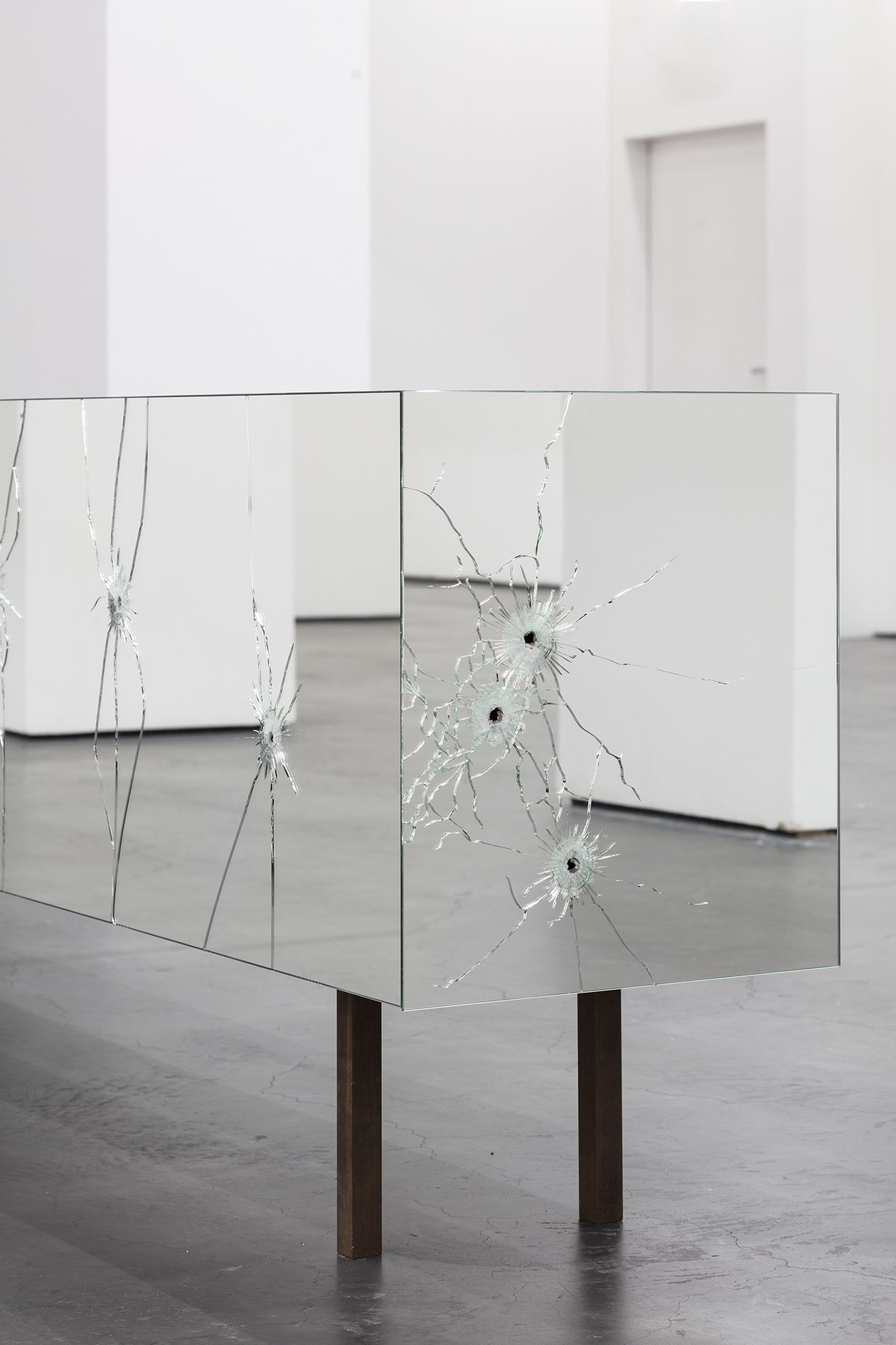 The sculptures BROKEN HEART I and BROKEN HEART II (1990/5) contain mirrors that have either been shot at or have been smashed with a hammer. The cracks mean that the reflections of the surroundings can only be viewed as fragmentary or deformed.