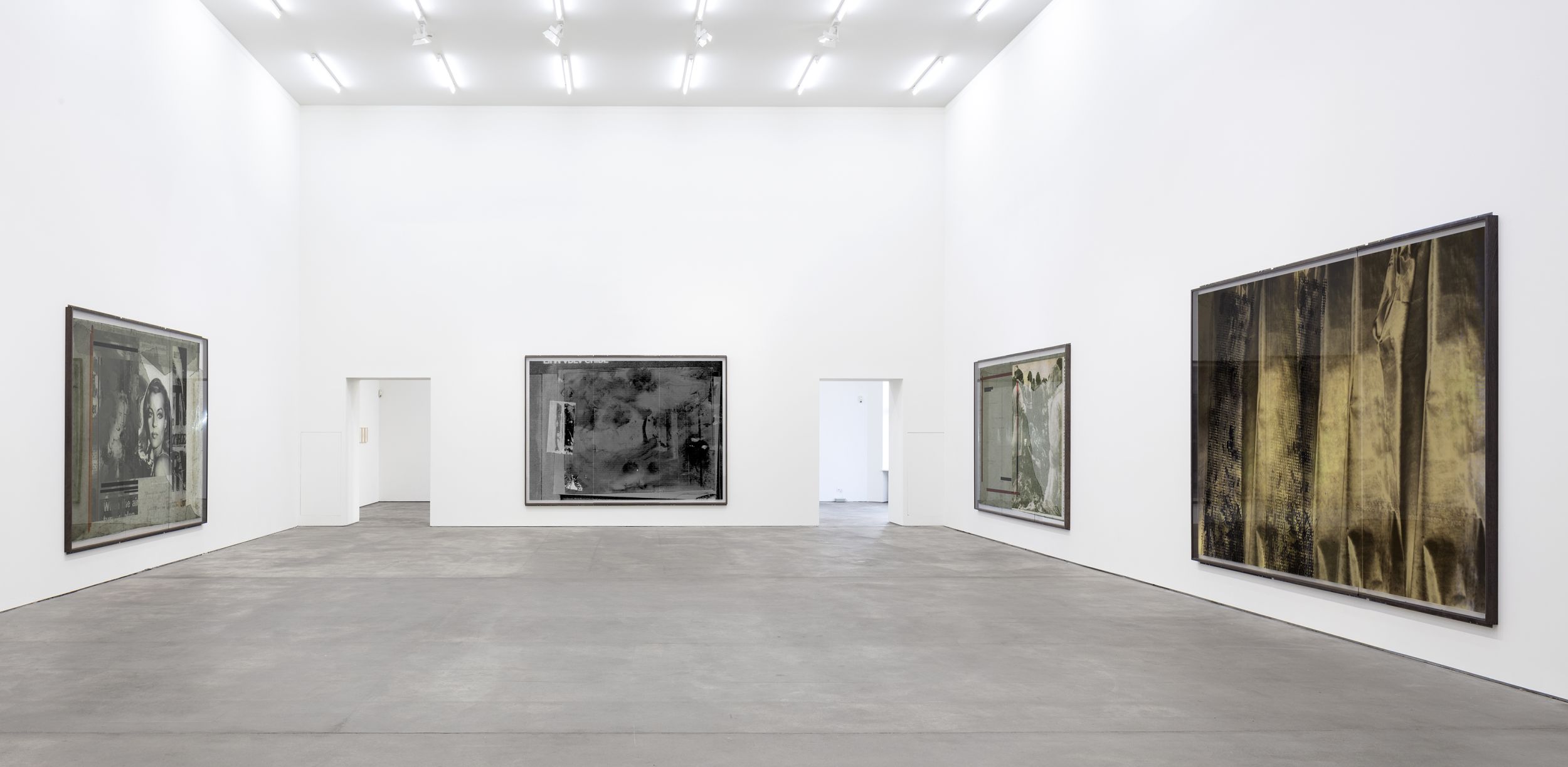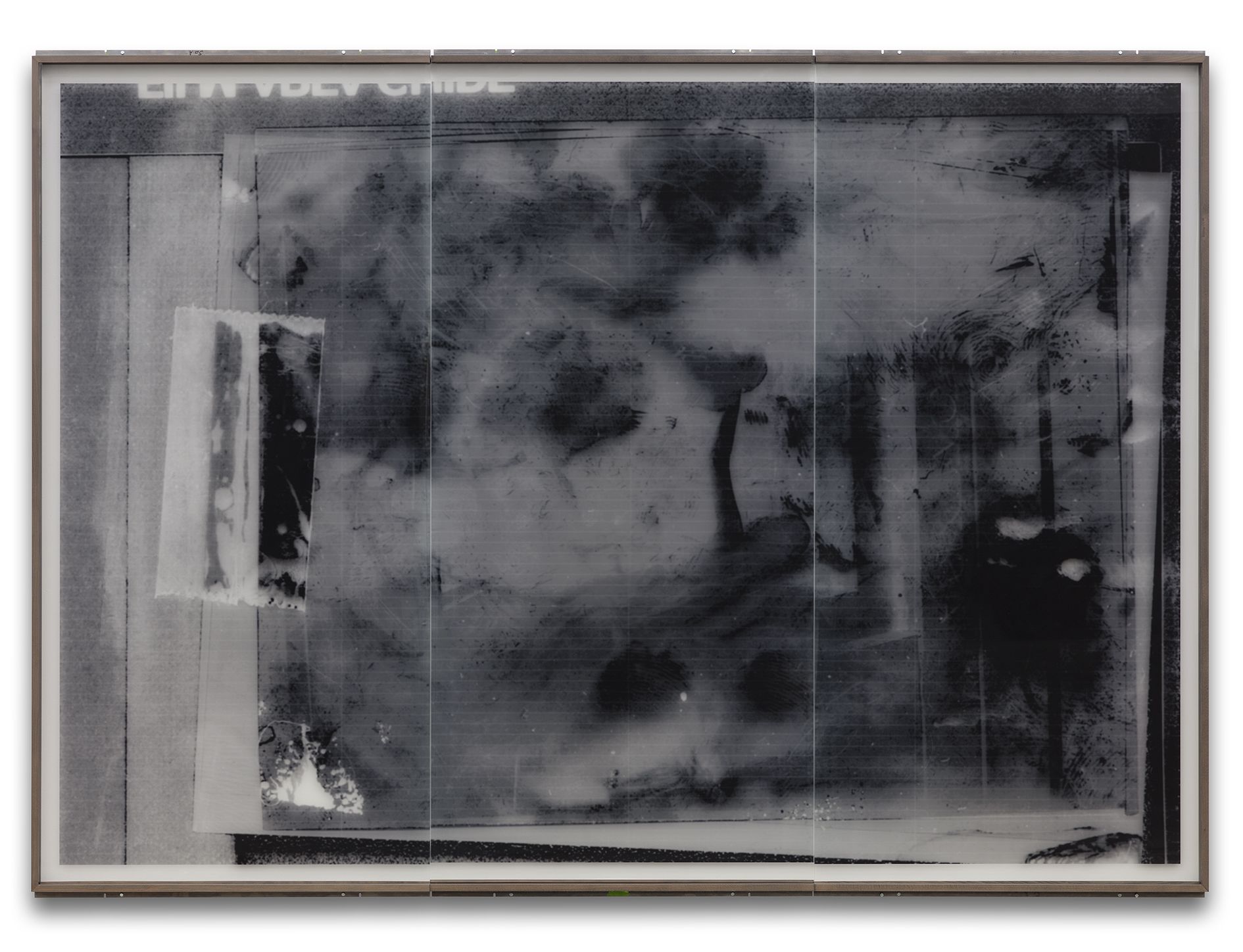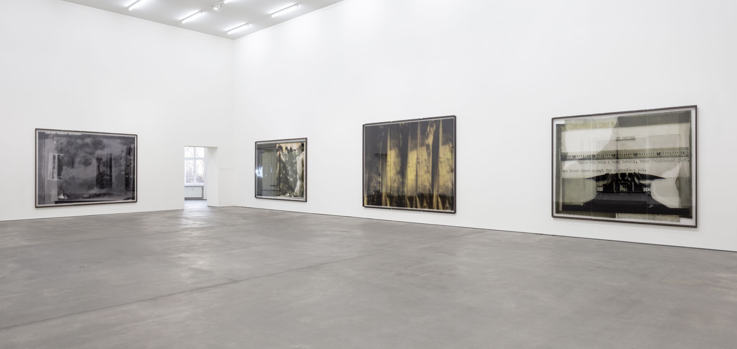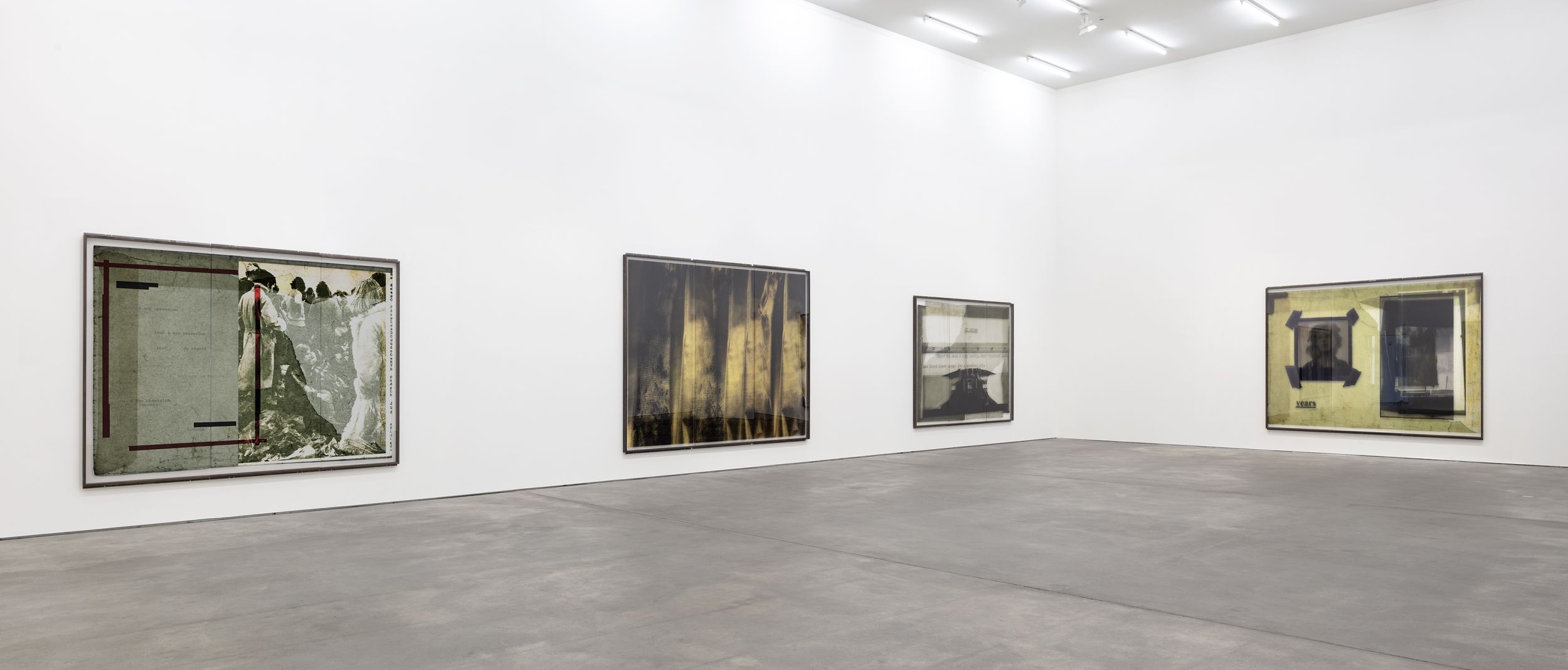 The artist’s current exhibition at Sprüth Magers centres on a presentation of the CUTs (1986/1996) group of works. These collage pieces were first shown in 2018 as part of Klein’s major retrospective at the Falckenberg Collection in Deichtorhallen Hamburg-Harburg. Astrid Klein was one of the first artists to work with large-format transparent film; placing photographic and text elements in dialogue with one another in her typically rhetorical style. Her imagery derives first and foremost from an inventory of pictures that recalls a collective visual memory. By intervening in the existing pictorial material, changing and rearranging it, the artist addresses both regimes of the gaze and visual structures as well as specific mechanisms of representation. In contrast to her famous collages of the 1970s, the CUTs also place a certain amount of importance on the images’ spatial dimension. Astrid Klein uses transparent film as the support material for her collages, the translucent surface texture of which allows traces of the artistic working process to become visible. Still, the synthesis of light and material reveals more than just how the works are put together; it also appears to dissolve the two-dimensional character of the images, giving them more of a sculptural character. The size of the works also makes it possible for the viewer to see the collages from different perspectives depending on where they are standing.