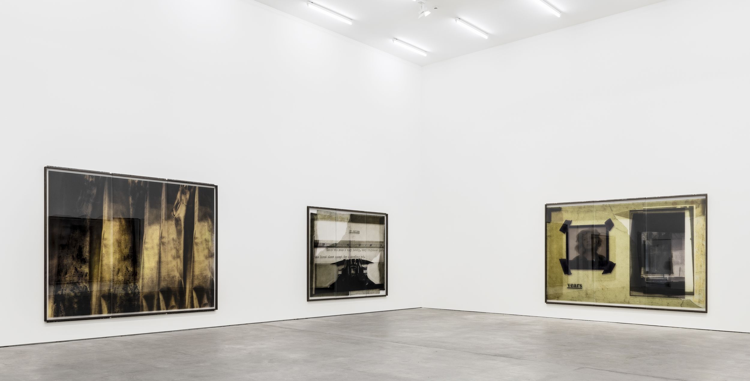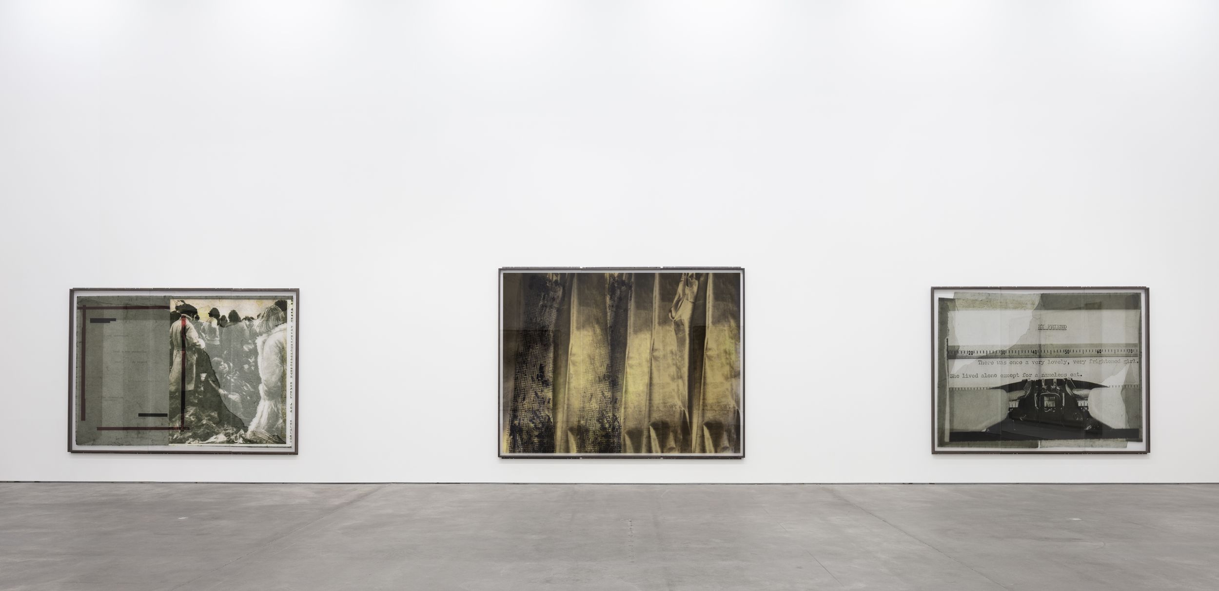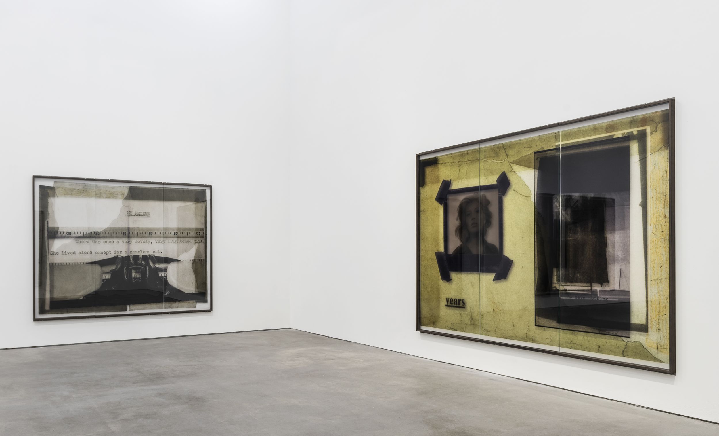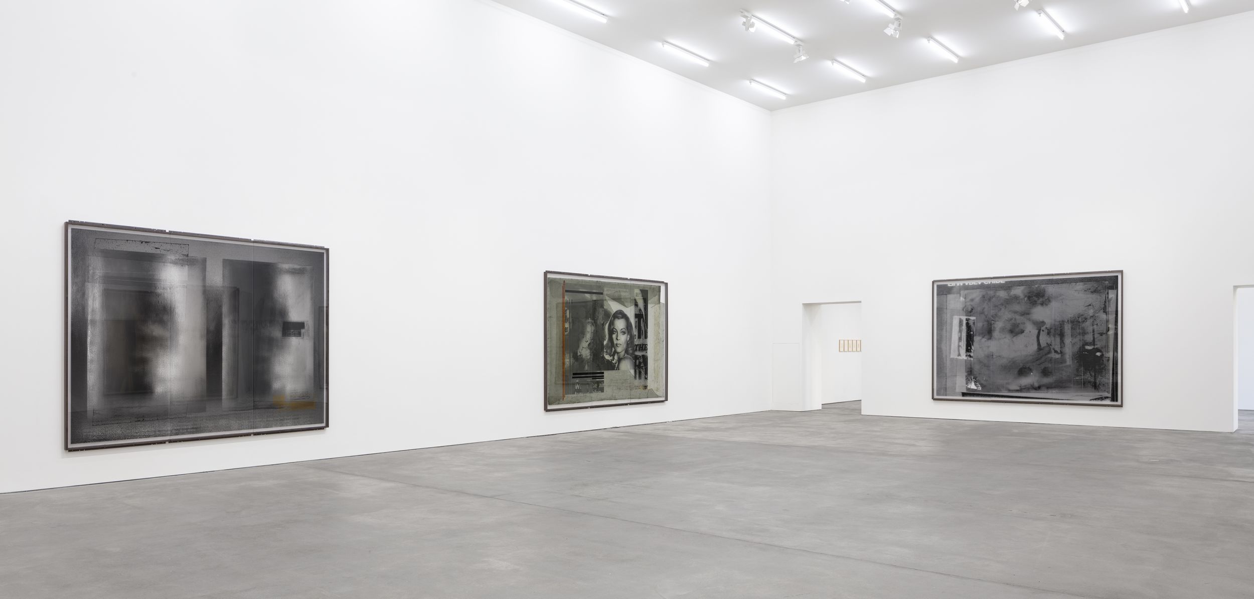 The artist’s current exhibition at Sprüth Magers centres on a presentation of the CUTs (1986/1996) group of works. These collage pieces were first shown in 2018 as part of Klein’s major retrospective at the Falckenberg Collection in Deichtorhallen Hamburg-Harburg. Astrid Klein was one of the first artists to work with large-format transparent film; placing photographic and text elements in dialogue with one another in her typically rhetorical style. Her imagery derives first and foremost from an inventory of pictures that recalls a collective visual memory. By intervening in the existing pictorial material, changing and rearranging it, the artist addresses both regimes of the gaze and visual structures as well as specific mechanisms of representation. In contrast to her famous collages of the 1970s, the CUTs also place a certain amount of importance on the images’ spatial dimension. Astrid Klein uses transparent film as the support material for her collages, the translucent surface texture of which allows traces of the artistic working process to become visible. Still, the synthesis of light and material reveals more than just how the works are put together; it also appears to dissolve the two-dimensional character of the images, giving them more of a sculptural character. The size of the works also makes it possible for the viewer to see the collages from different perspectives depending on where they are standing.