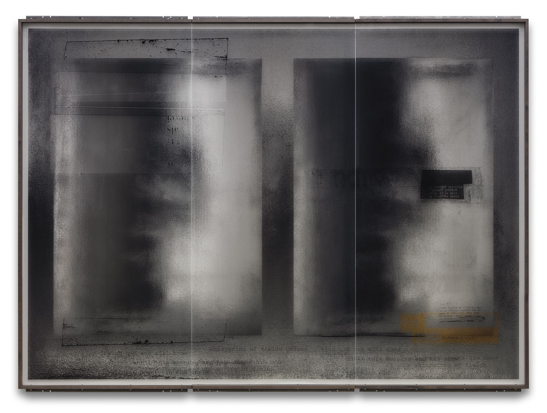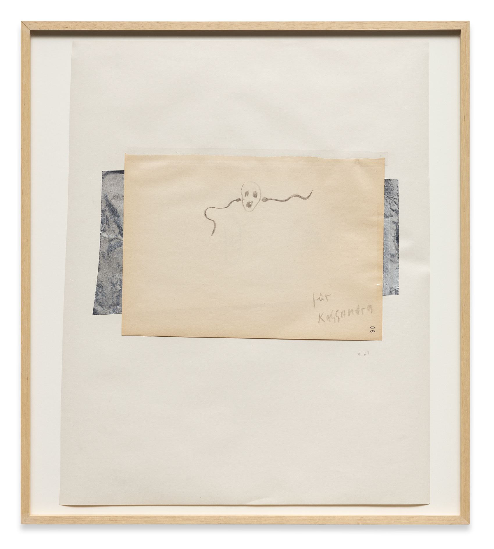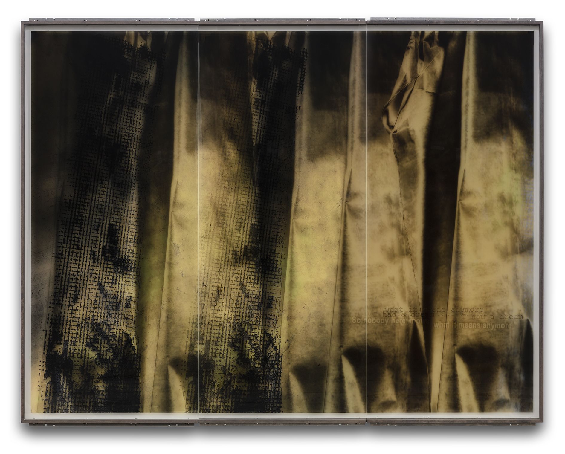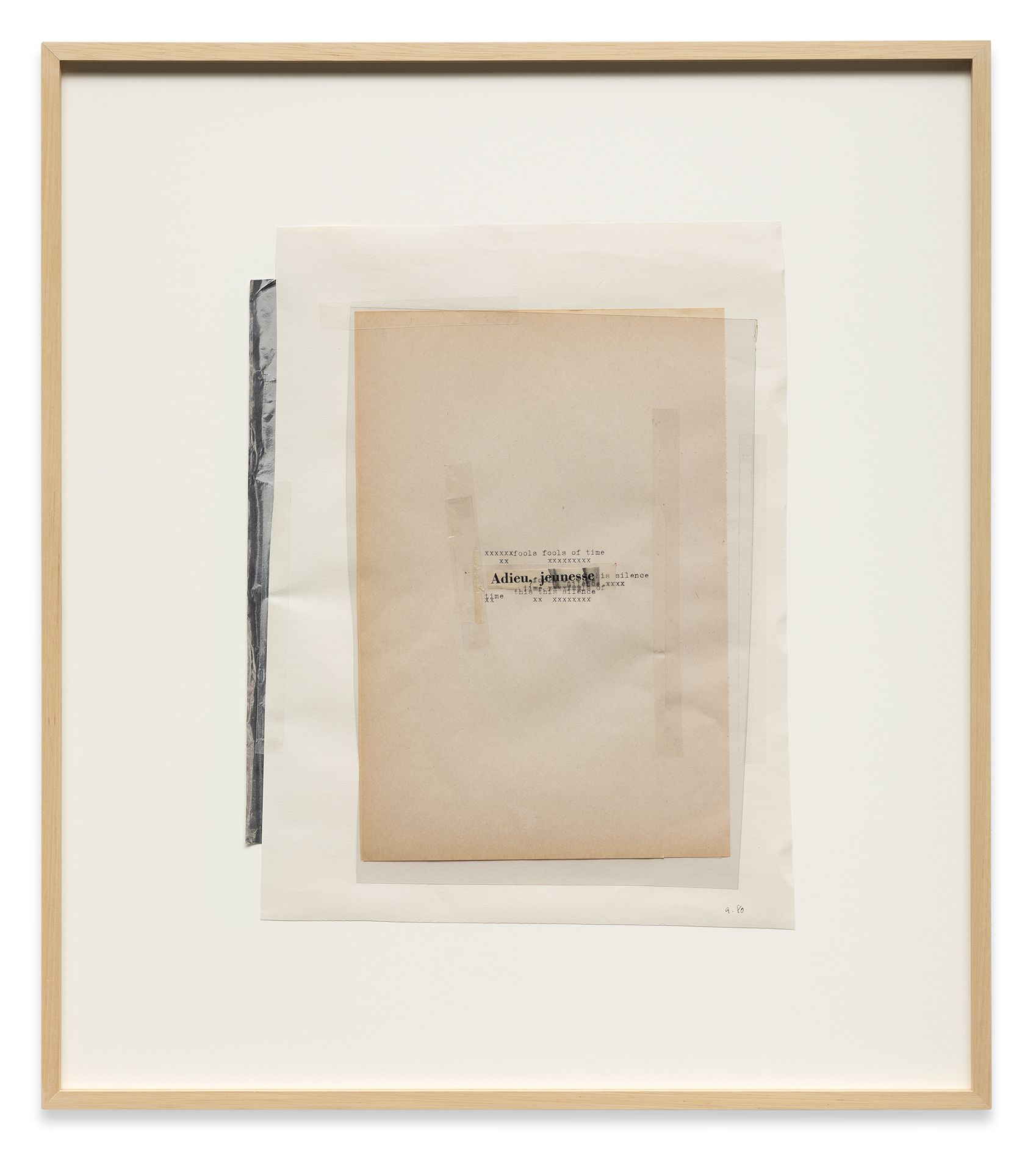 The artist’s current exhibition at Sprüth Magers centres on a presentation of the CUTs (1986/1996) group of works. These collage pieces were first shown in 2018 as part of Klein’s major retrospective at the Falckenberg Collection in Deichtorhallen Hamburg-Harburg. Astrid Klein was one of the first artists to work with large-format transparent film; placing photographic and text elements in dialogue with one another in her typically rhetorical style. Her imagery derives first and foremost from an inventory of pictures that recalls a collective visual memory. By intervening in the existing pictorial material, changing and rearranging it, the artist addresses both regimes of the gaze and visual structures as well as specific mechanisms of representation. In contrast to her famous collages of the 1970s, the CUTs also place a certain amount of importance on the images’ spatial dimension. Astrid Klein uses transparent film as the support material for her collages, the translucent surface texture of which allows traces of the artistic working process to become visible. Still, the synthesis of light and material reveals more than just how the works are put together; it also appears to dissolve the two-dimensional character of the images, giving them more of a sculptural character. The size of the works also makes it possible for the viewer to see the collages from different perspectives depending on where they are standing.