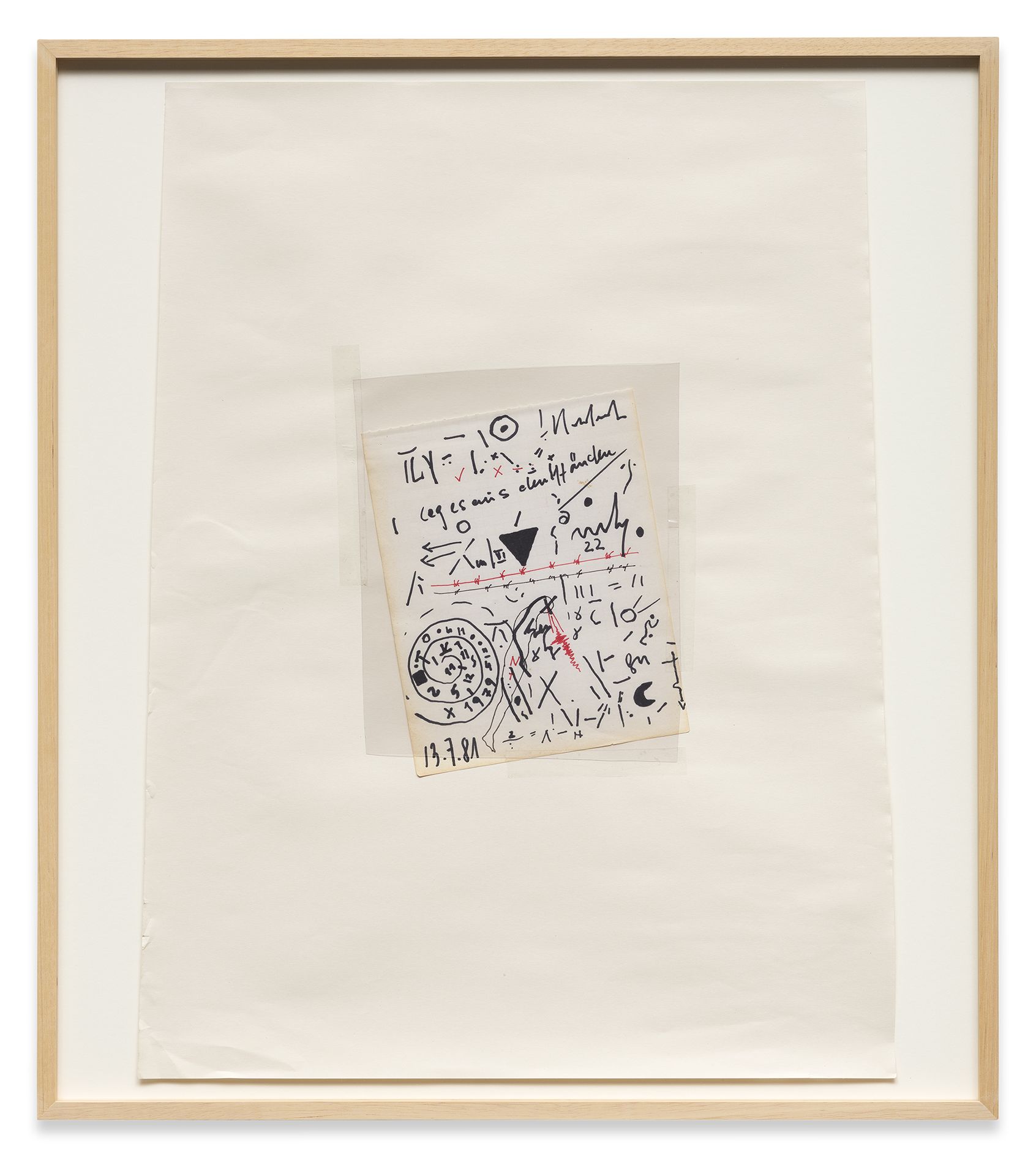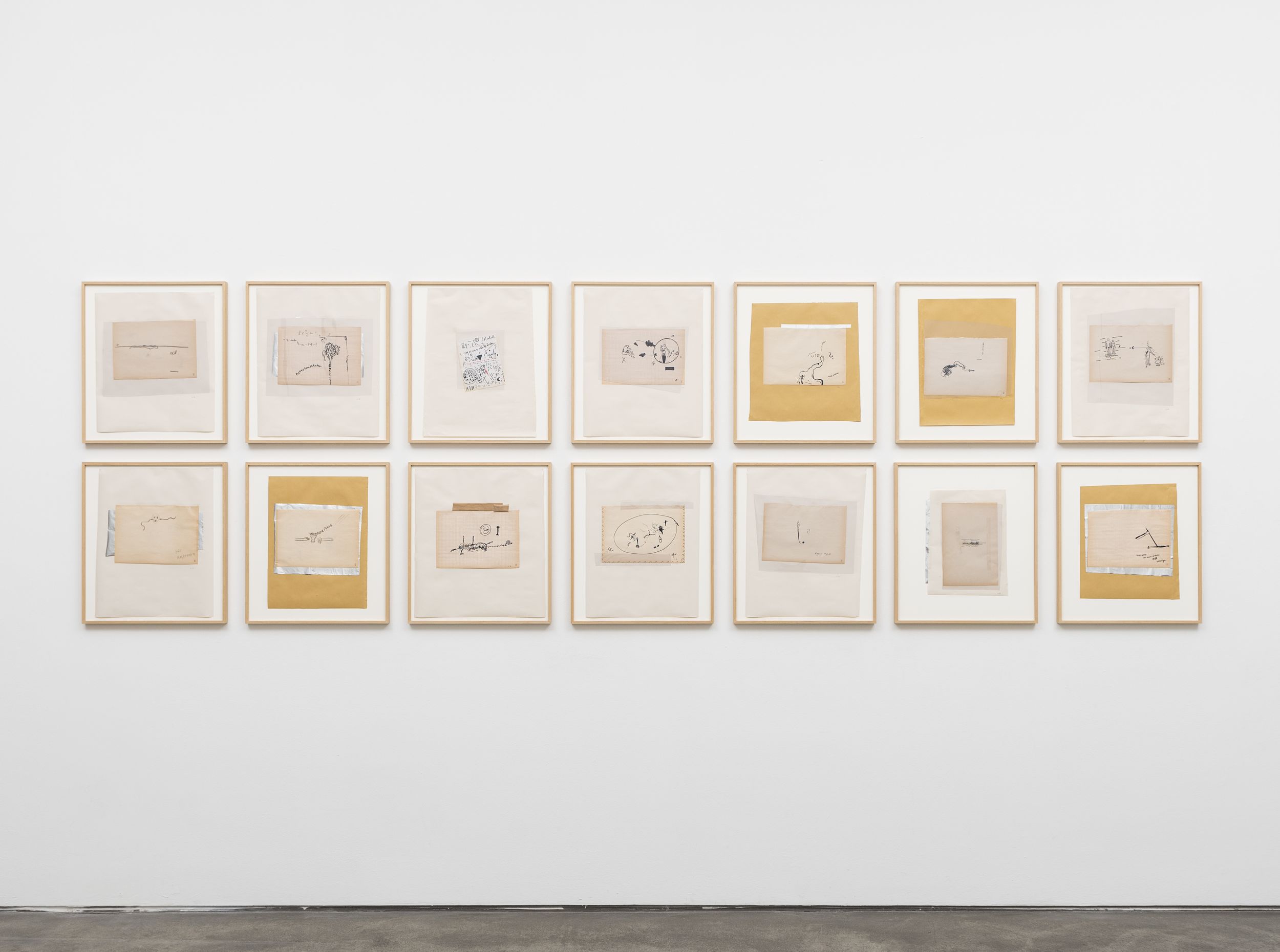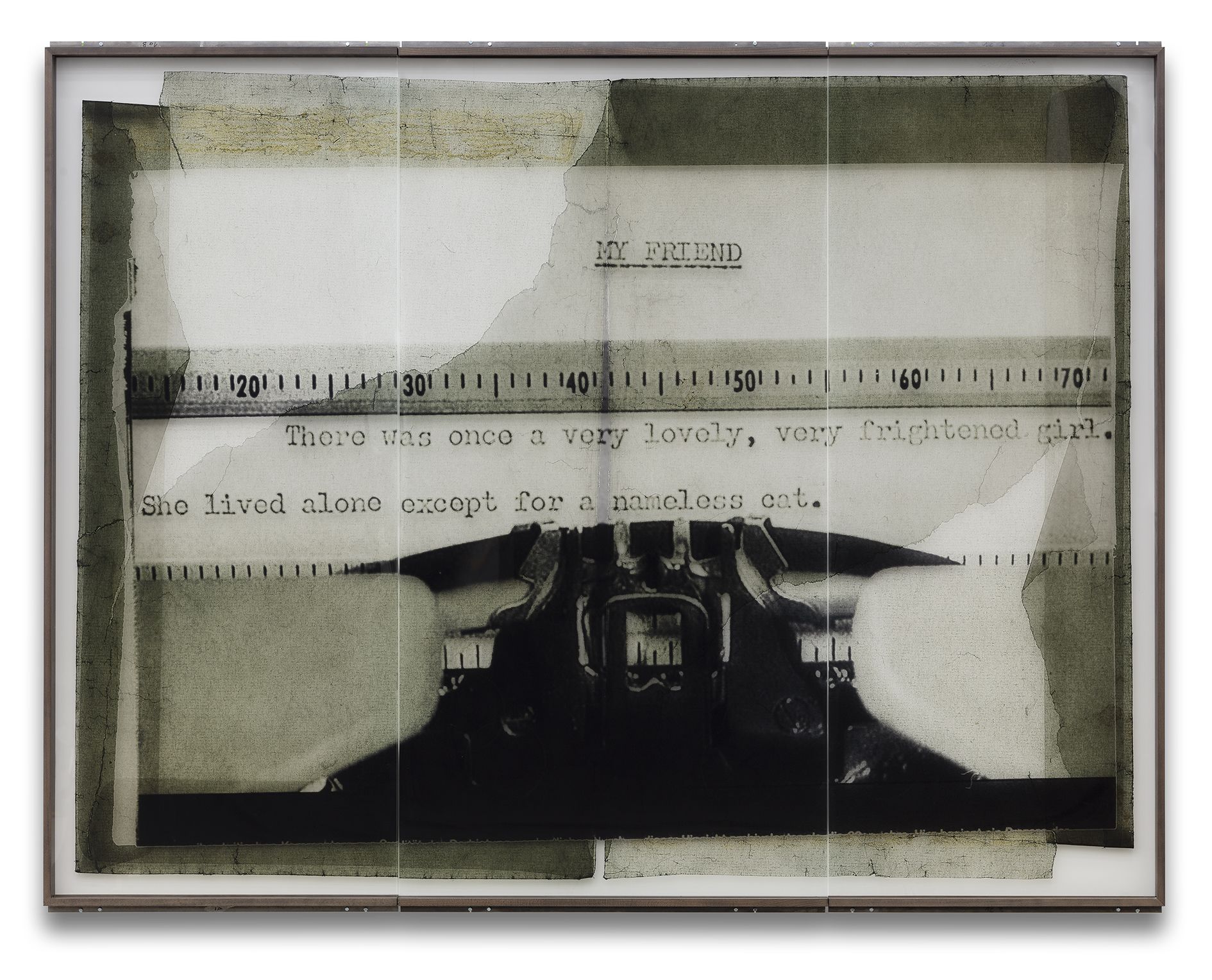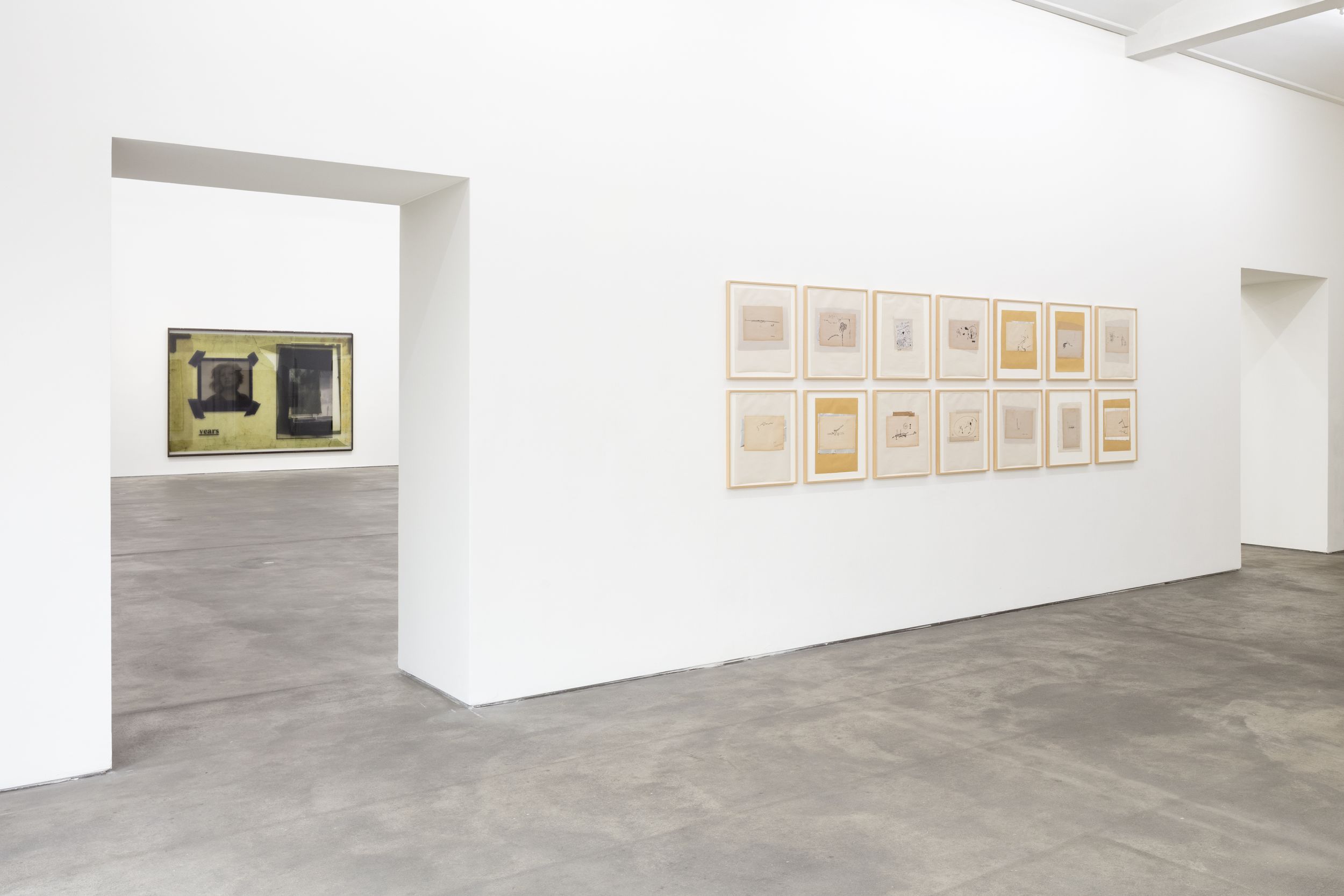 The artist’s current exhibition at Sprüth Magers centres on a presentation of the CUTs (1986/1996) group of works. These collage pieces were first shown in 2018 as part of Klein’s major retrospective at the Falckenberg Collection in Deichtorhallen Hamburg-Harburg. Astrid Klein was one of the first artists to work with large-format transparent film; placing photographic and text elements in dialogue with one another in her typically rhetorical style. Her imagery derives first and foremost from an inventory of pictures that recalls a collective visual memory. By intervening in the existing pictorial material, changing and rearranging it, the artist addresses both regimes of the gaze and visual structures as well as specific mechanisms of representation. In contrast to her famous collages of the 1970s, the CUTs also place a certain amount of importance on the images’ spatial dimension. Astrid Klein uses transparent film as the support material for her collages, the translucent surface texture of which allows traces of the artistic working process to become visible. Still, the synthesis of light and material reveals more than just how the works are put together; it also appears to dissolve the two-dimensional character of the images, giving them more of a sculptural character. The size of the works also makes it possible for the viewer to see the collages from different perspectives depending on where they are standing.
