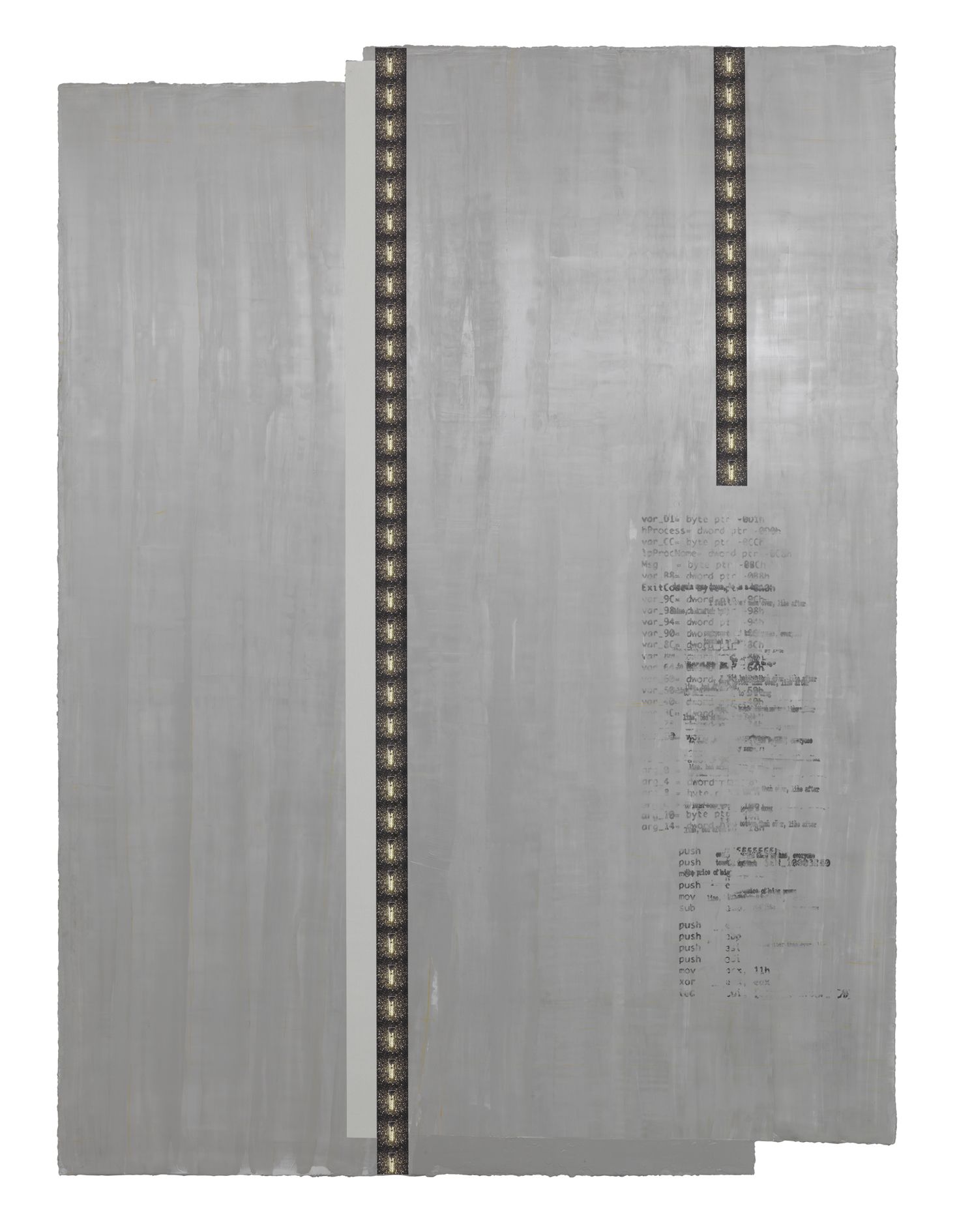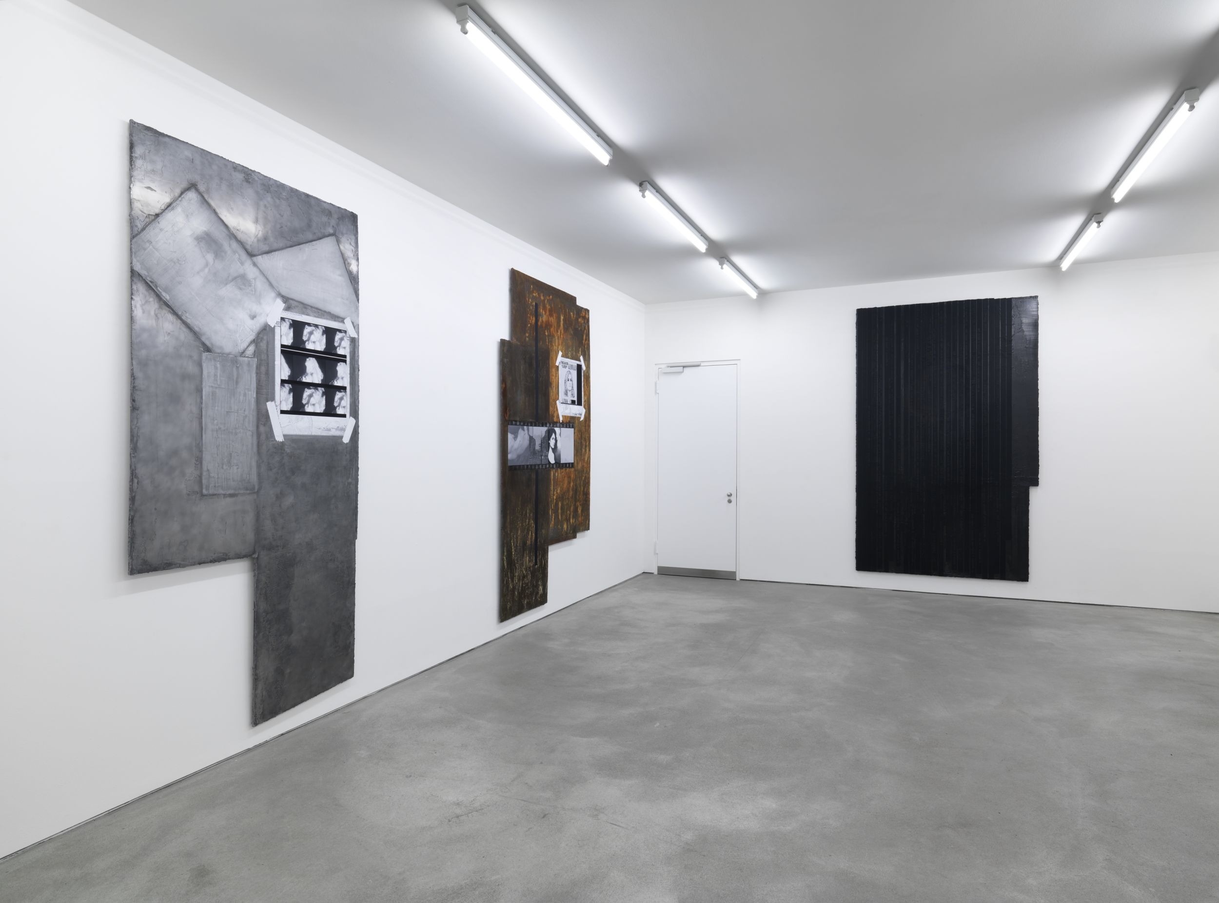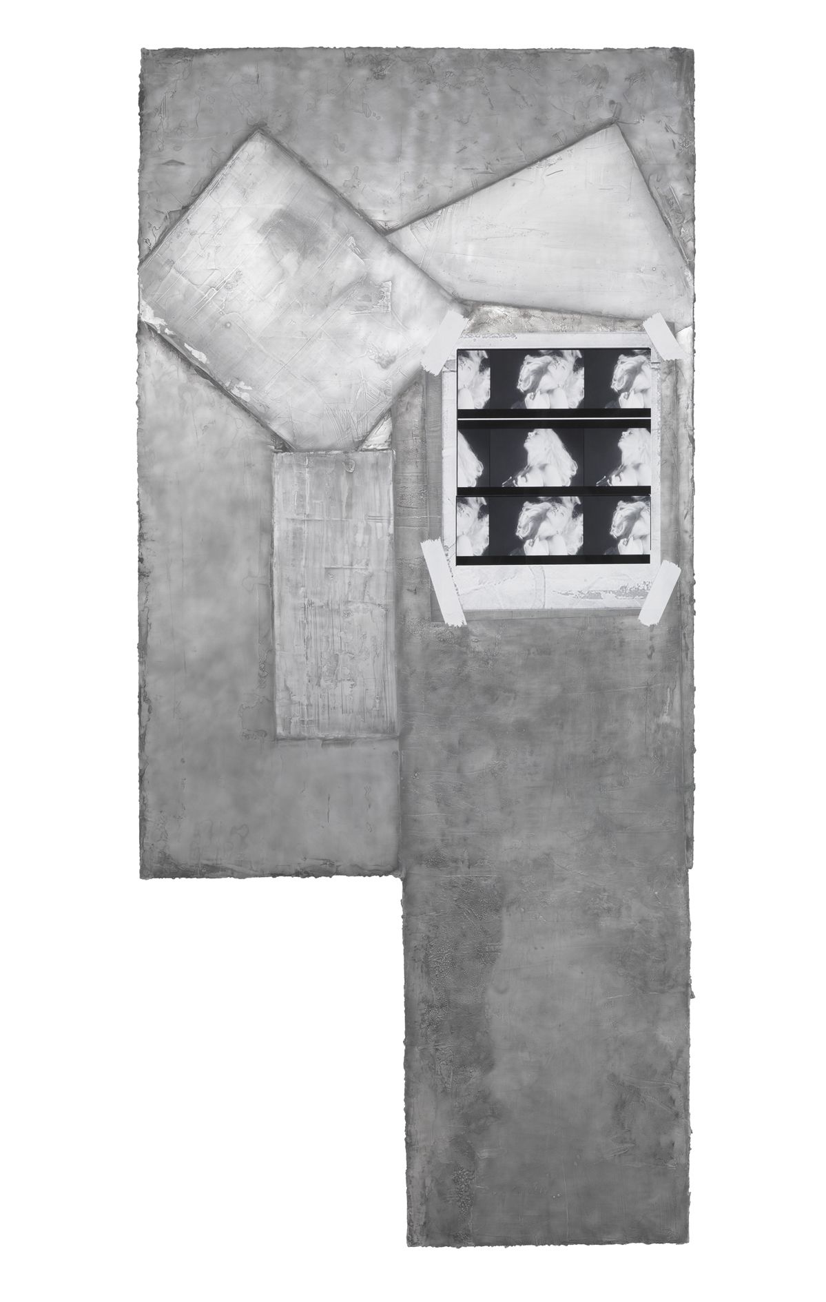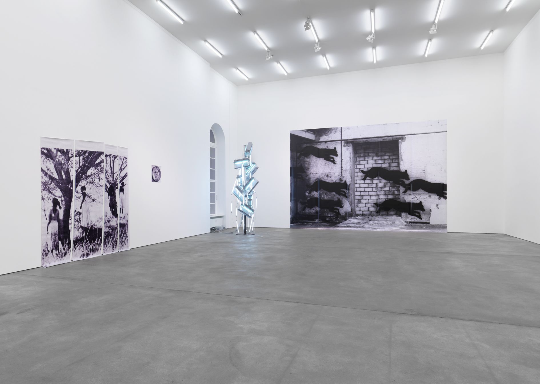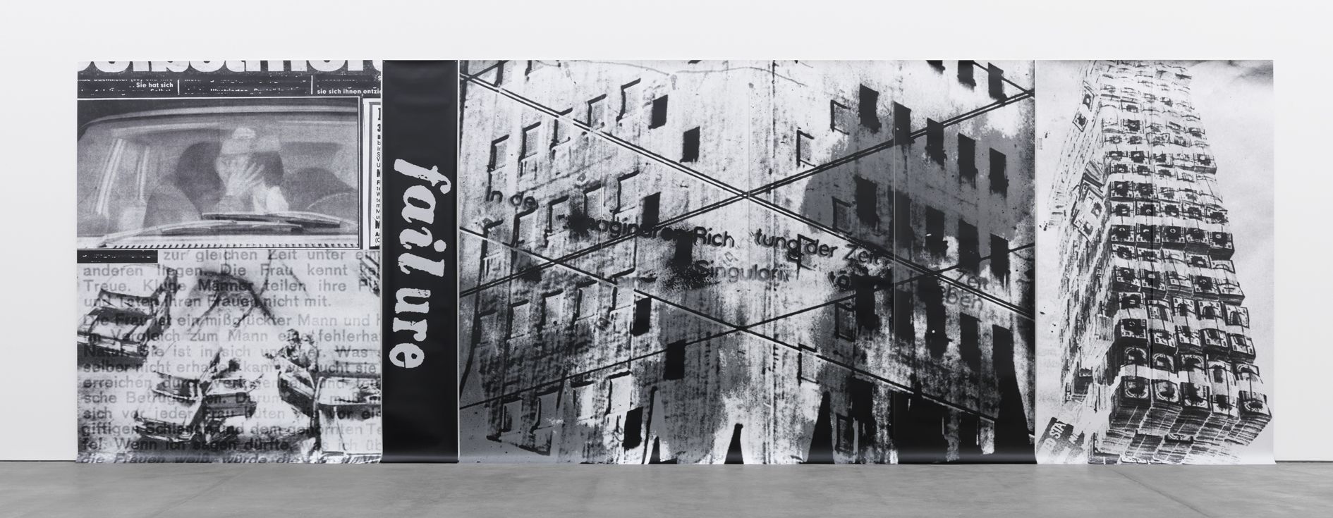 Since the 1970’s, Astrid Klein has been at the forefront of artistic developments regarding the handling of a diverse range of media and the utilisation of a variety of complex techniques, centred around an on-going investigation into the confrontational relationship between image and text. Through painting, collage, photography and installation, Klein encodes, reduces, and reproduces individual figures and fragments out of extensive textual and pictorial material, creating images which relate to themes such as religion, social role models and power structures in society. The artist’s textual sources, in addition to her own texts, reflect a preoccupation with literary, philosophical and scientific writings, and are incorporated in the ‘Schriftbilder’ (script image) in a way that the form and visual appearance of the text plays as important a role as its content, if not more so. Klein’s compositions are unique in their exploration of a highly original aesthetic, based on the reduction of colour to black and white, and references to popular mass media imagery, symptomatic of post-modern art. Spanning over thirty years, Klein’s œuvre includes not only collage, but paintings such as the ‘white paintings’ (1988 – 1993), carpet and filmic works (Installation at the Hamburger Bahnhof, Berlin, 1999/2000) neon sculptures and light installations, through which the artist pushes the boundaries of visibility and the idea of rendering the invisible visible and presenting the unpresentable.