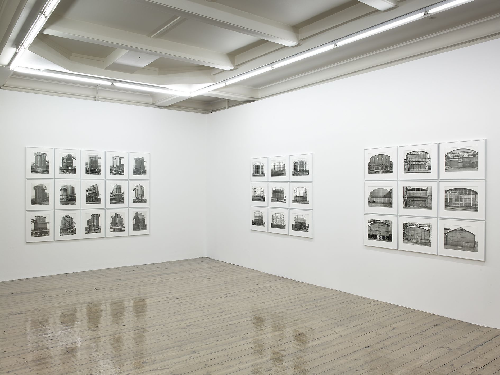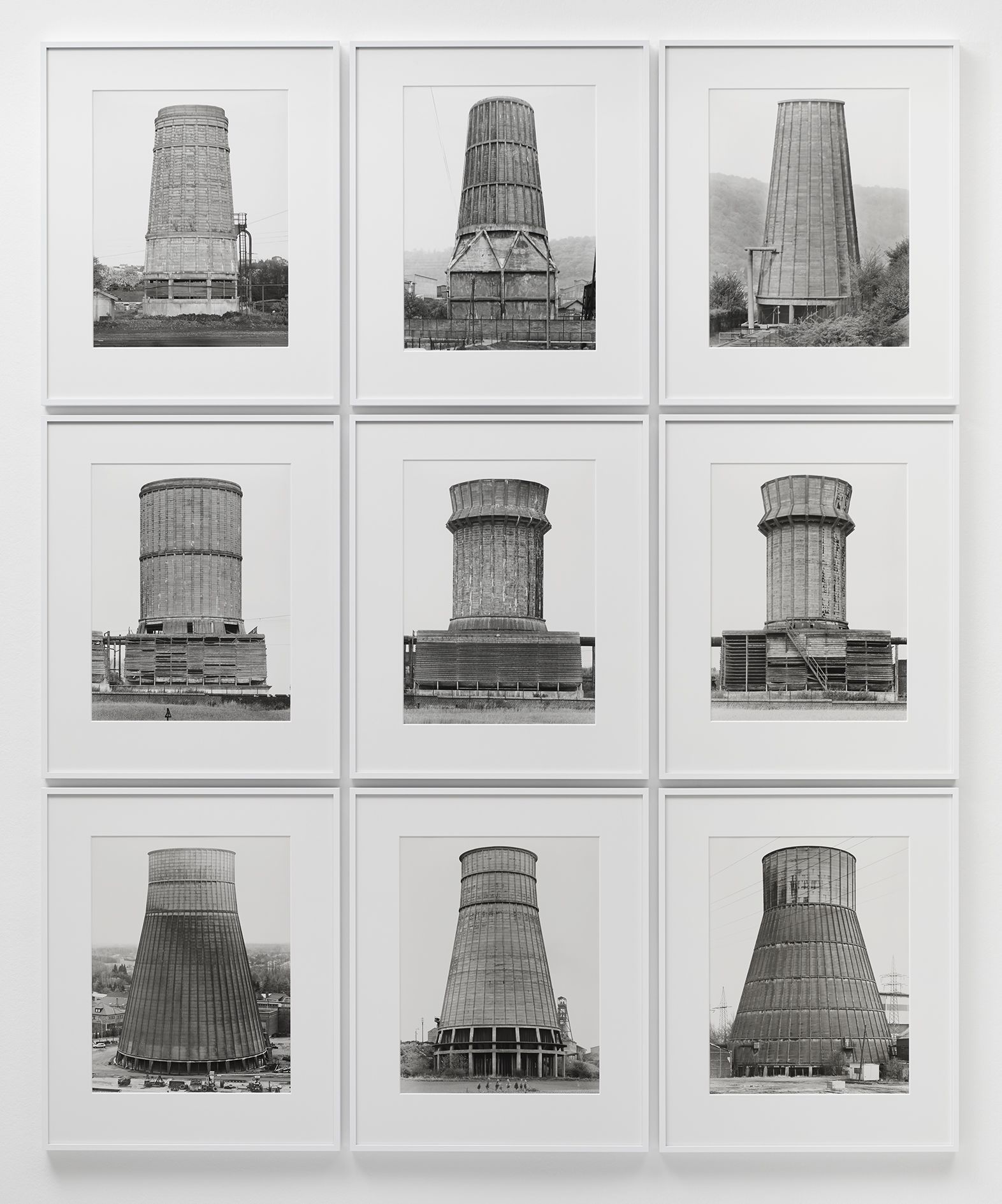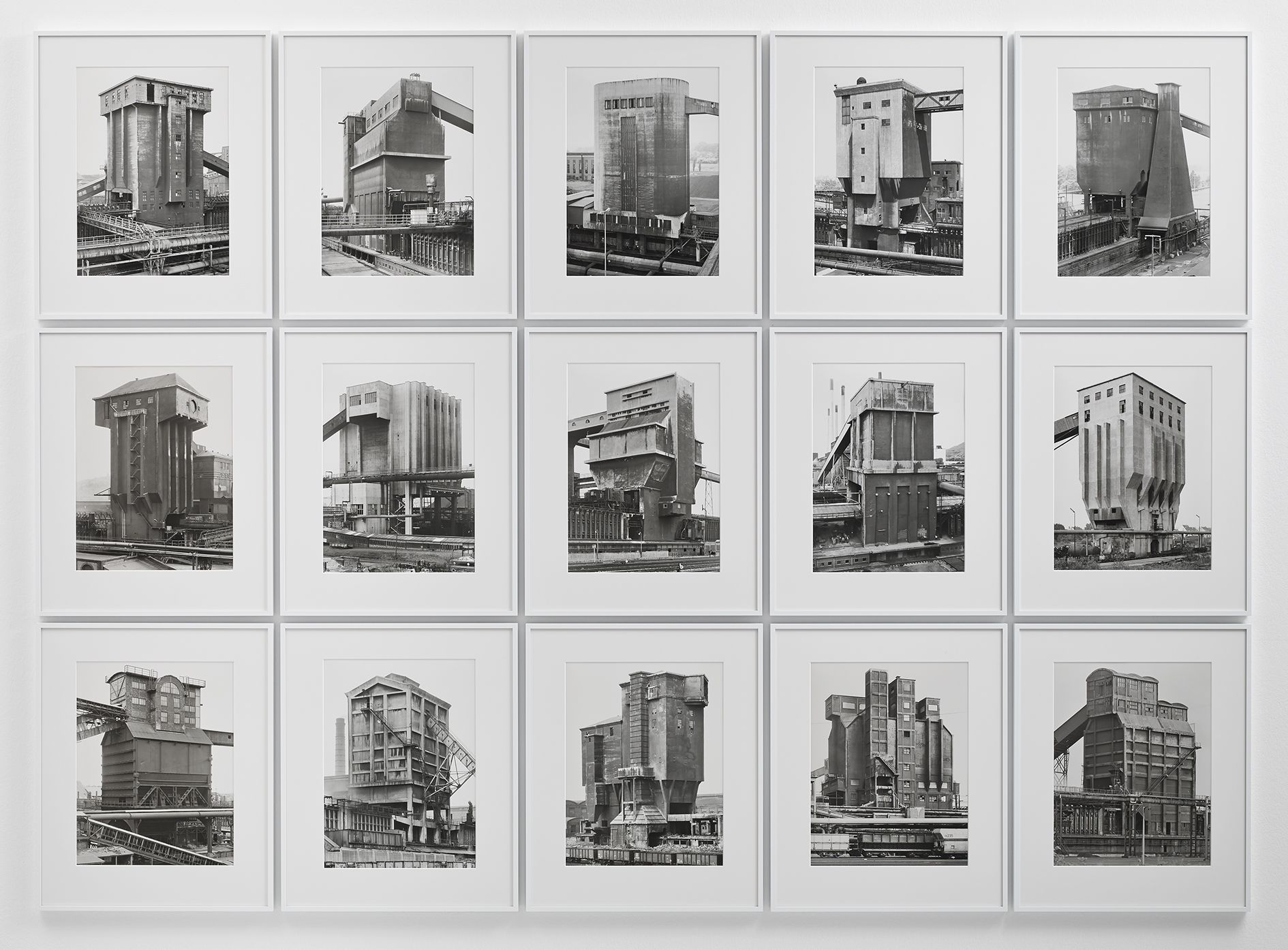 Bernd and Hilla Becher met in 1959 and first exhibited together in 1963. The typologies for which they are now well known grew out of their expansive, impartial approach when they first started taking photographs of commonplace industrial buildings in post-War Germany and across Western Europe. After collating thousands of pictures of individual structures, they noticed that the various edifices – of cooling towers, gas tanks and coalbunkers, for instance – shared many distinctive formal qualities. Systematically photographing each structure from both a frontal and a three-quarter perspective, they examined them the way a biologist might look at a specimen collected during fieldwork, comparing and contrasting to organise them into groups, or species. Presented in grids, the typologies reveal the many forms that the buildings share, while at the same time each picture within the grid describes the unique details of each particular structure. The rigour and clarity of the Bechers’ methodology has influenced a generation of photographers and conceptual artists.