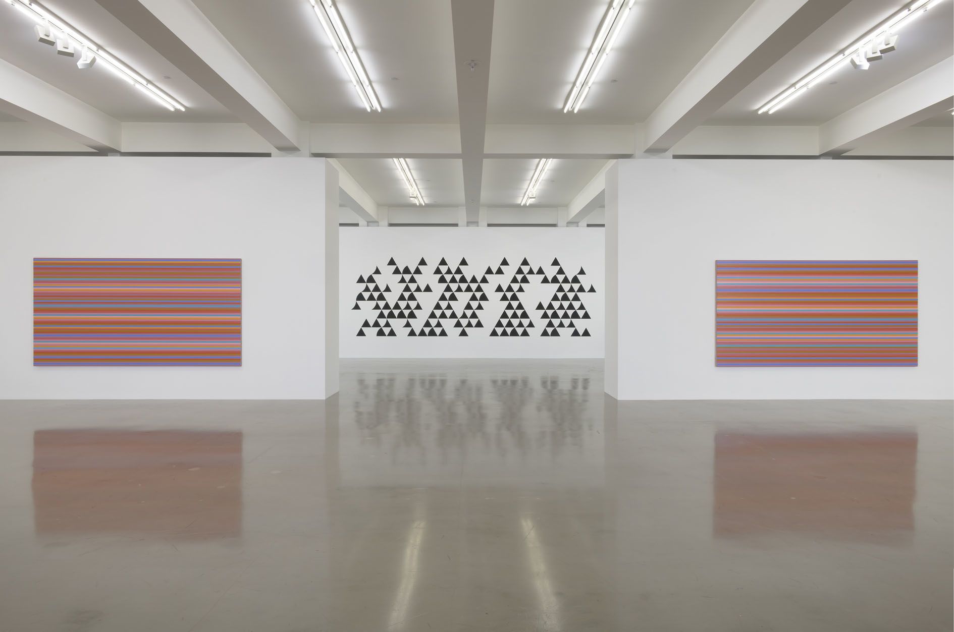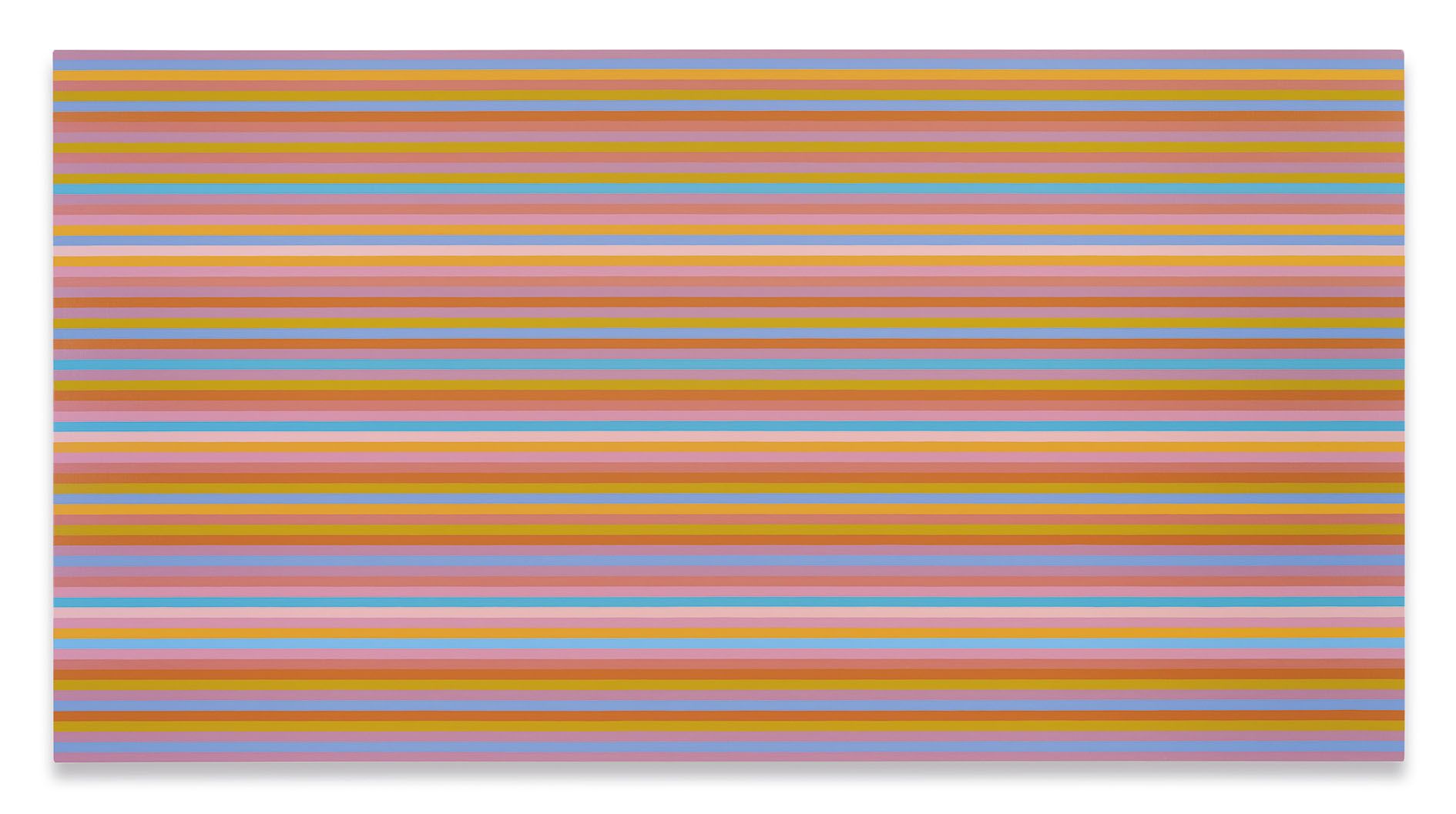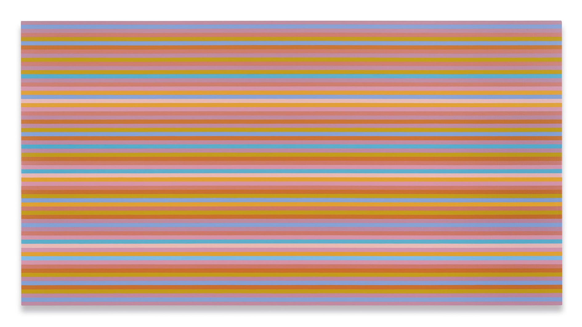 Throughout the 1960s, Riley’s canvases expanded in scale and palette, leading to the monumental scope and flickering visual effects of stripe paintings such as Late Morning 1 (1967). The stripe motif has remained an enduring feature of her practice, as evidenced by a recent triad of canvases, Memories of Horizons 1–3 (2014), whose bands of bright, rotating colors illustrate how the artist’s sustained attention to particular aesthetic combinations produces delicate atmospheric shifts from one painting to the next.