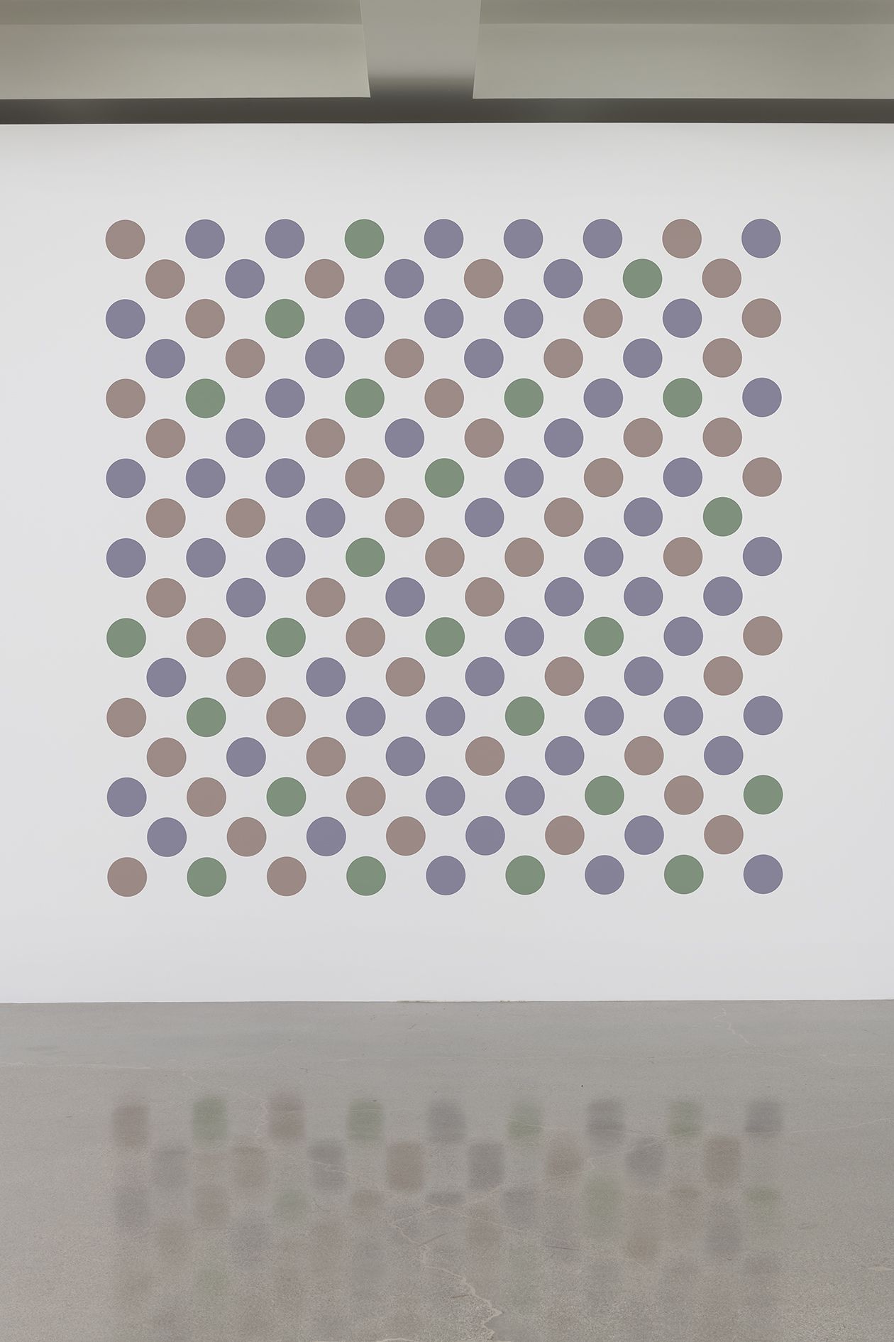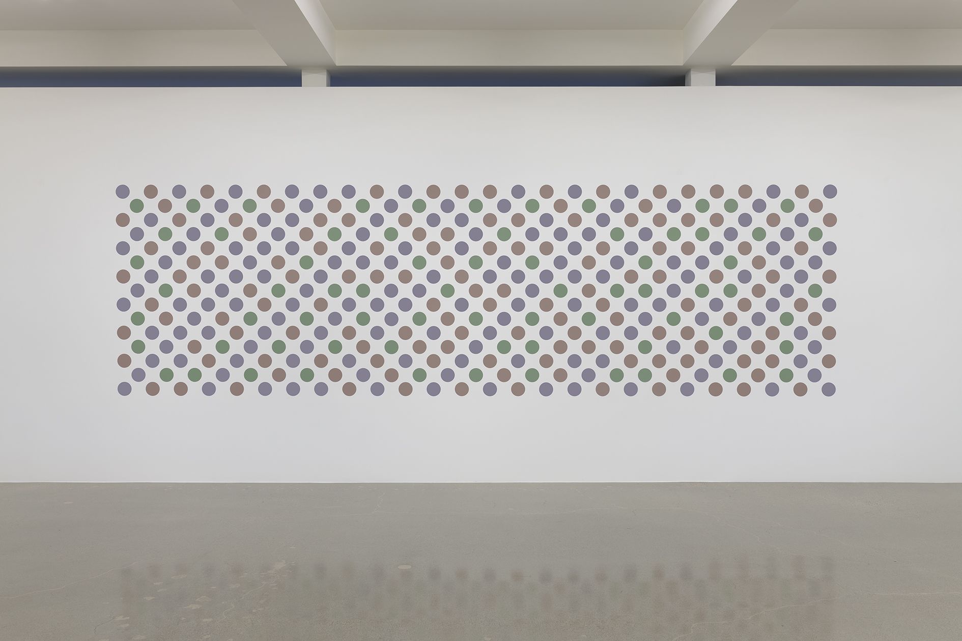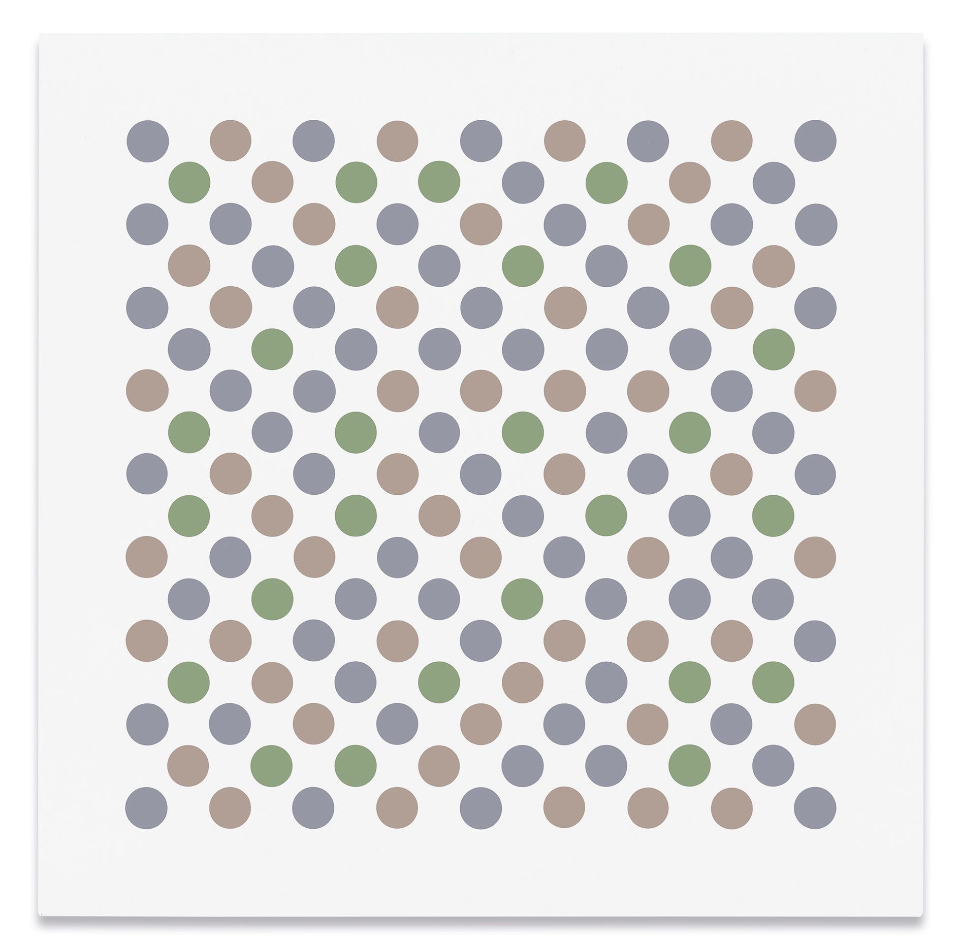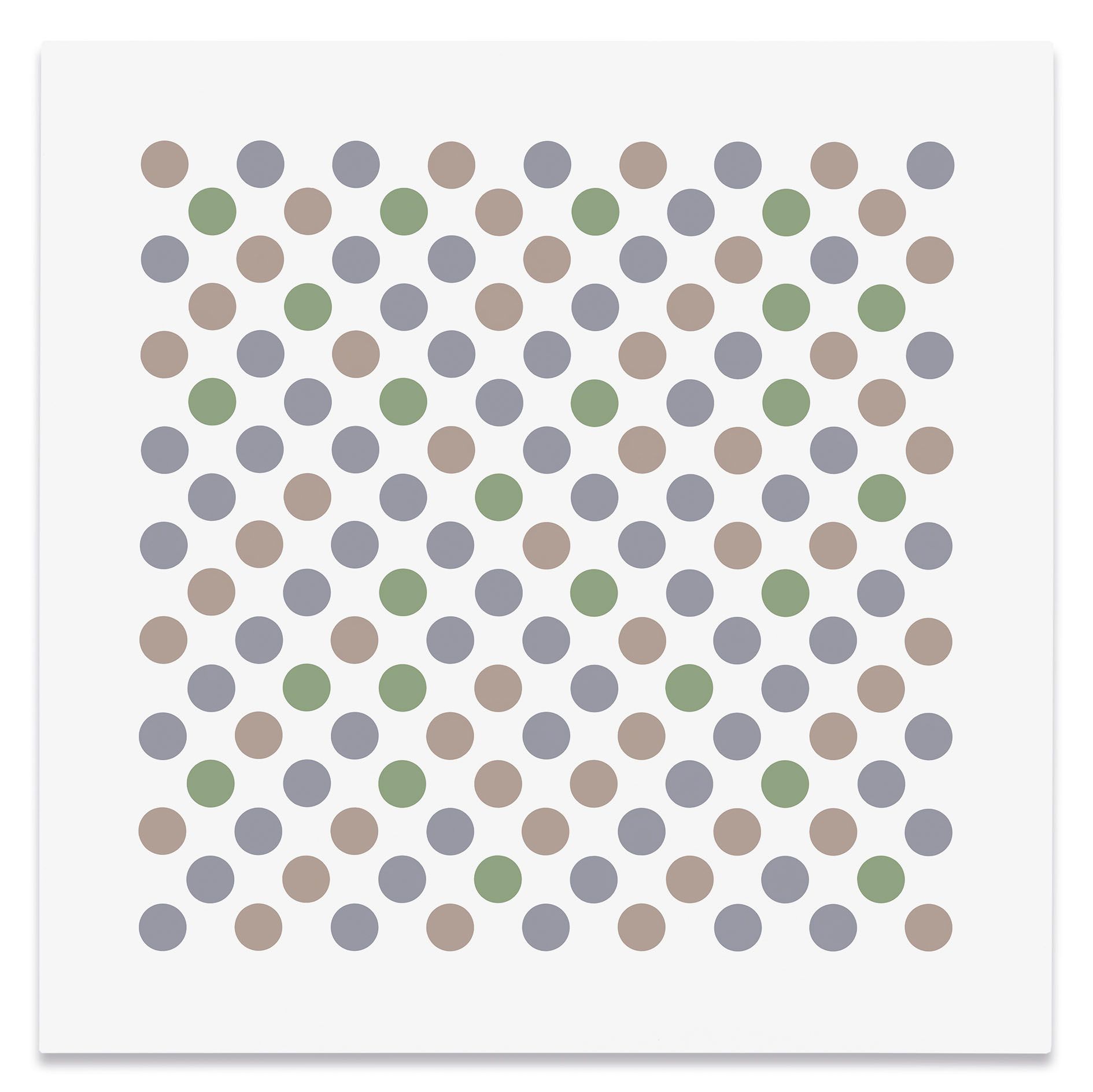 The artist's recent disc paintings and wall paintings from Measure for Measure and other series extend this line of inquiry into the present, with a palette of orange, lavender and green that links full circle back to the artist's early landscapes. Throughout her paintings, Riley places specific colors one next to the other so as to question how we observe chromatic relationships in different contexts.