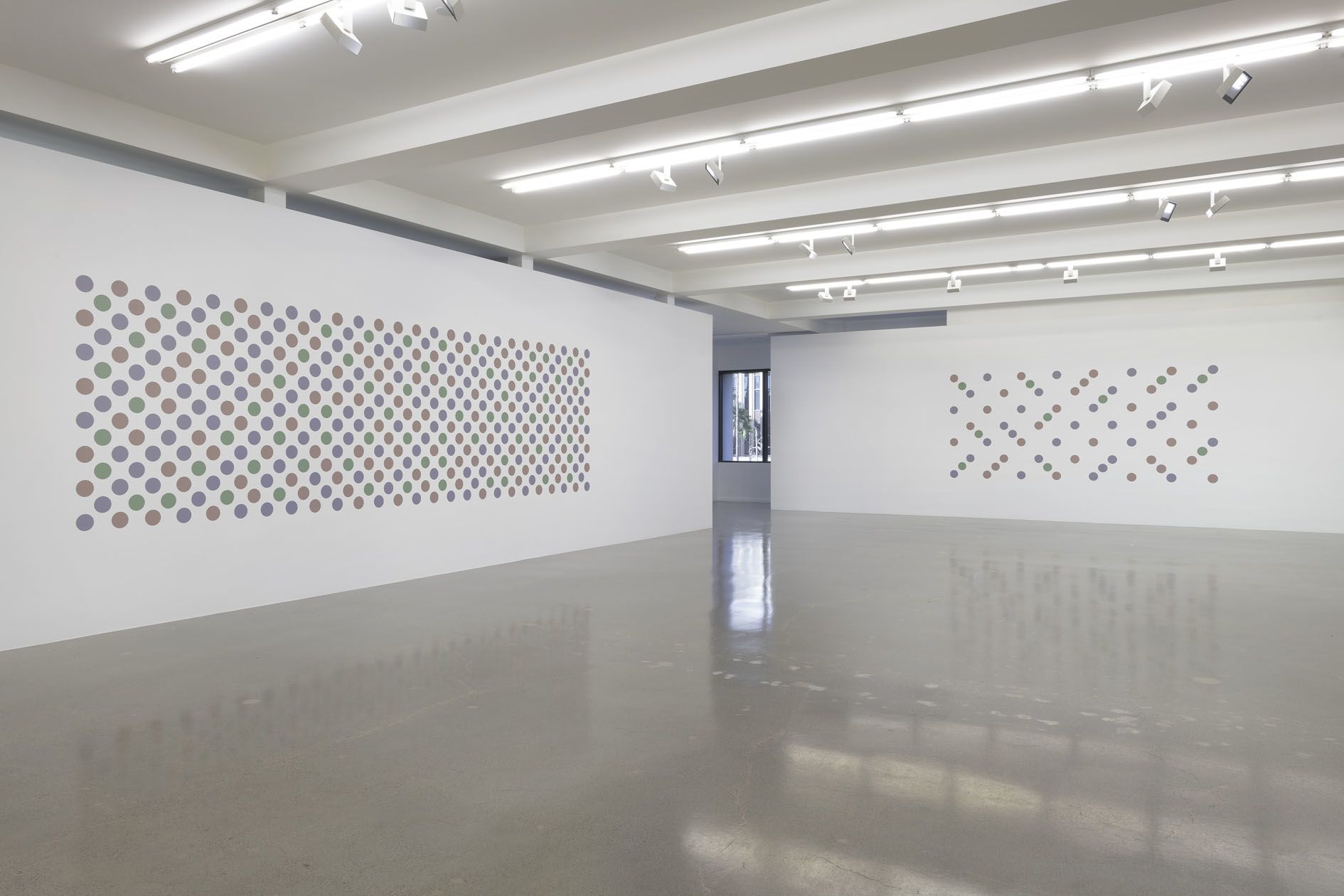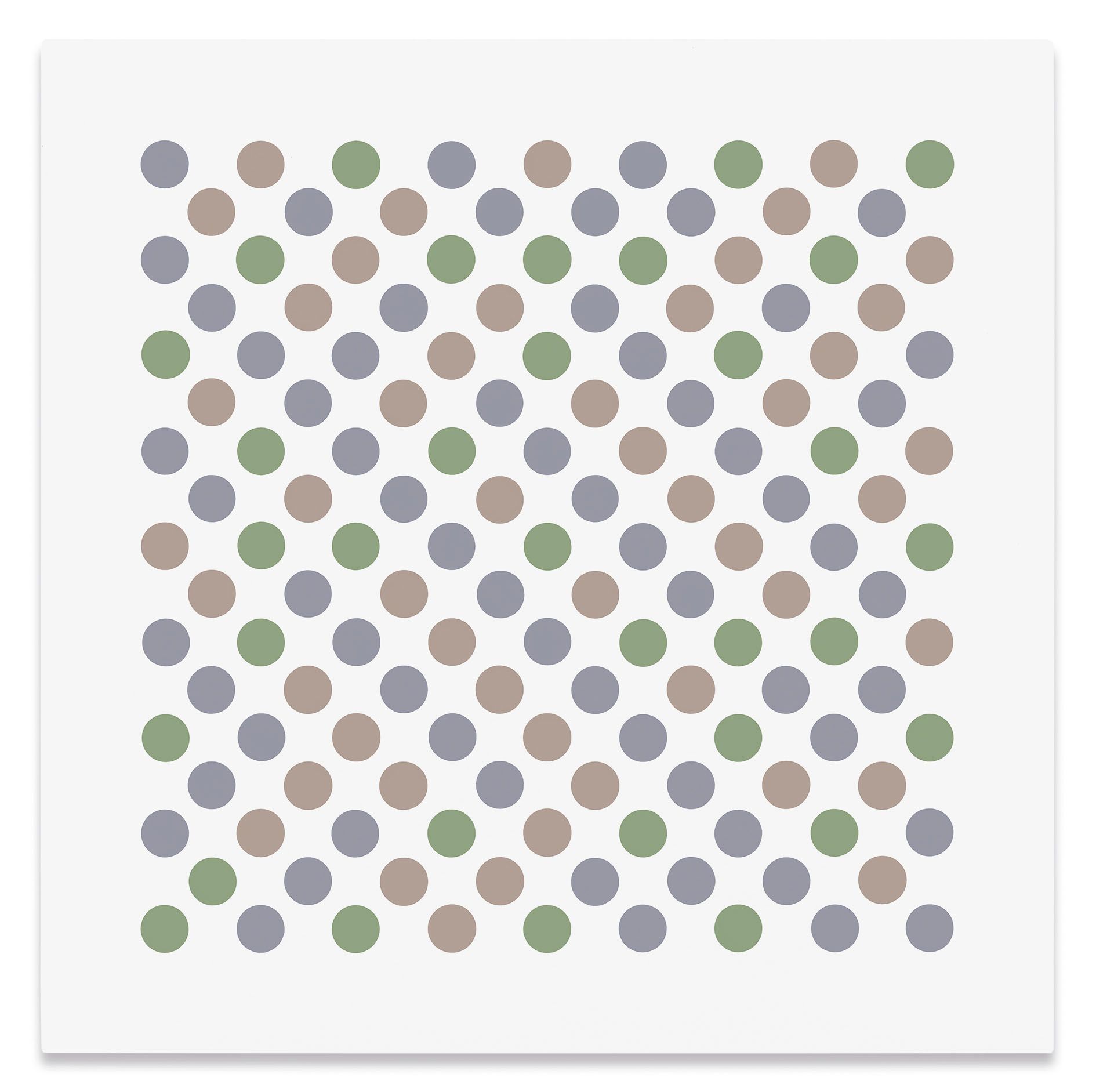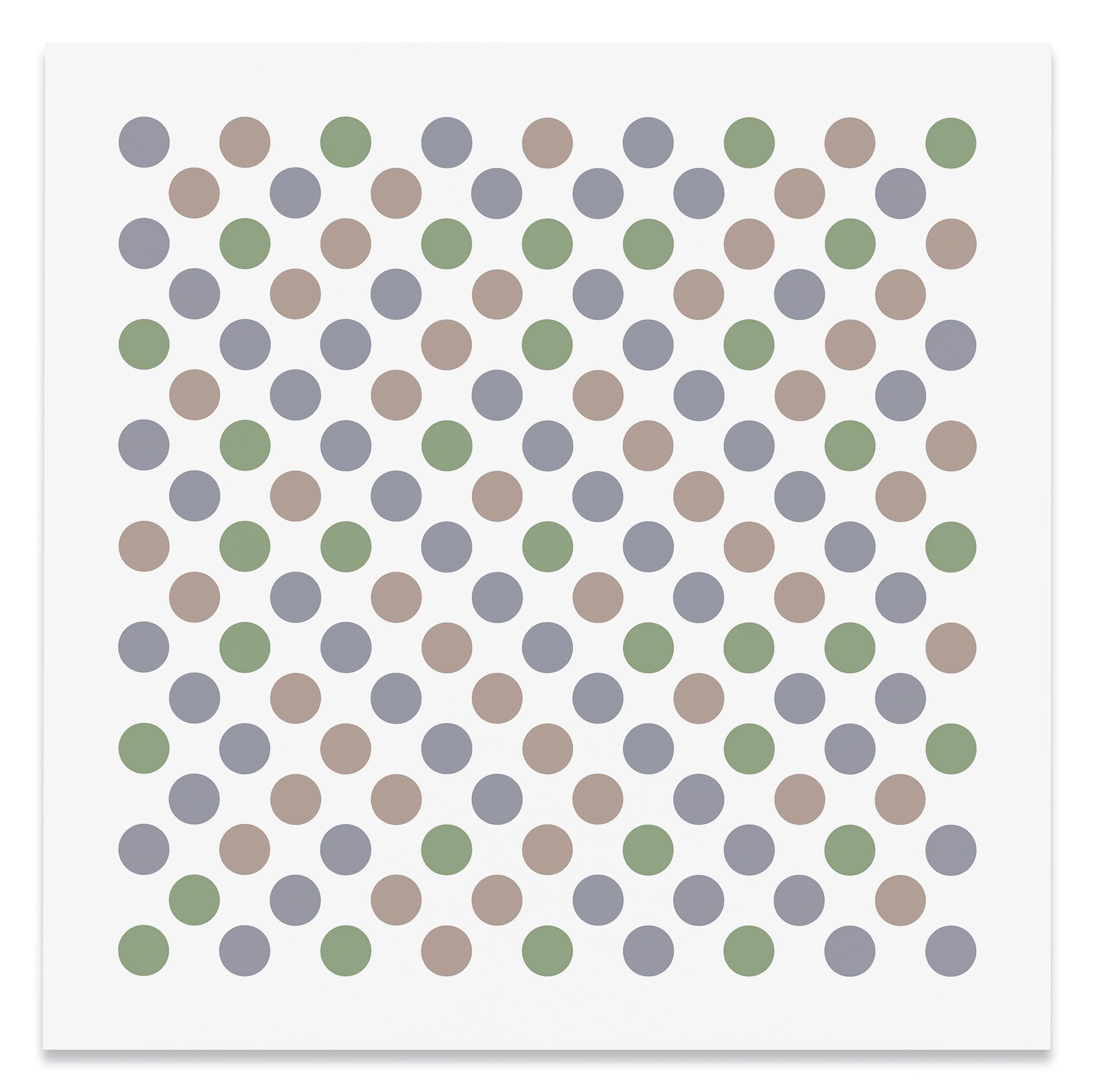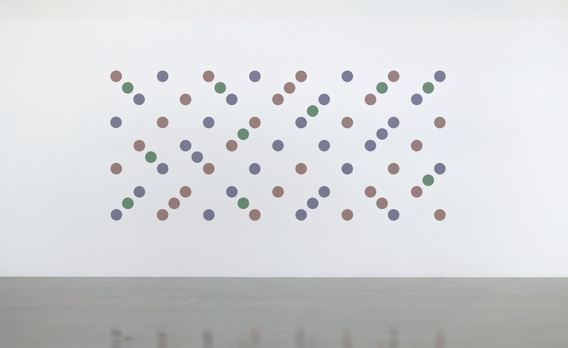 The artist's recent disc paintings and wall paintings from Measure for Measure and other series extend this line of inquiry into the present, with a palette of orange, lavender and green that links full circle back to the artist's early landscapes. Throughout her paintings, Riley places specific colors one next to the other so as to question how we observe chromatic relationships in different contexts.