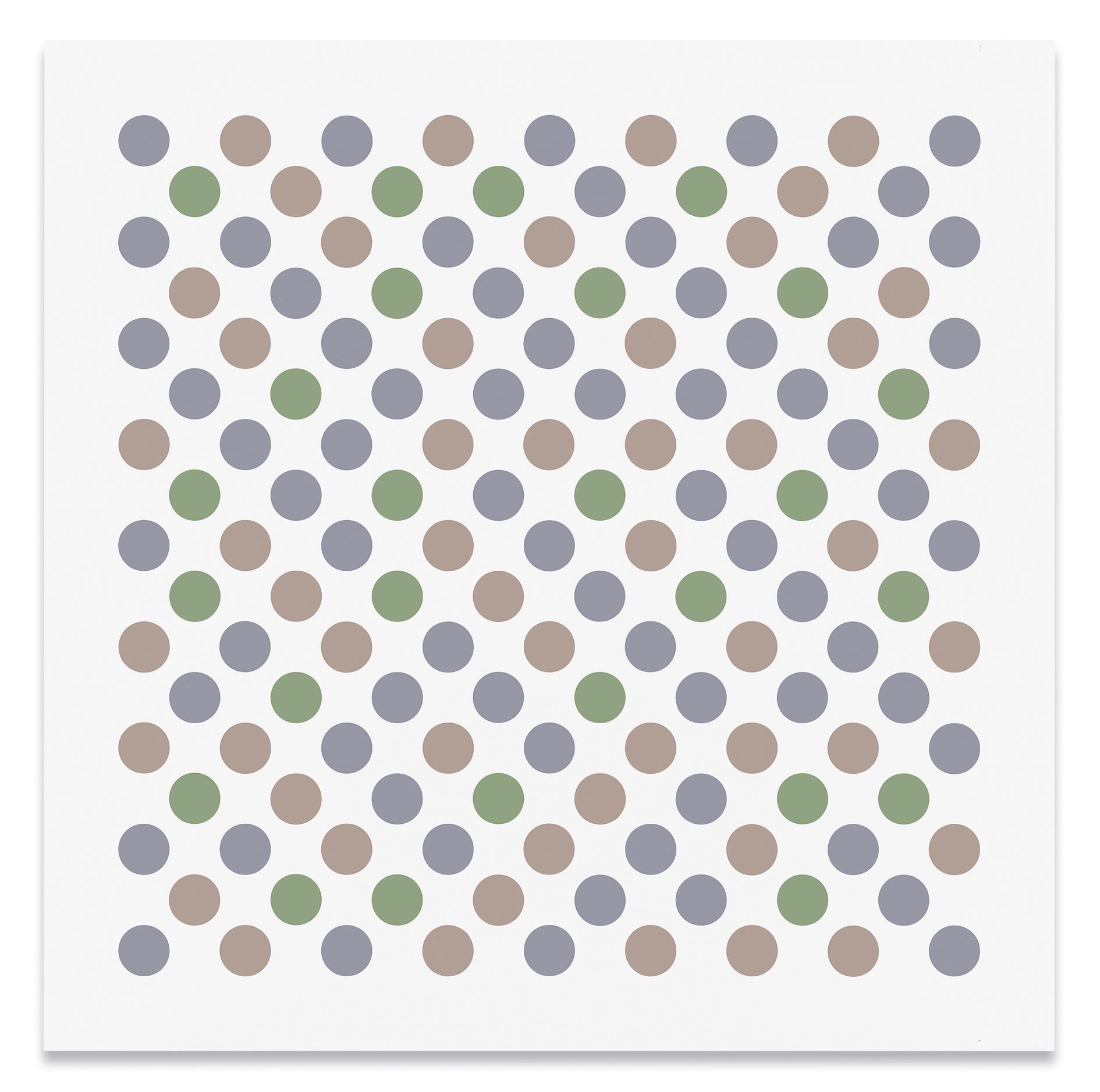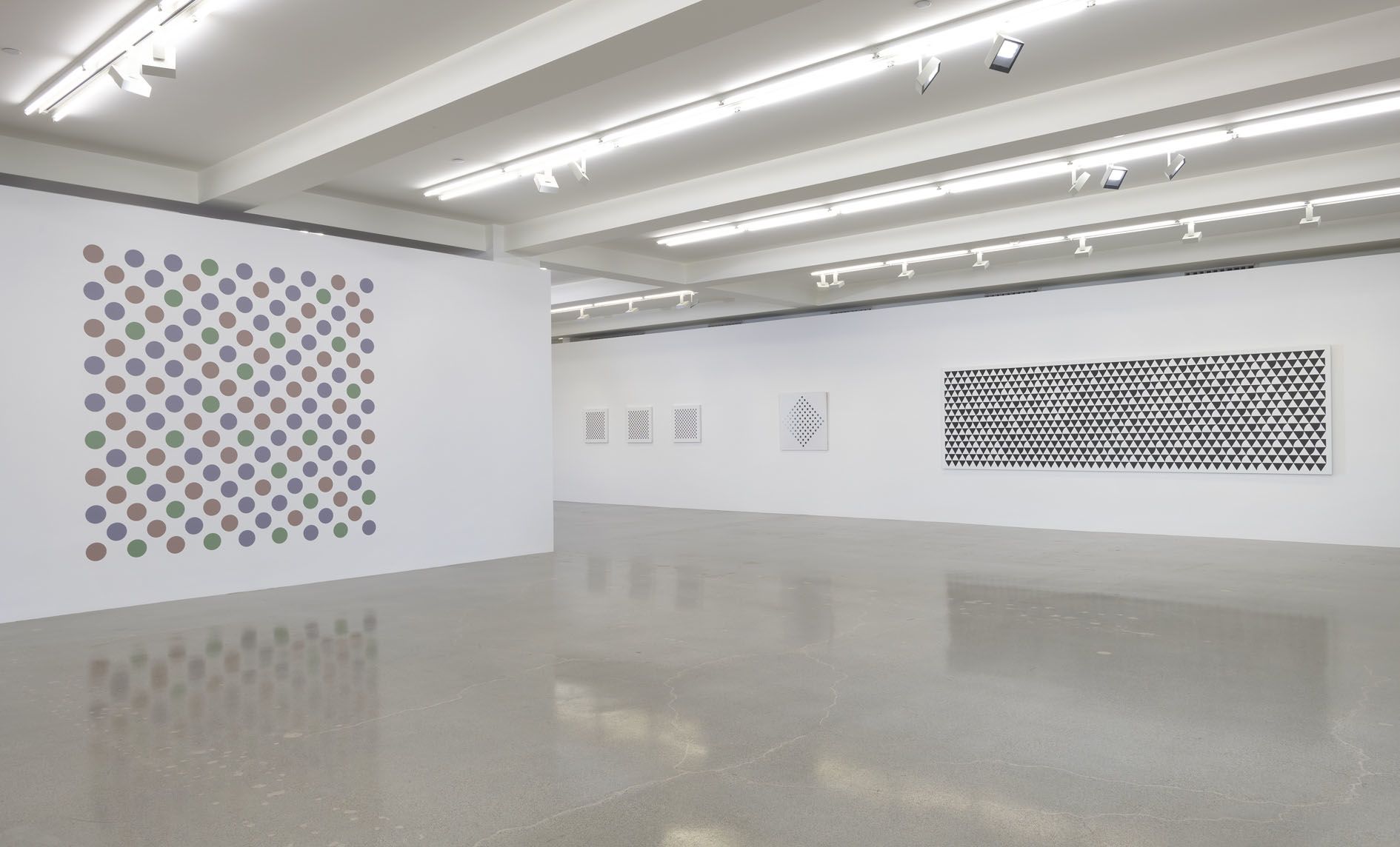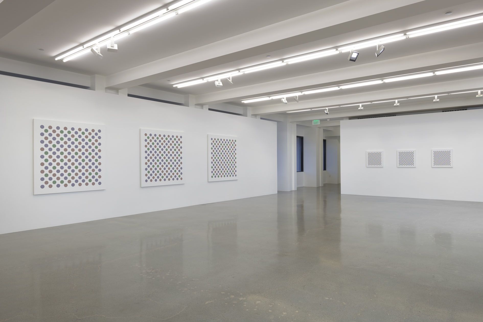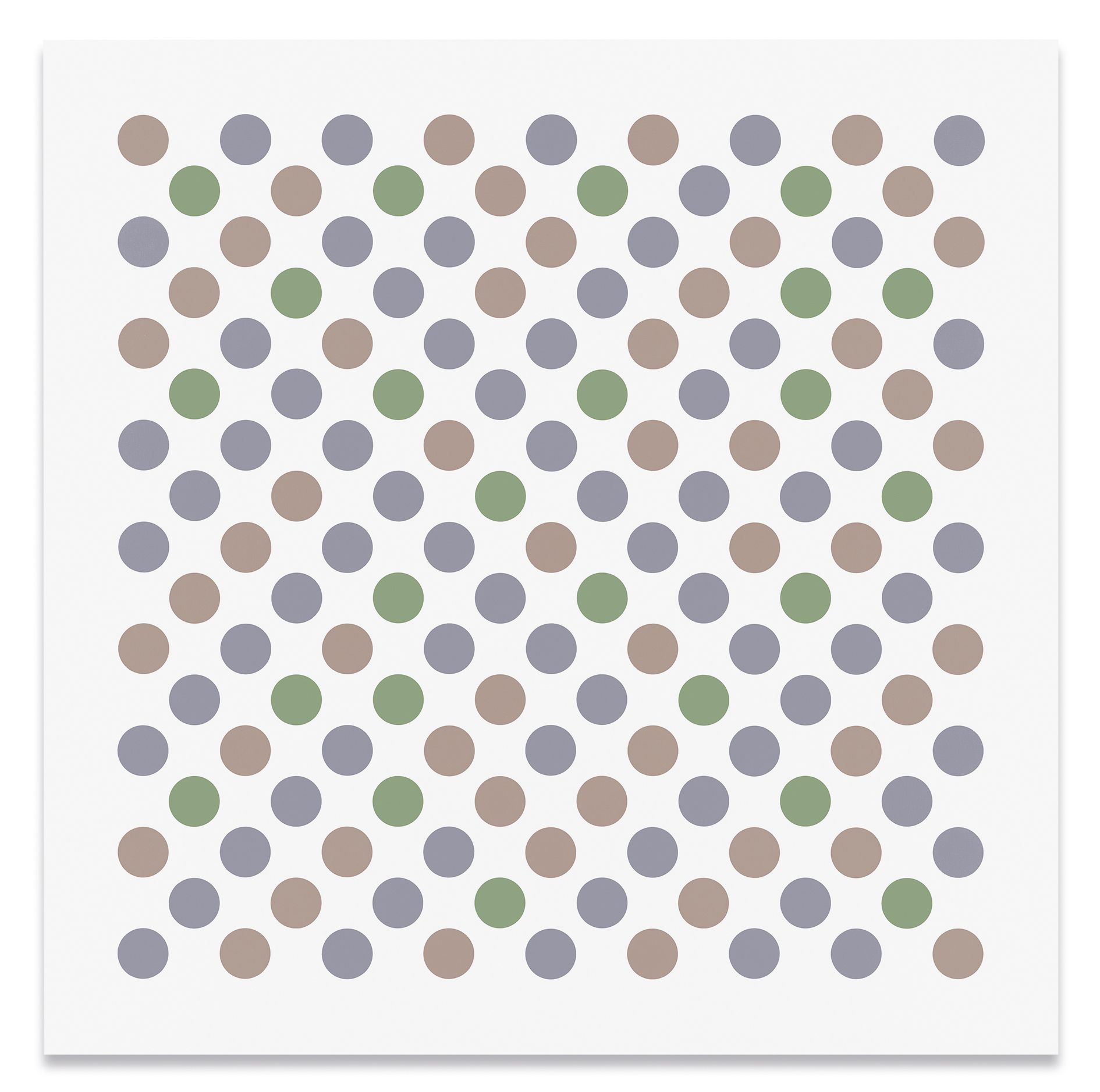 The artist's recent disc paintings and wall paintings from Measure for Measure and other series extend this line of inquiry into the present, with a palette of orange, lavender and green that links full circle back to the artist's early landscapes. Throughout her paintings, Riley places specific colors one next to the other so as to question how we observe chromatic relationships in different contexts.