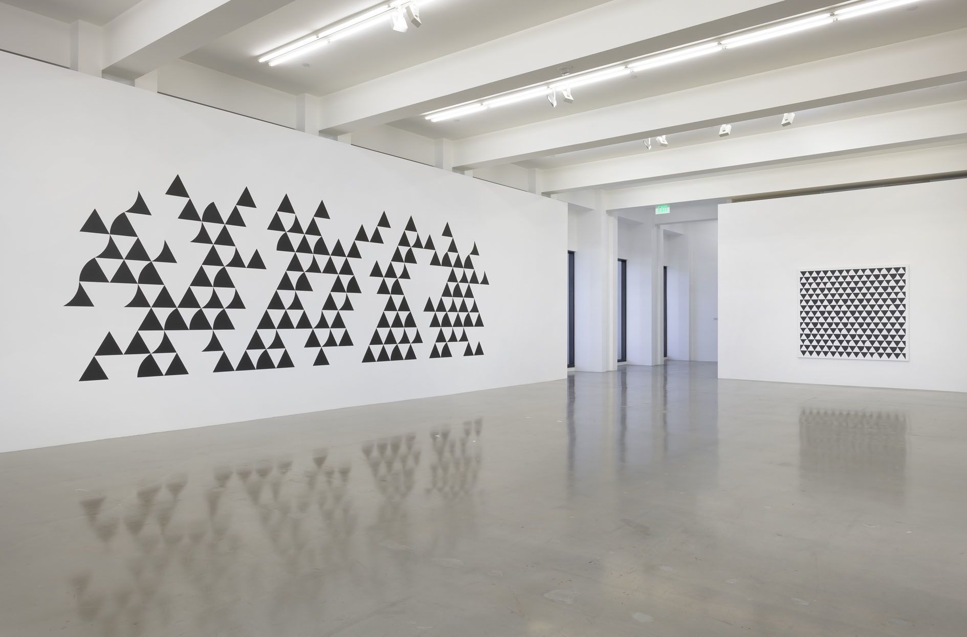 Presenting Riley’s work in Los Angeles provides a crucial opportunity to contextualize the artist’s practice within the parallel fields of light, space and perception that were so fundamental to artists working in Southern California in the same postwar moment as Riley, including Robert Irwin, James Turrell, Larry Bell, and fellow painter Mary Corse. The exhibition includes examples of early black-and-white paintings by Riley, such as the lyrical Horizontal Vibration (1961) and the undulating Descending (1965), which at the time linked her work to the so-called Op Art movement of the sixties, but are best understood as explorations into the gaps between visual phenomena, perception, and consciousness.